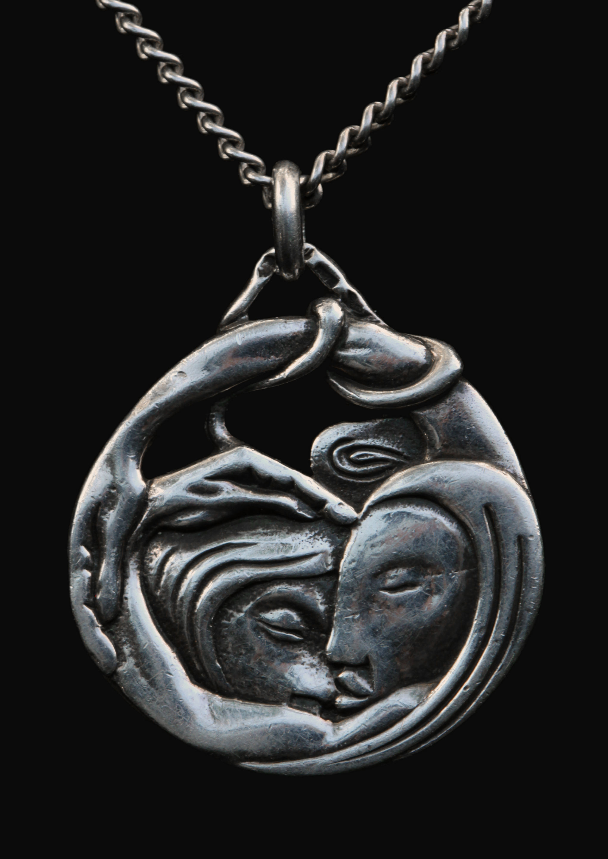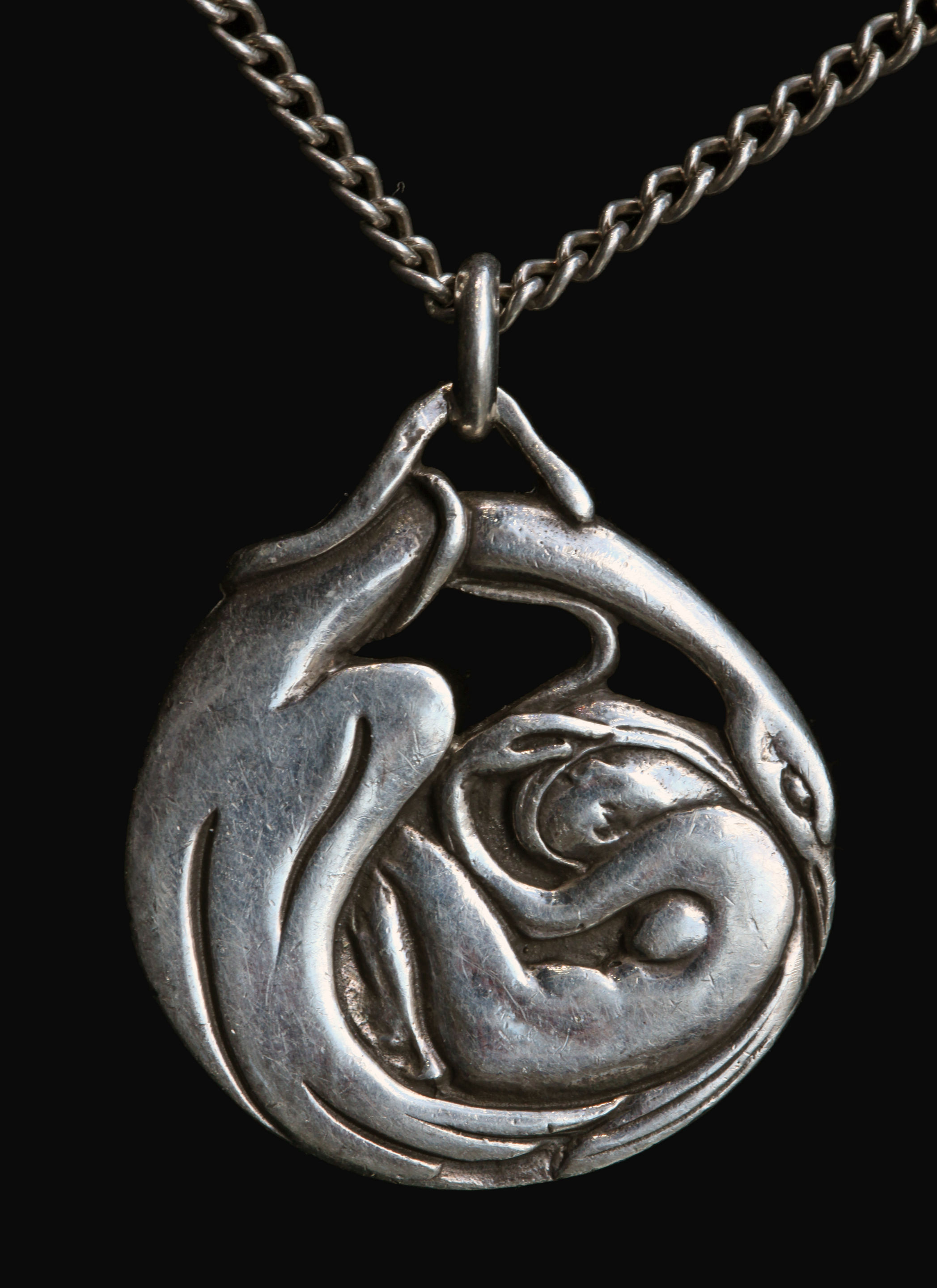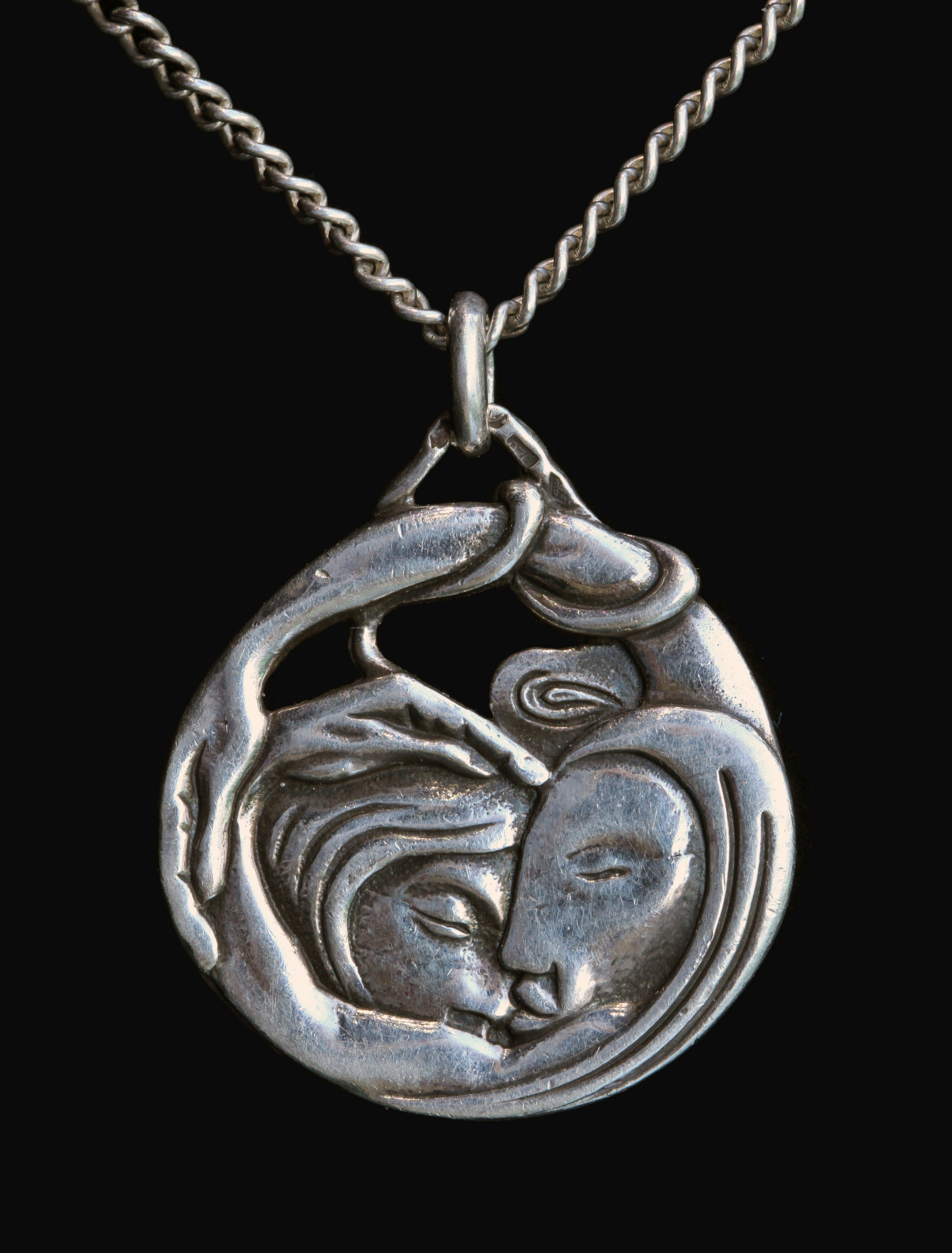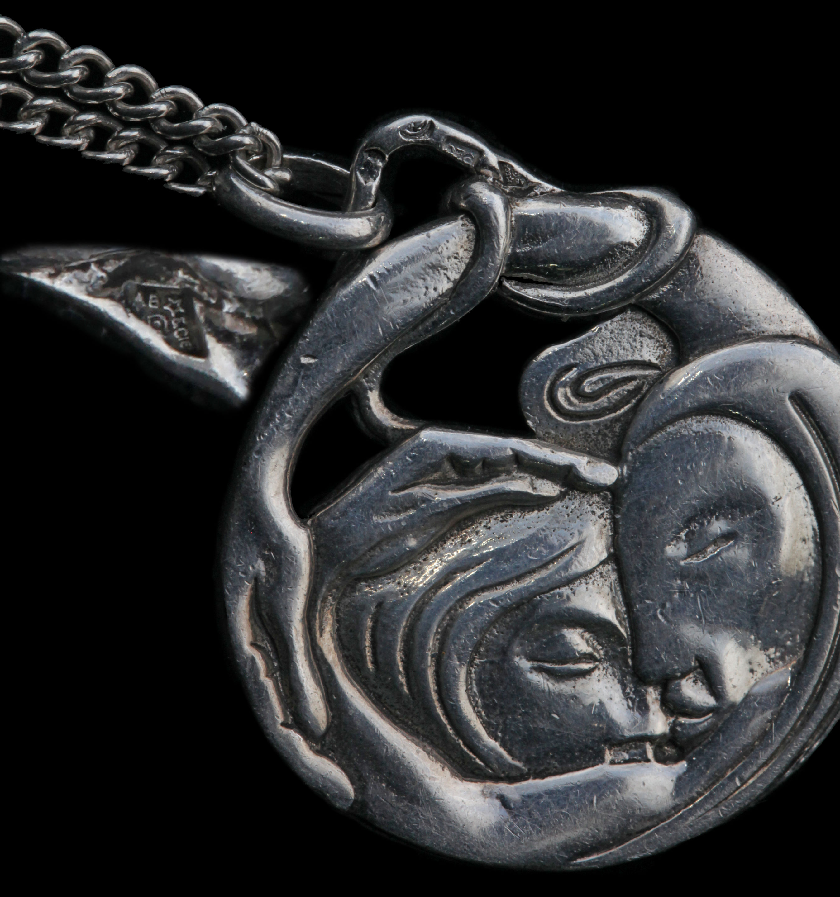 The sculptural front & back of this Paco Durrio pendant exhibit his amazing genius in combining the contrasting bas reliefs into one reversible jewel.