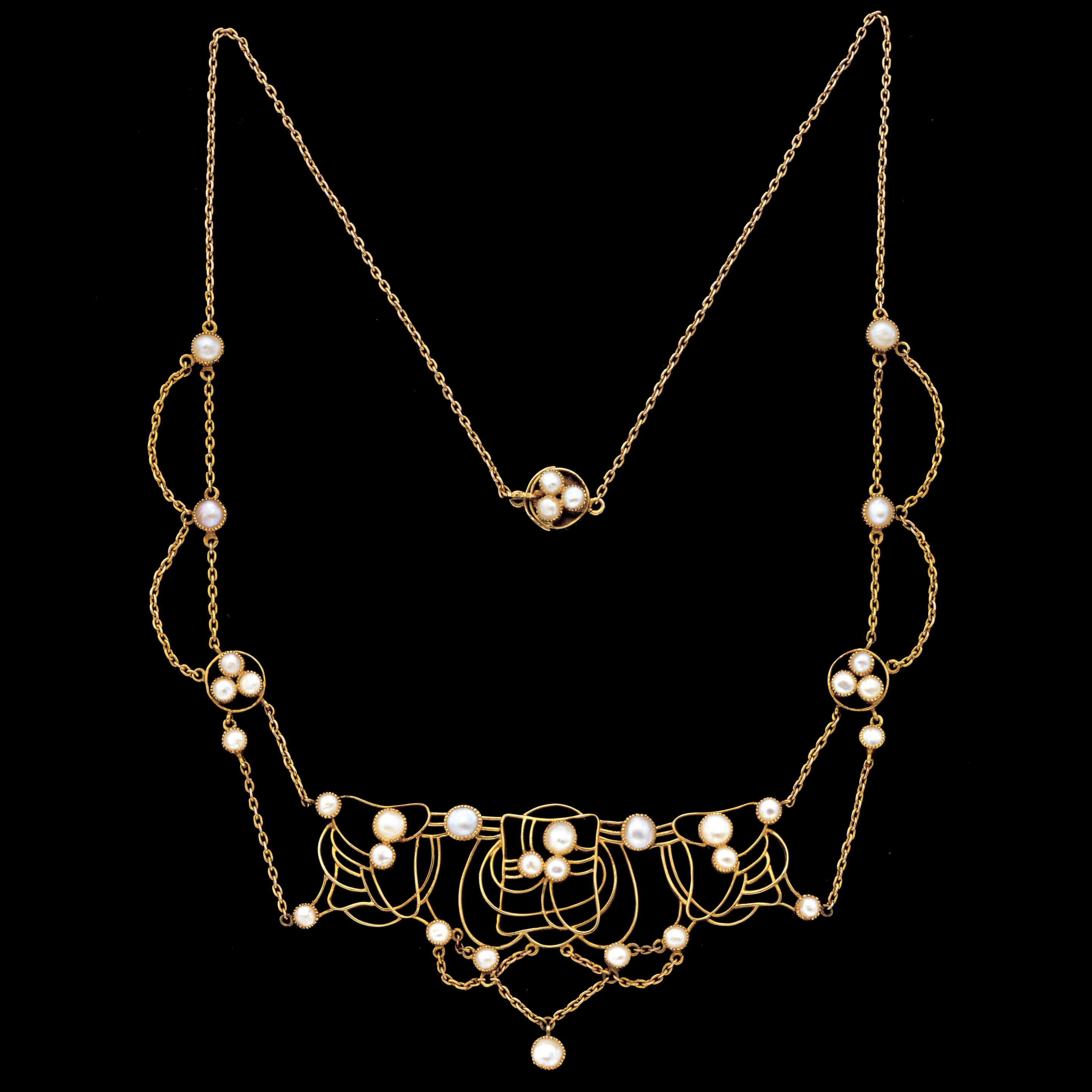 A delicate Glasgow School necklace in gold & pearl designed by Jessie M. King for Liberty & Co.