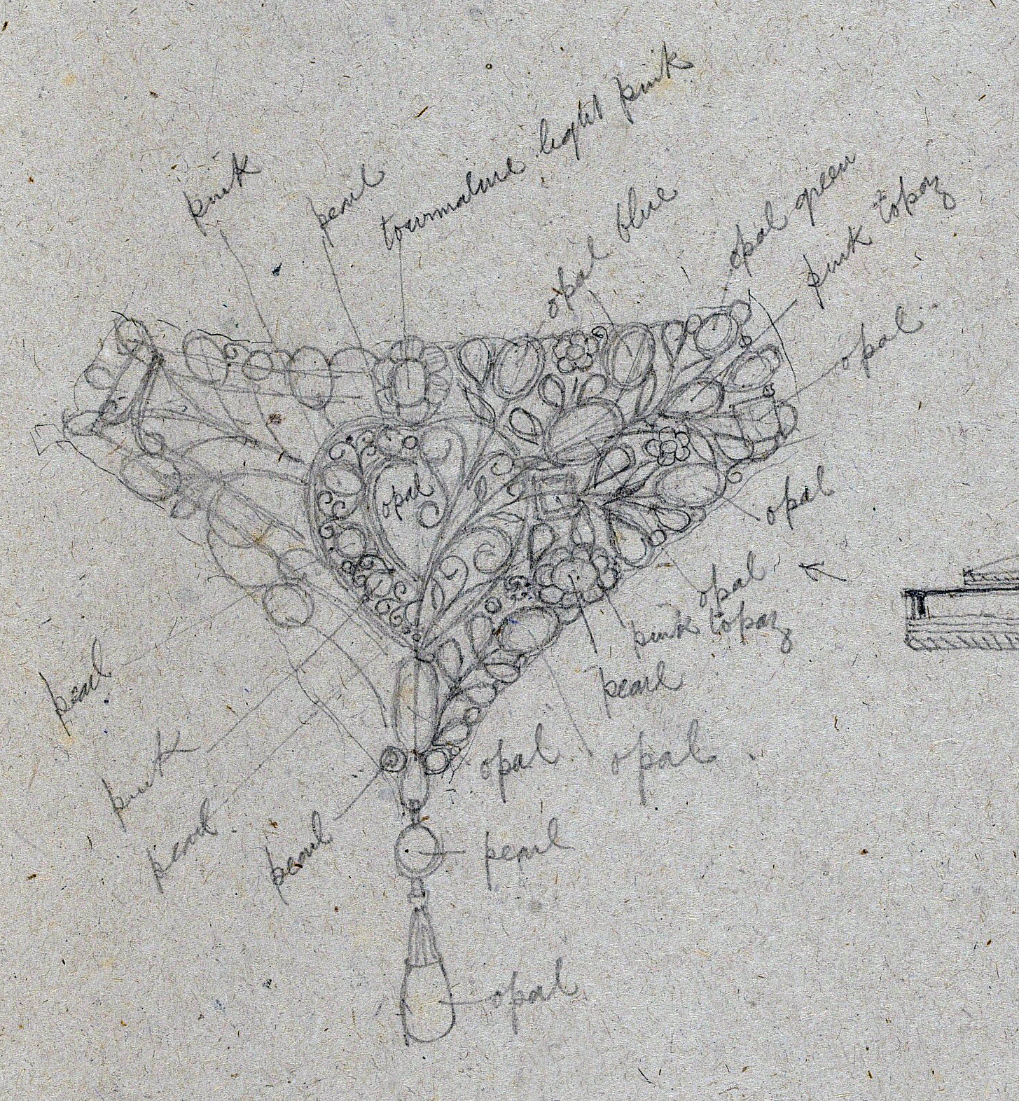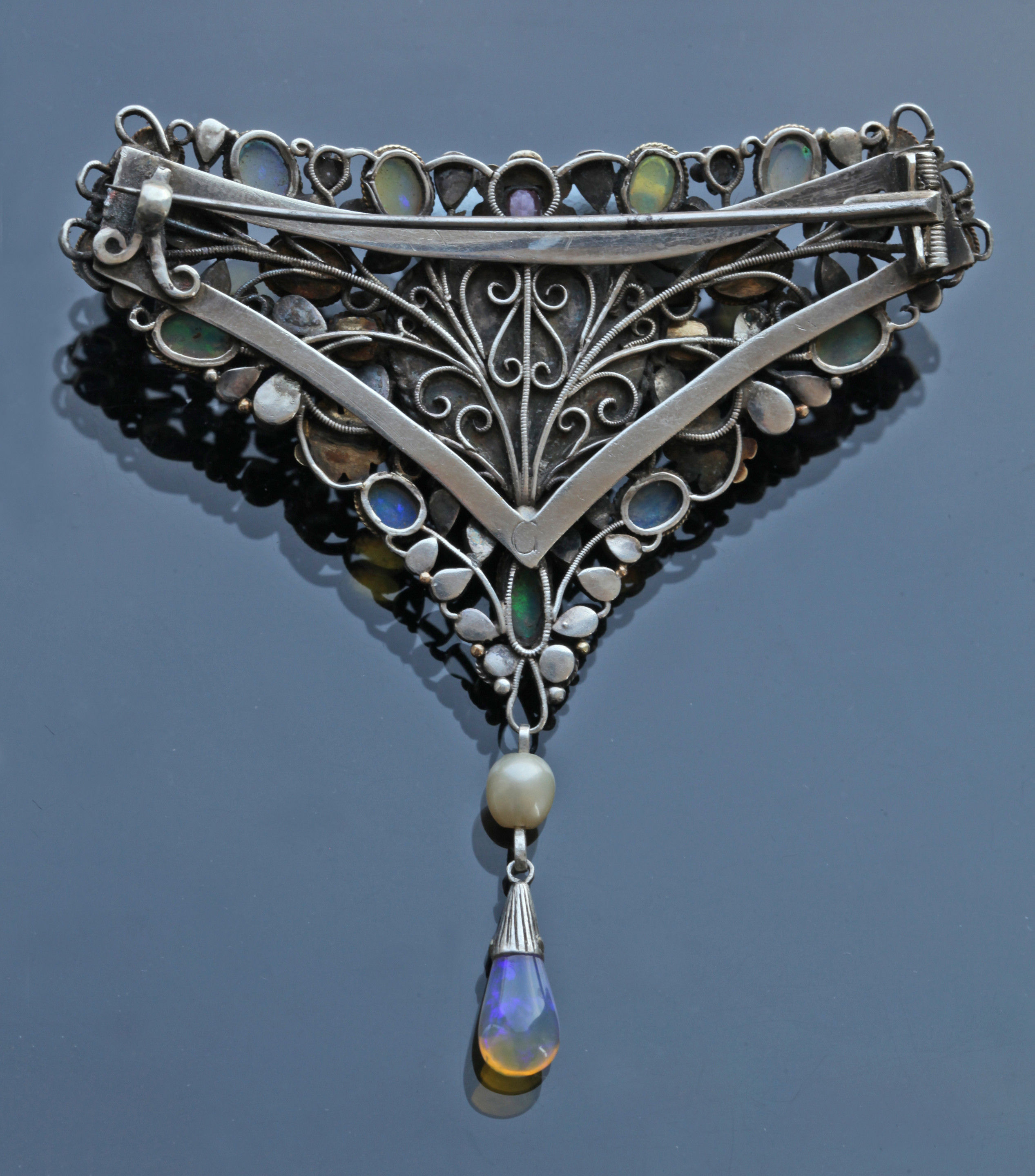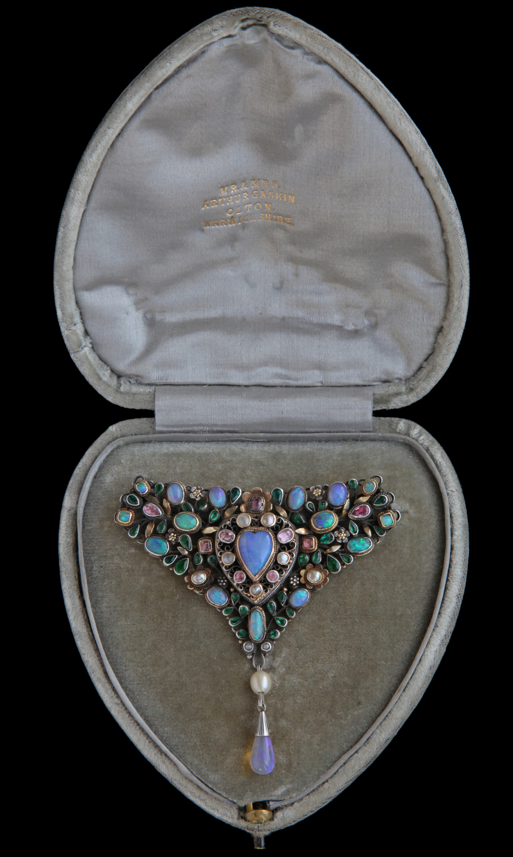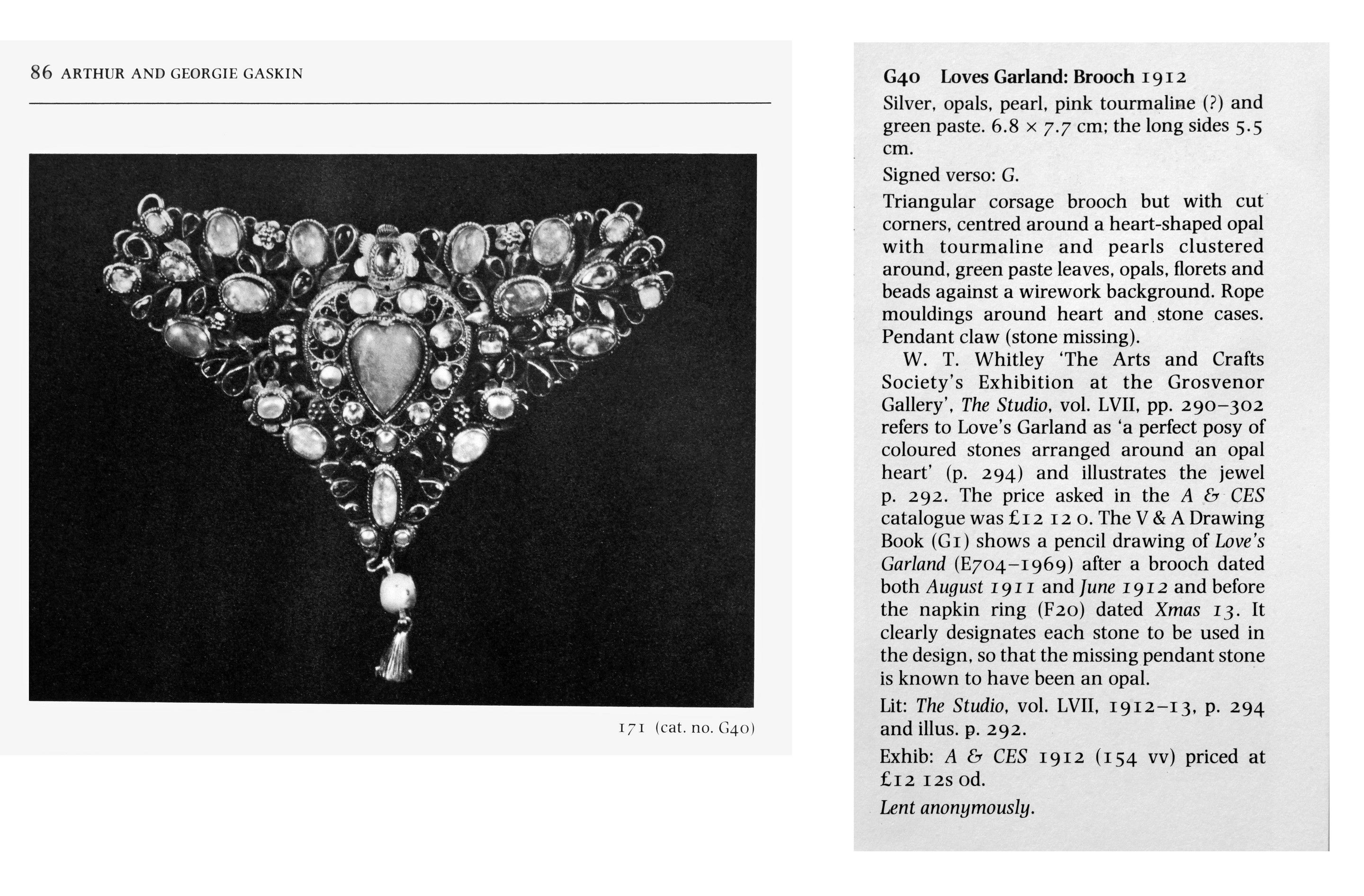 The catalogue entry states this piece was previously exhibited at W.T Whitely 'The Arts and Crafts' Society Exhibition at the Grosvenor Gallery in 1912, where it was illustrated in 'The Studio vol LVII and priced at £12 12s 0d. The original pencil drawing for this piece is in the 'Drawing Book' by Arthur and Georgie Gaskin (Victoria and Albert Museum ref: E 672709 1969), where all the stones in the piece are labelled, showing that the missing drop was an opal which we have reinstated.