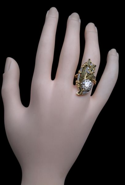 The stunning Japonism influenced design incorporates a sprig of flowering yew encompassed by a diamond studded C-scroll & set with a transitional brilliant cut 3.5 carat fancy champagne diamond, SI purity.