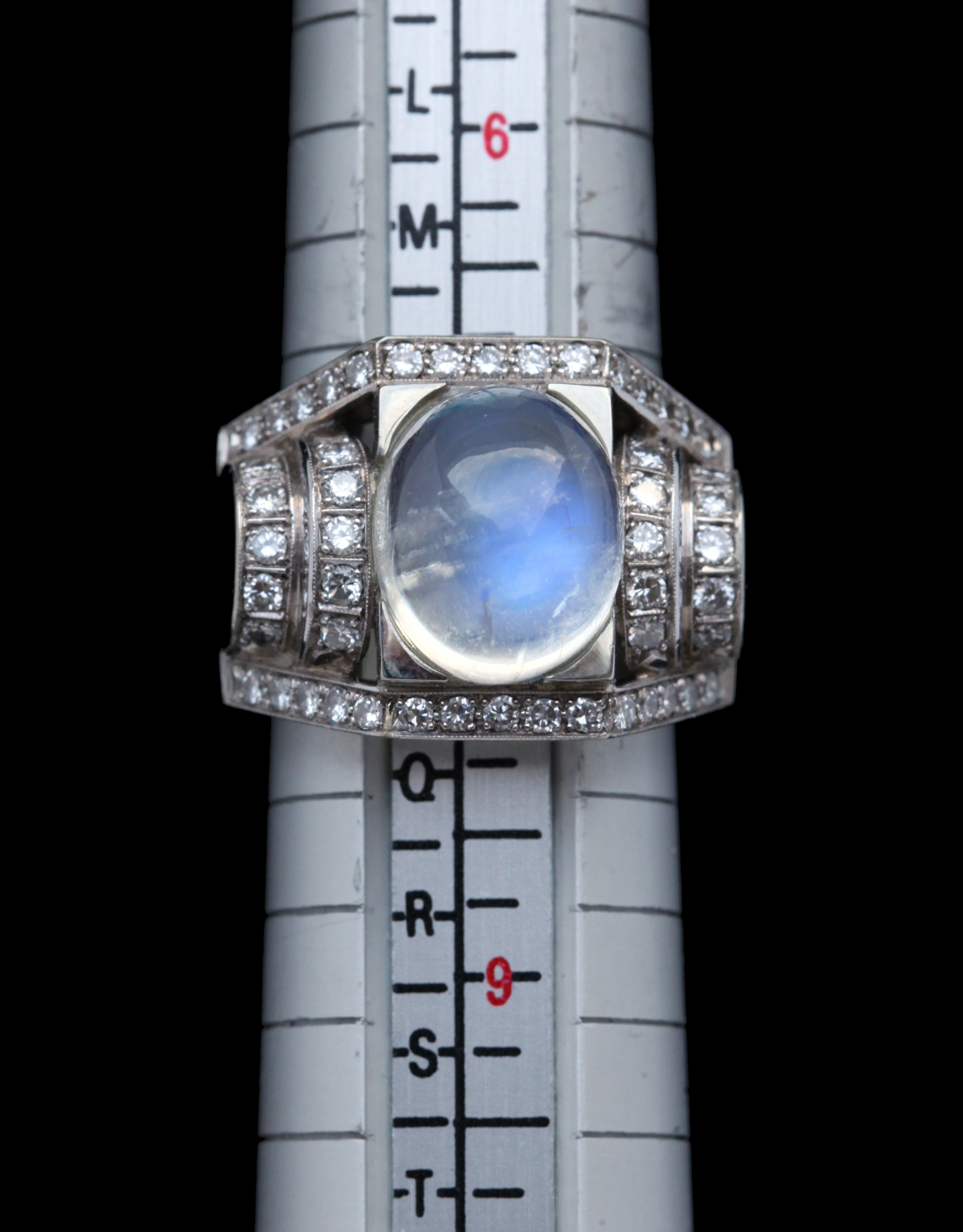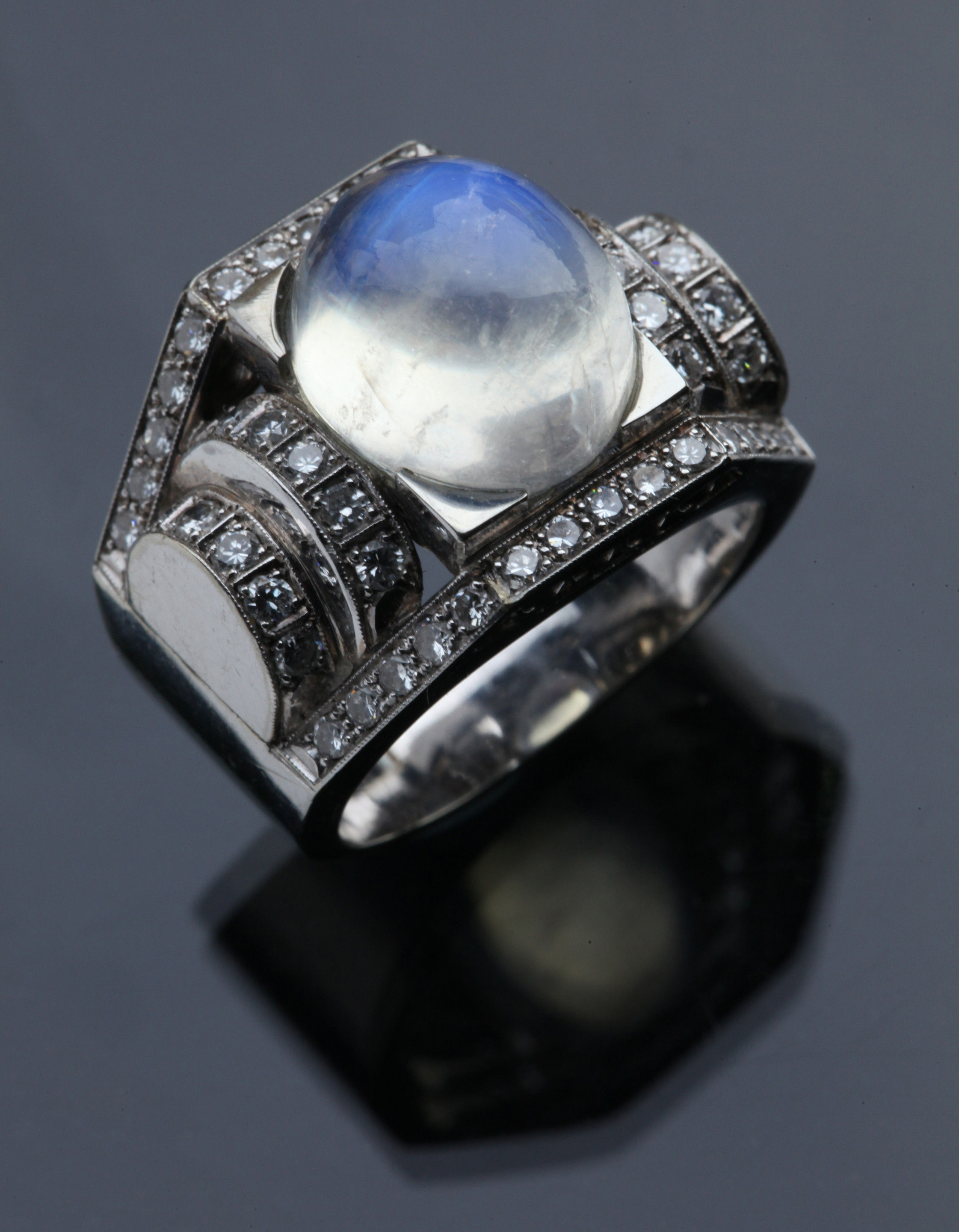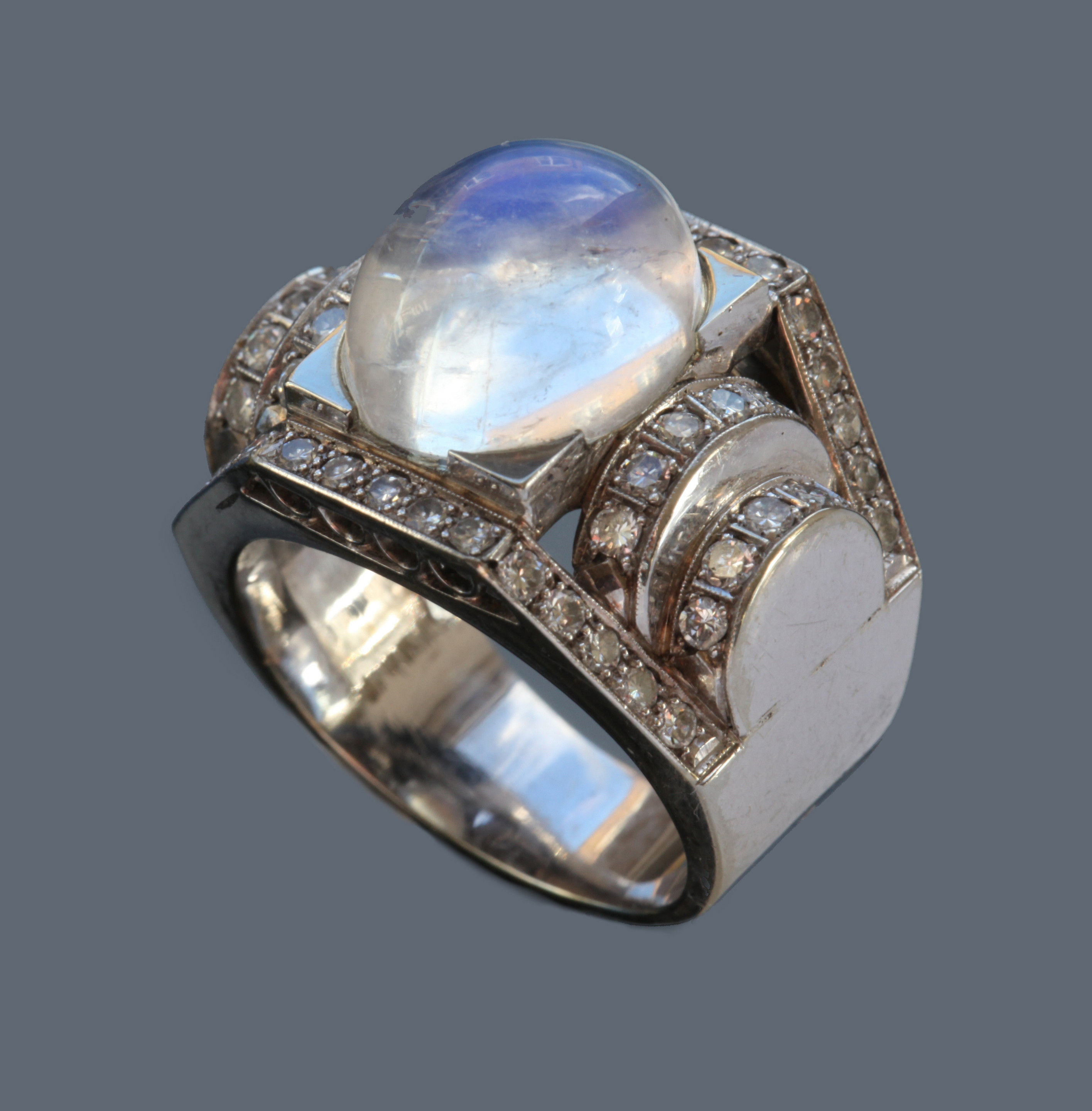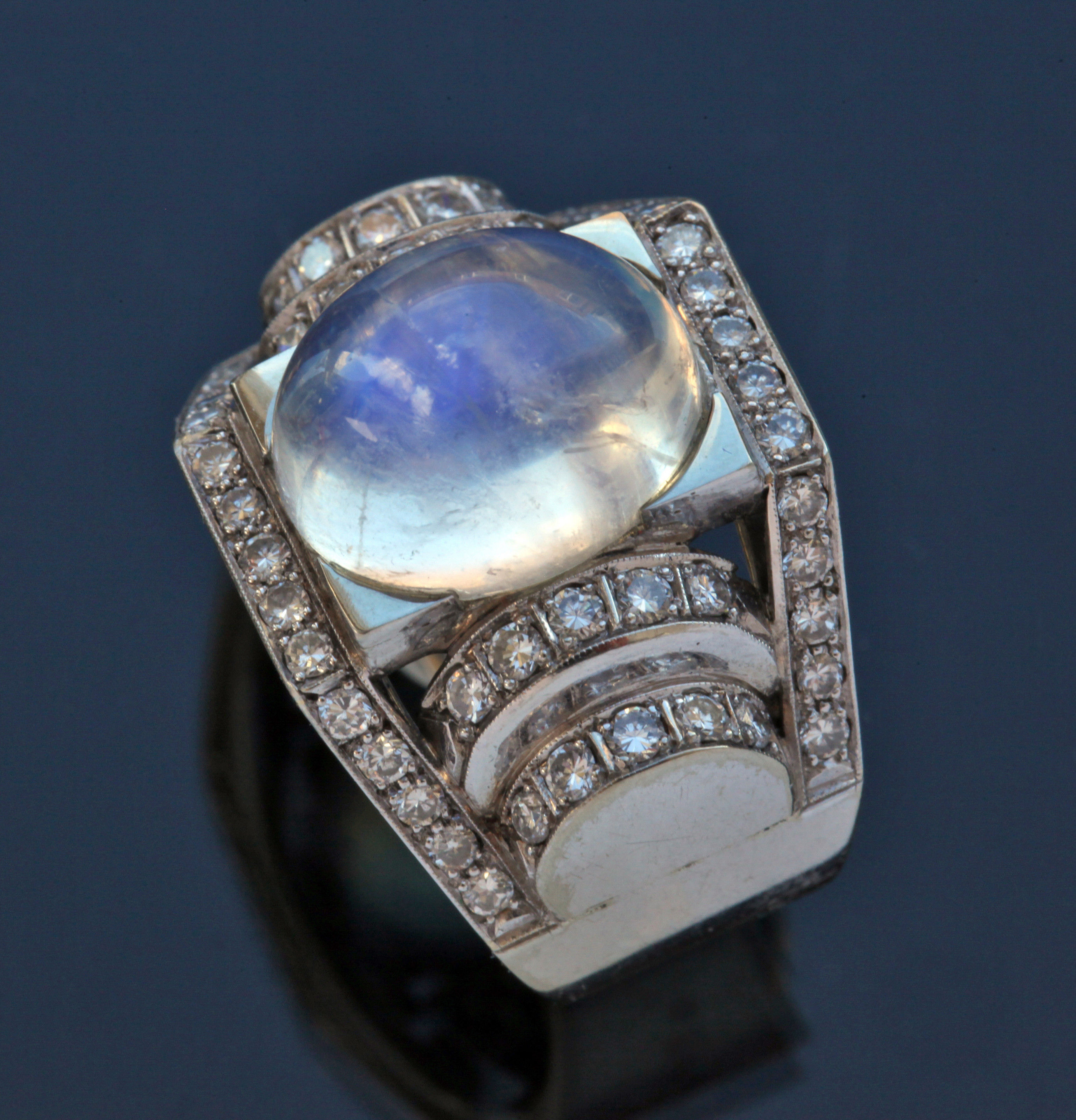 Dazzling Deco white gold ring. The moonstone 10.5 mm x 12.5 mm