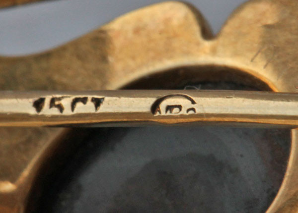| Marks | 'MBC' monogram & '15ct' on pin |