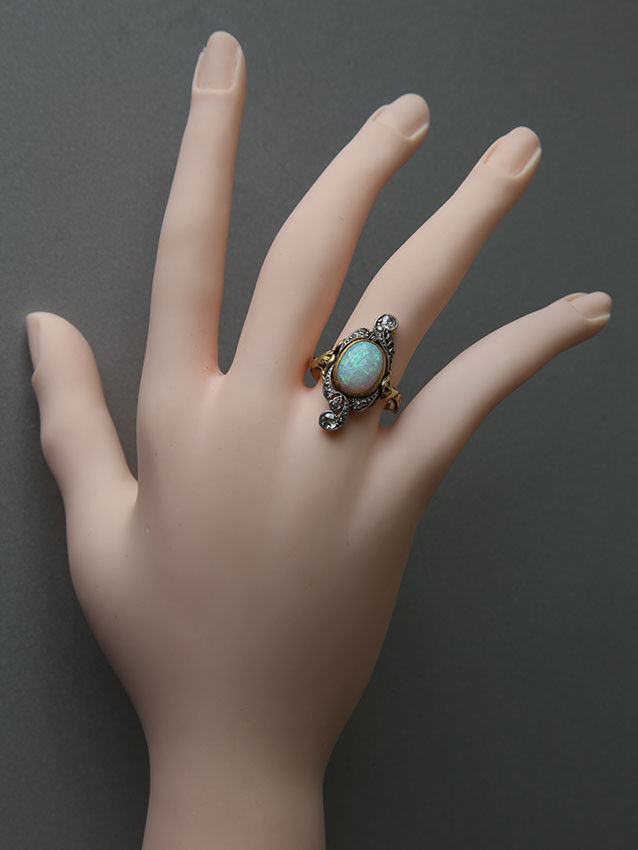 A beautiful Art Nouveau gold, opal & diamond ring 13 old cut diamonds & 4 rose cut diamonds total 0.50 cts approx. Opal size 12 mm x 9 mm approx