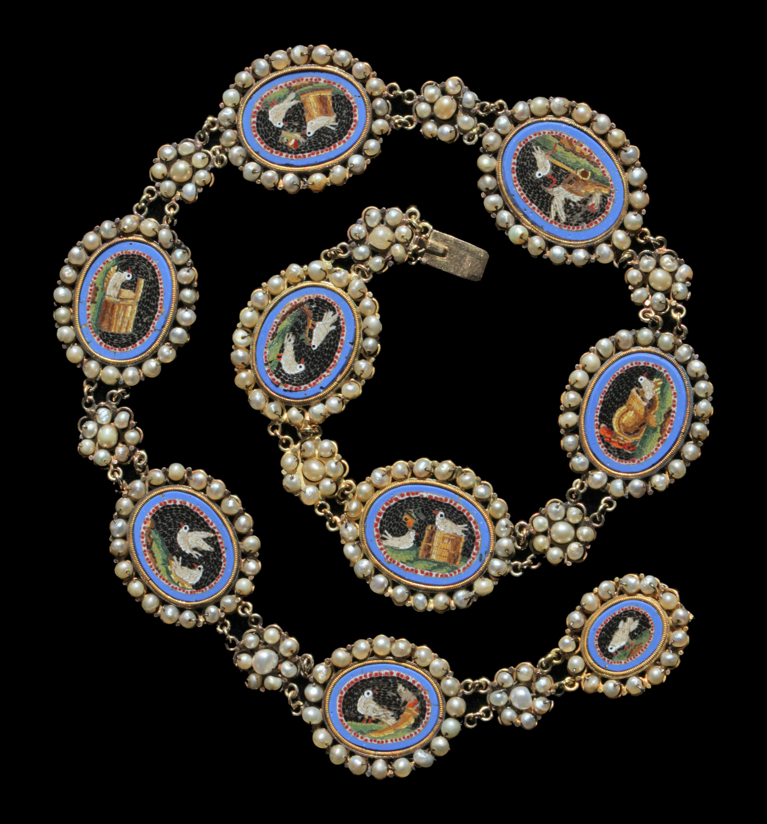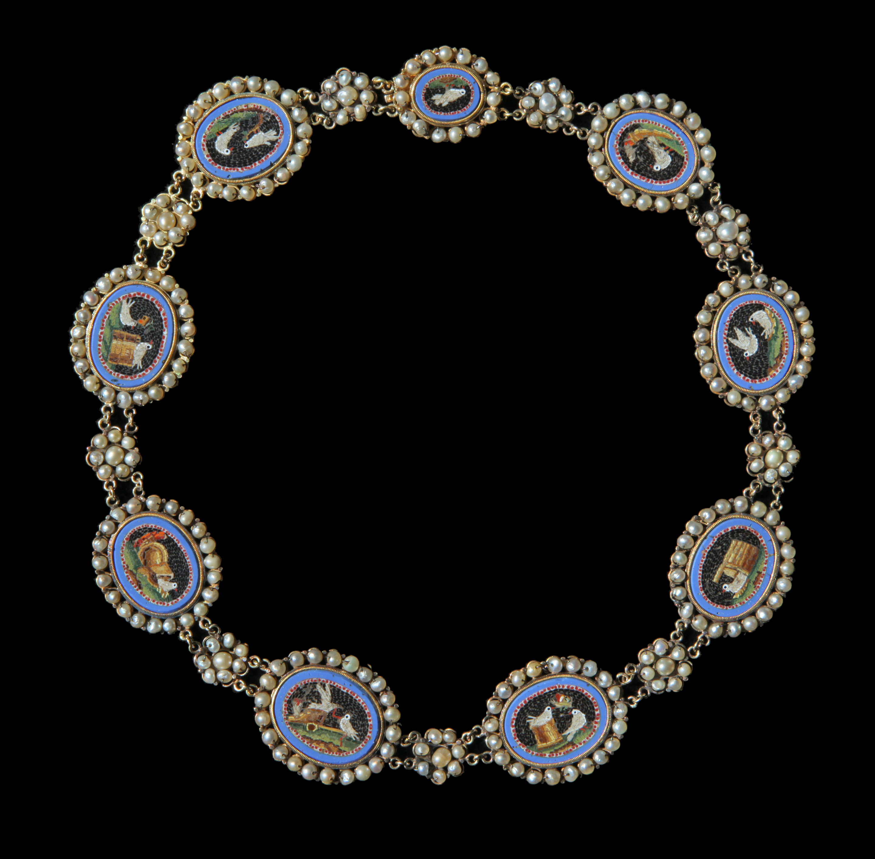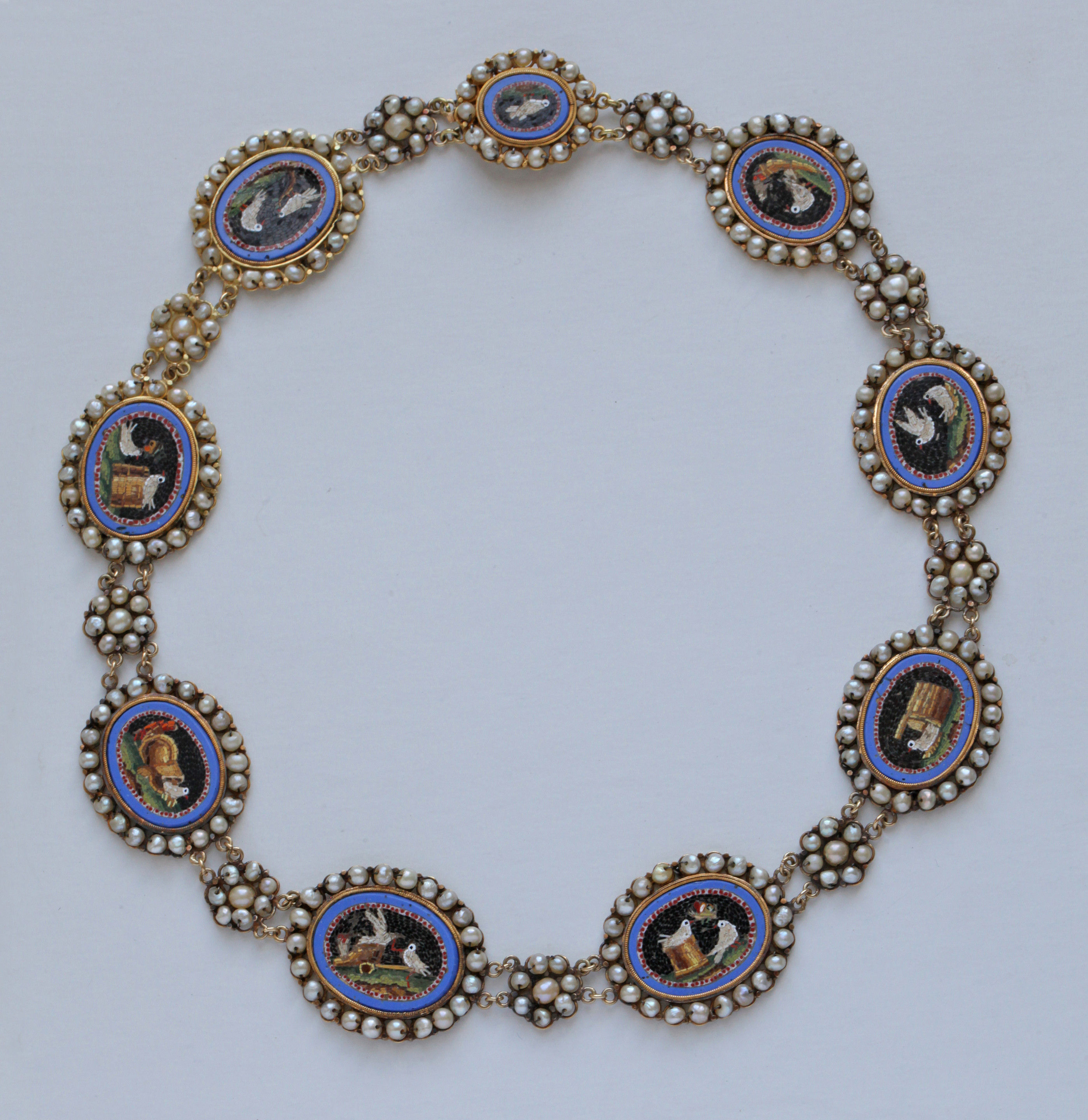 An exceptional Grand Tour antique necklace composed of 9 oval Roman style micro-mosaics, depicting Doves in the manner of the famous mosaics discovered in the Emperor Hadrian's villa at Tivoli & described by Plinny in the 1st Century AD.
