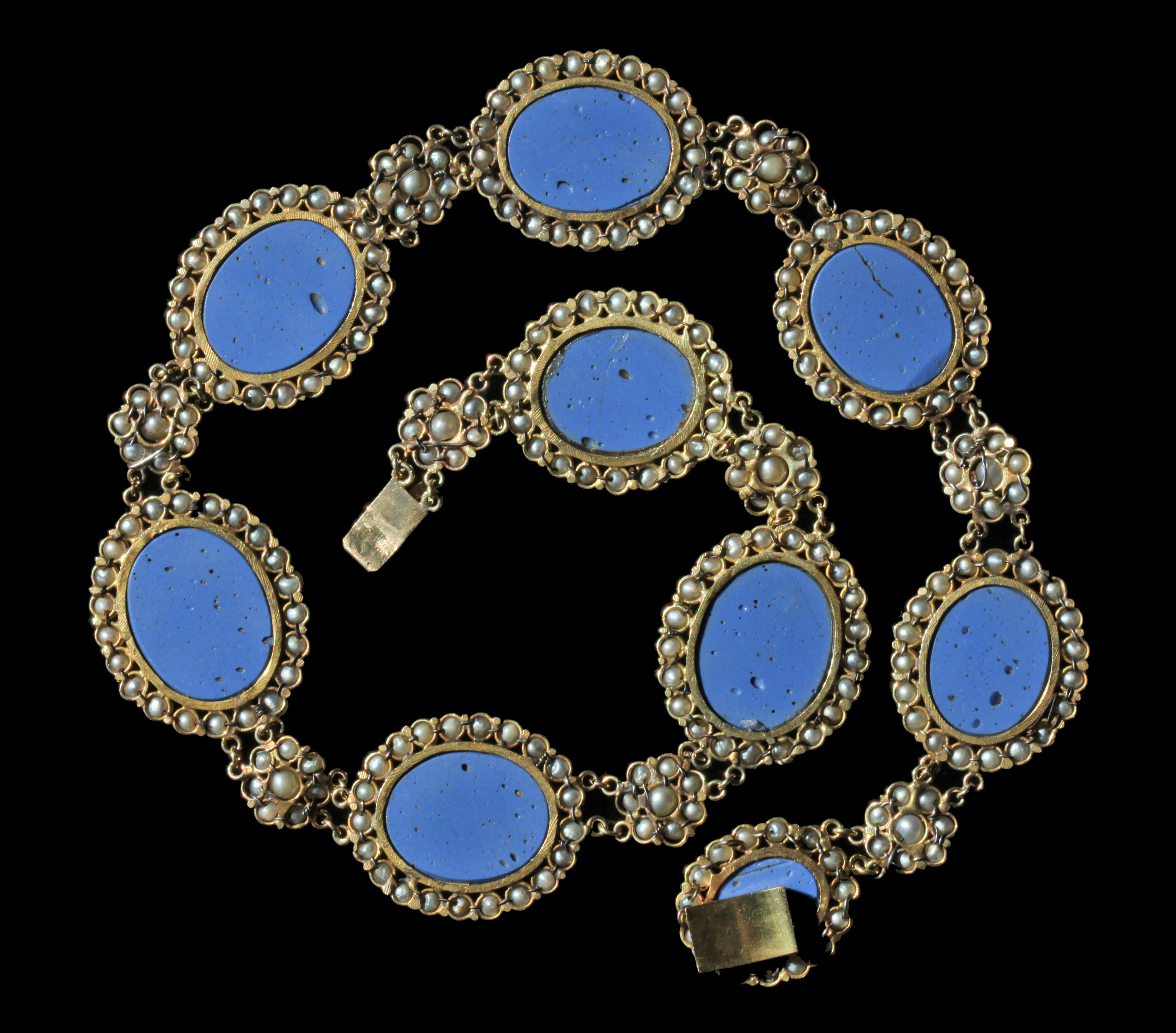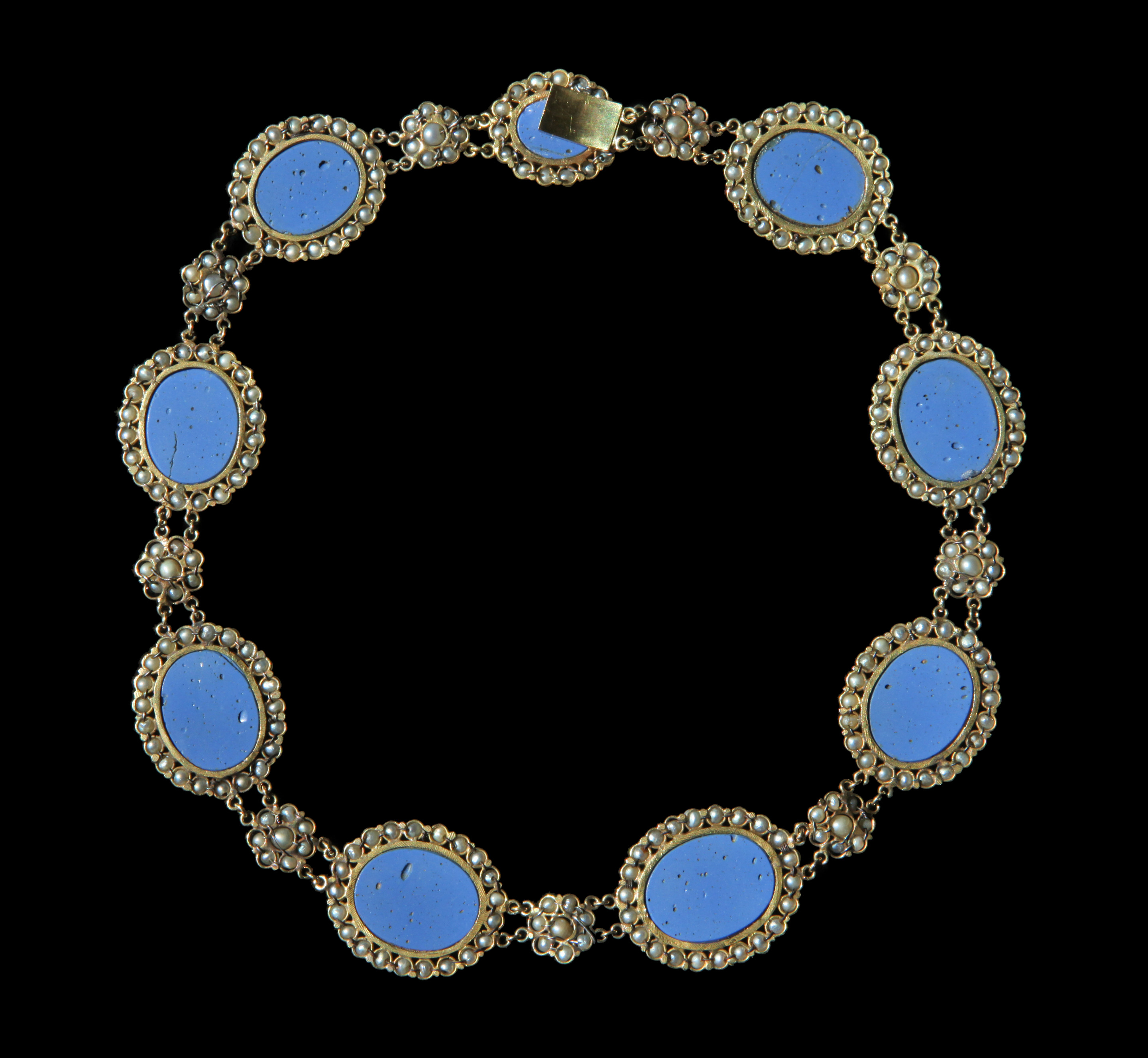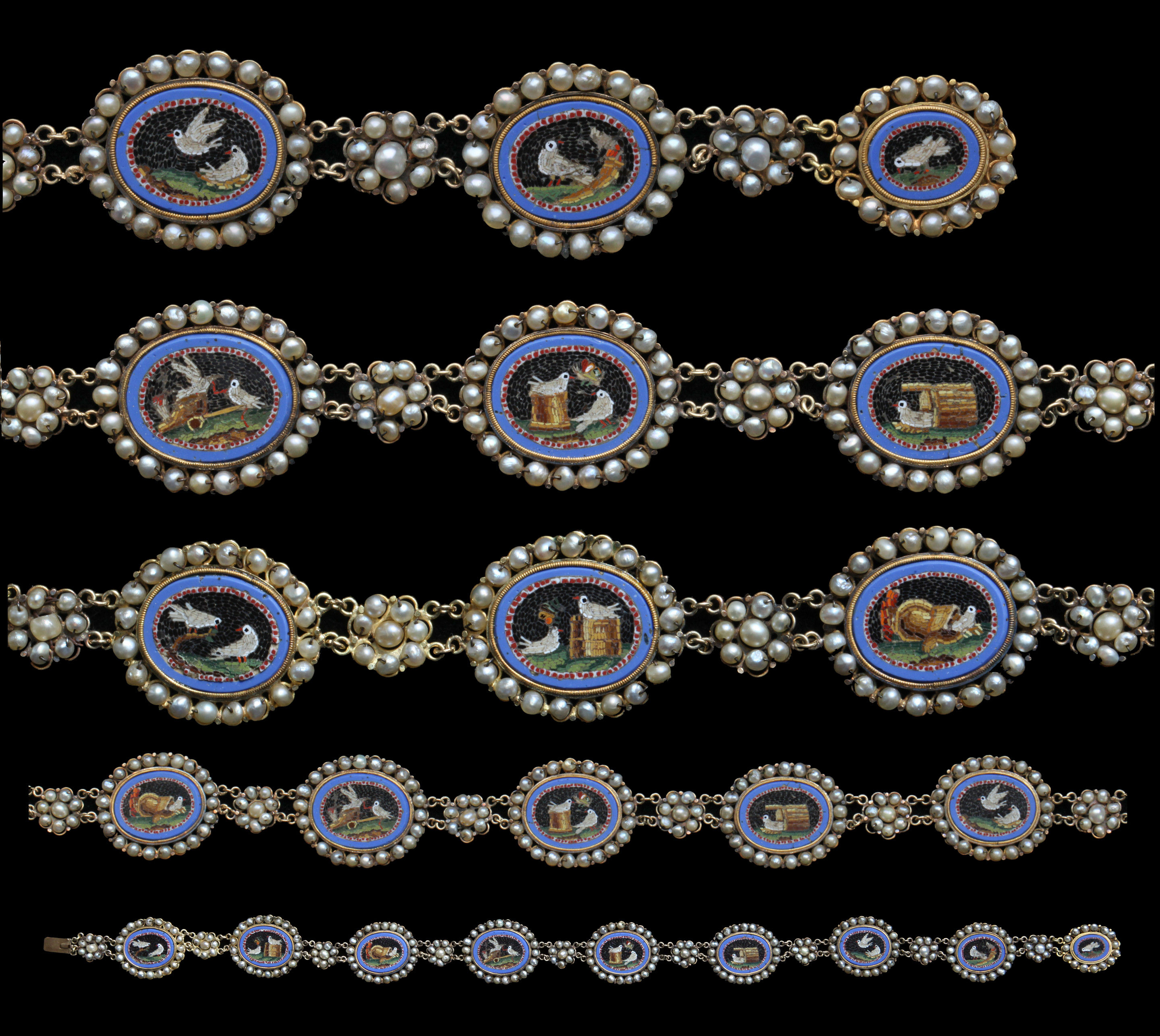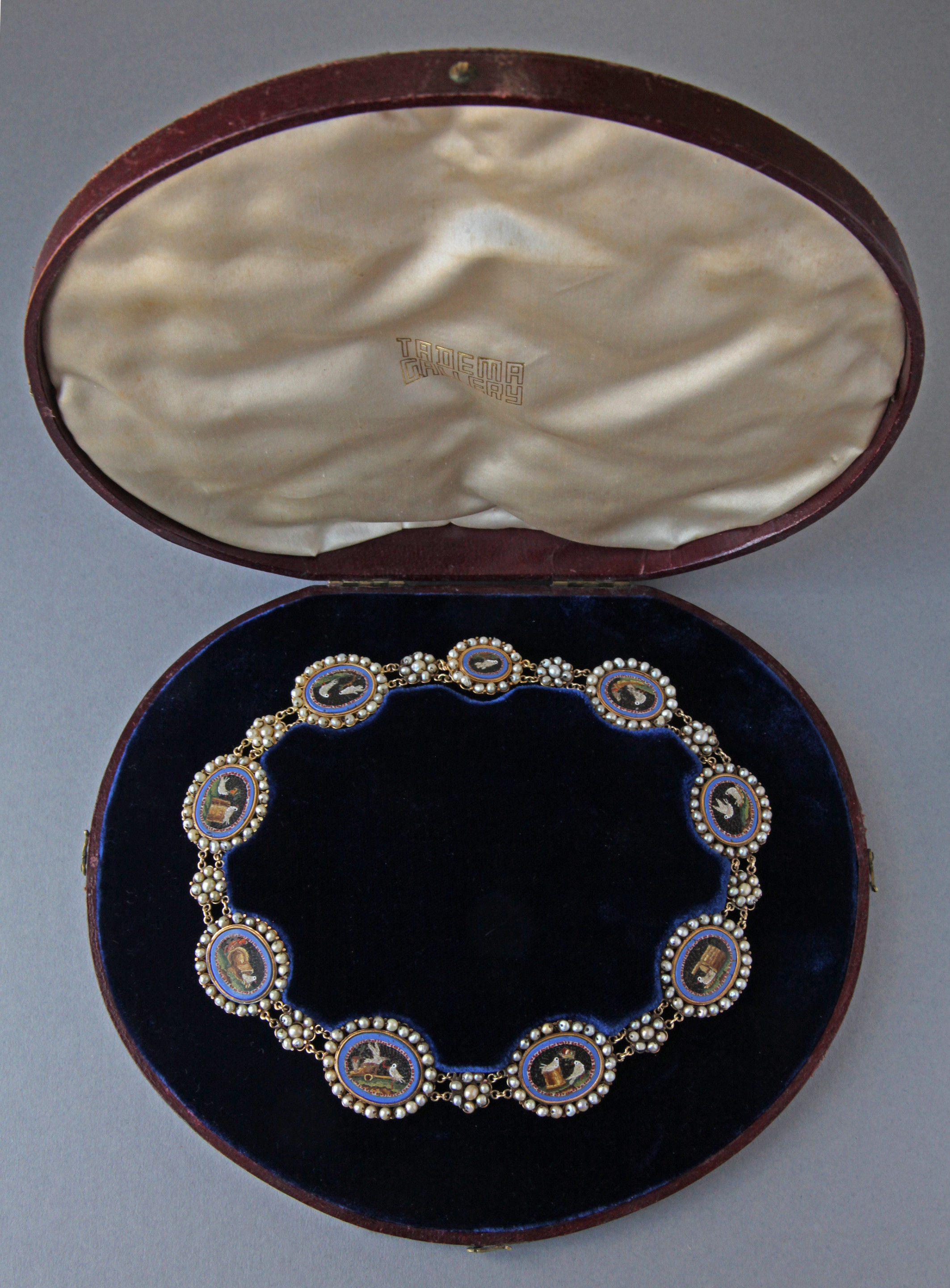 An exceptional Grand Tour antique necklace composed of 9 oval Roman style micro-mosaics, depicting Doves in the manner of the famous mosaics discovered in the Emperor Hadrian's villa at Tivoli & described by Plinny in the 1st Century AD.