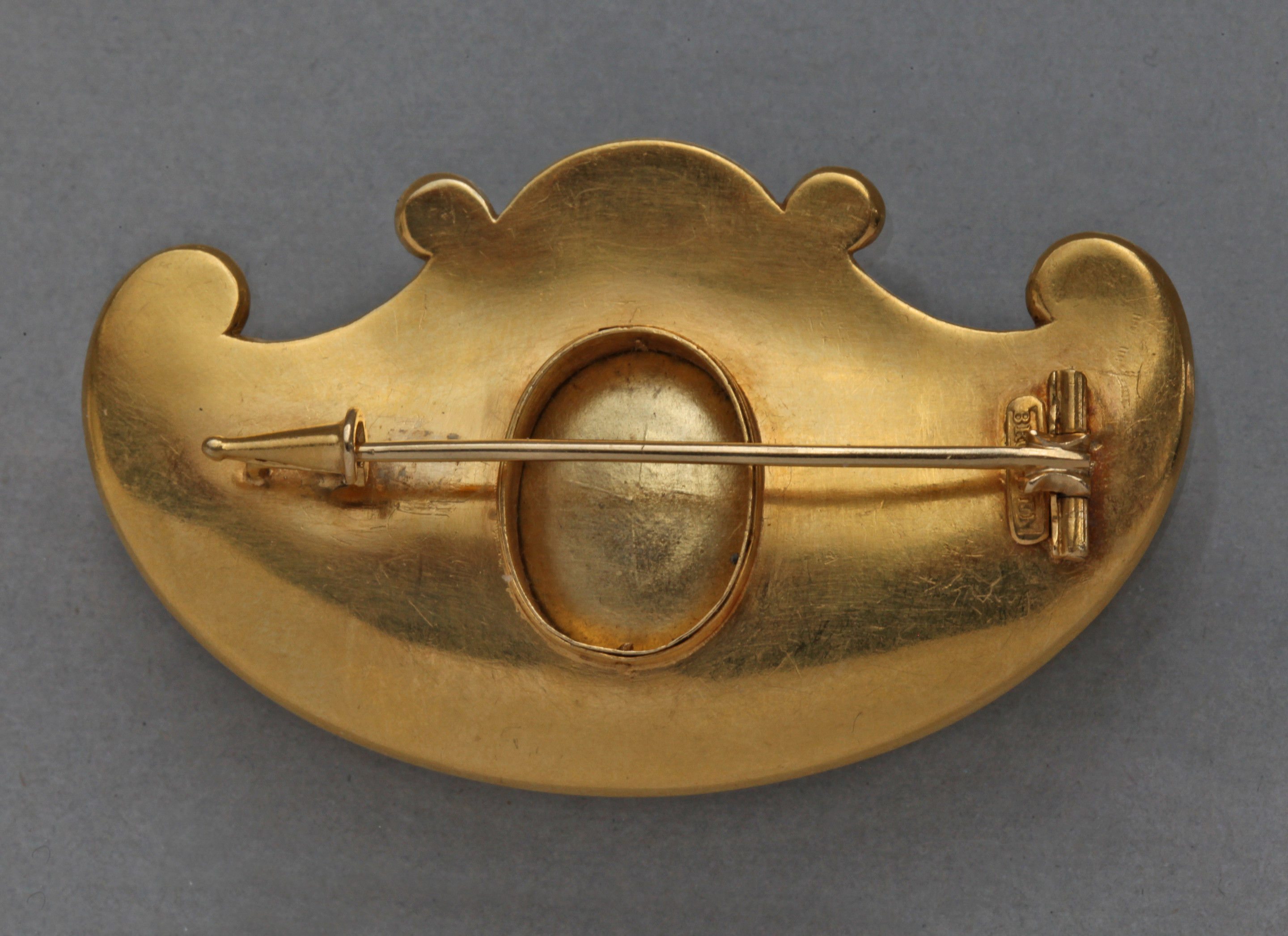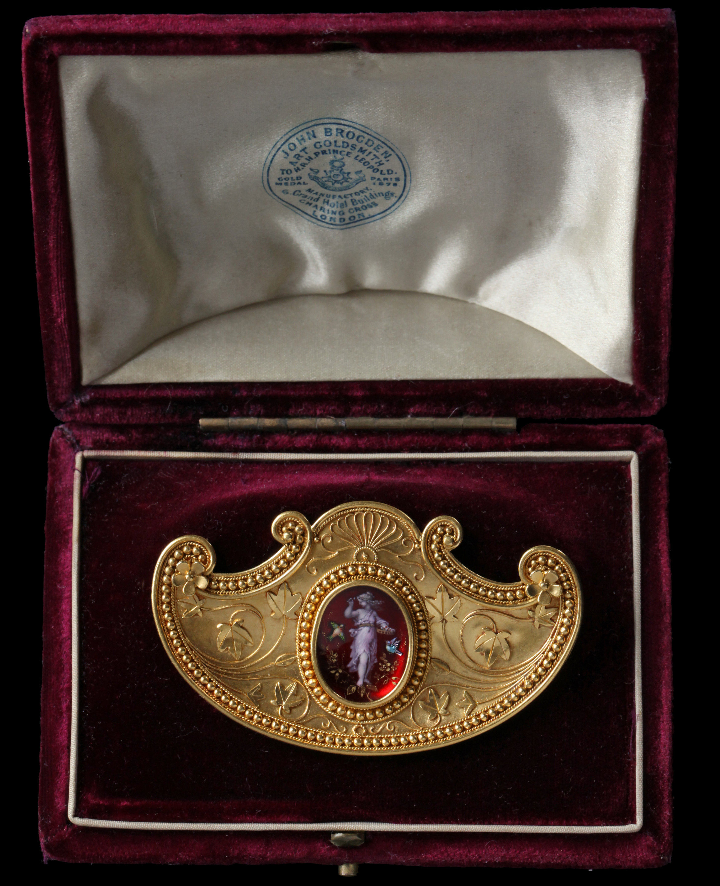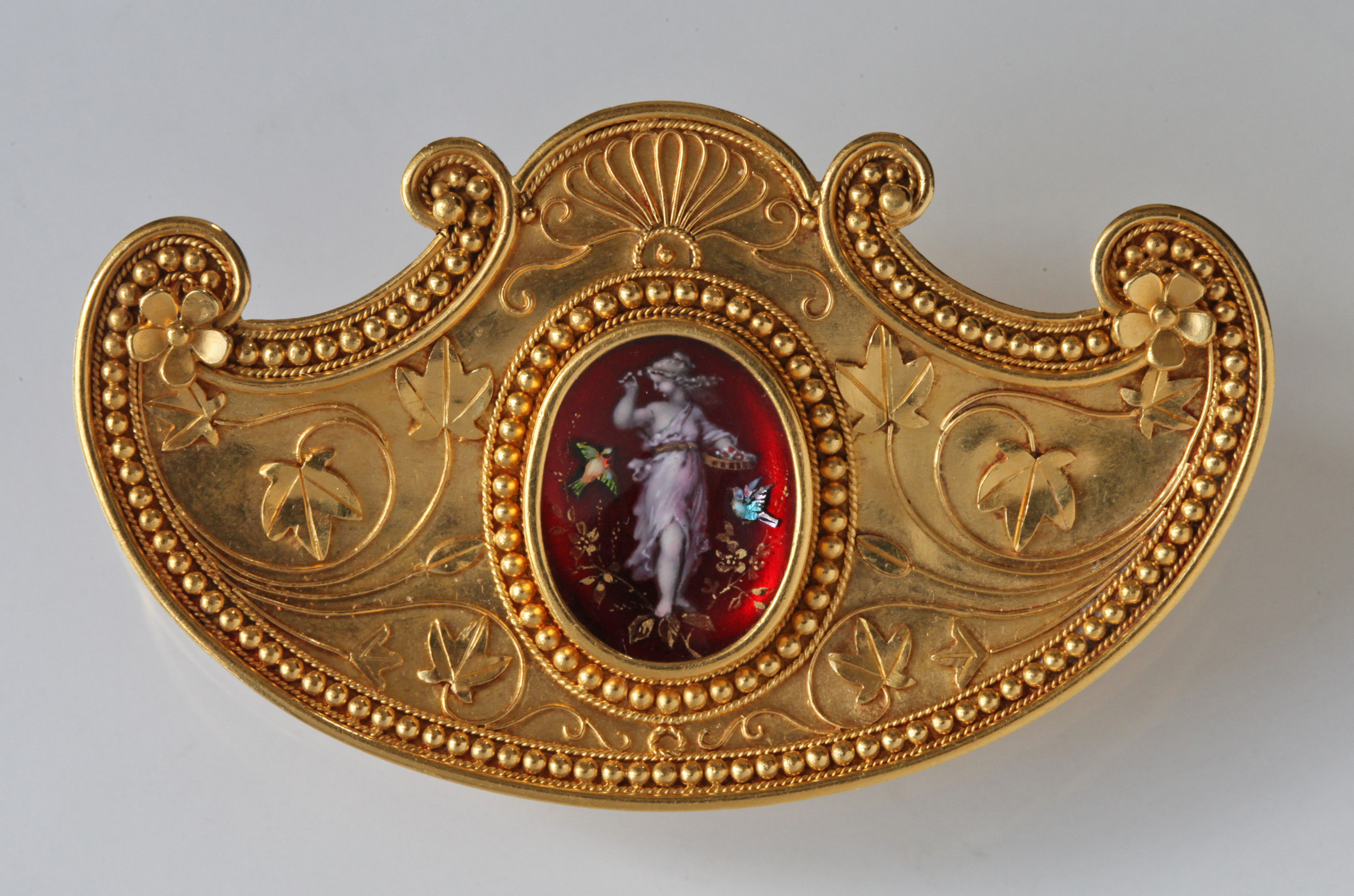 An antique enameled gold gorget brooch by John Brogden in the Etruscan manner.