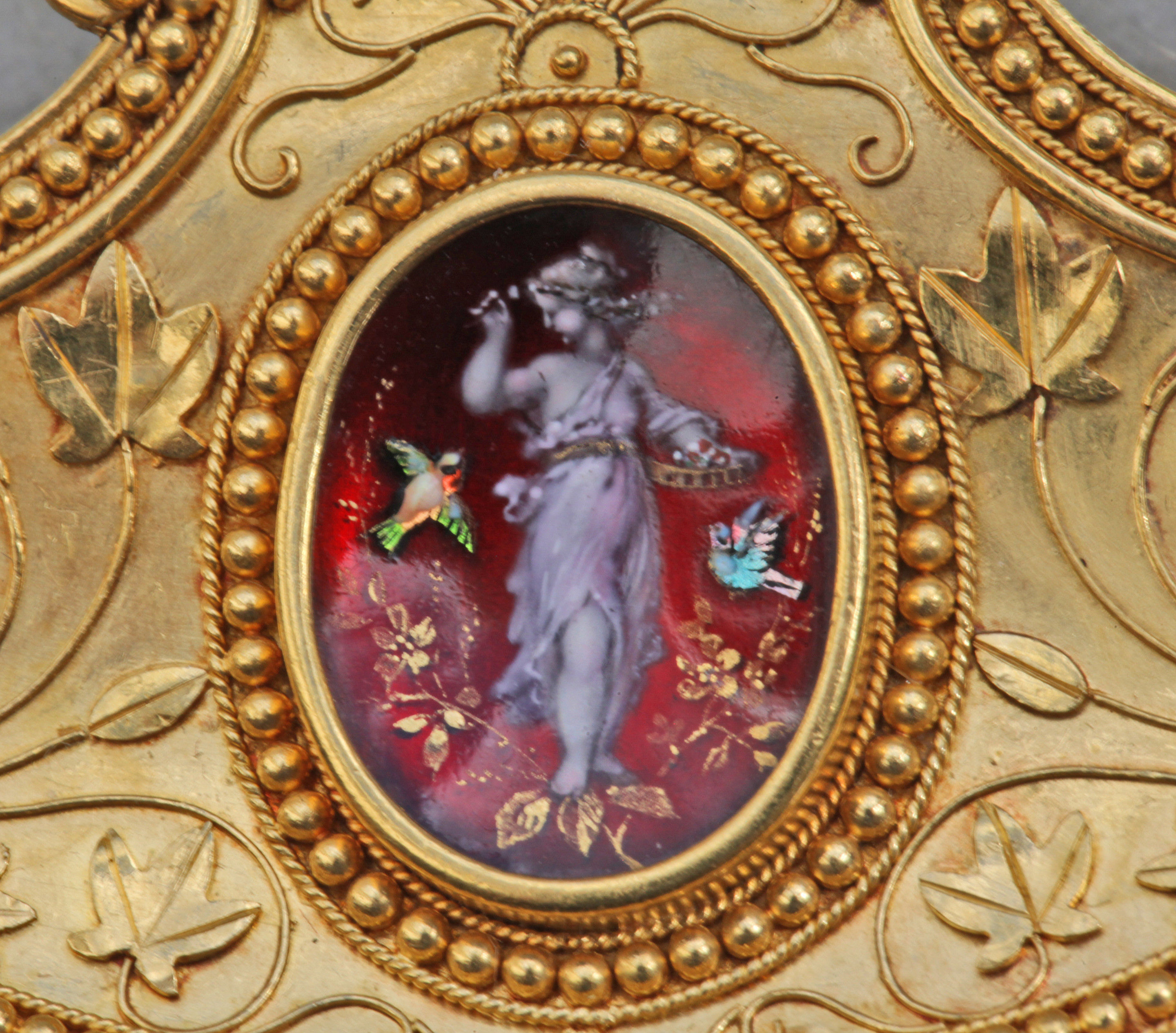 The Italian Renaissance style enamel of 'The Queen of the May' surrounded with gold decoration of 'Honeysuckle & Ivy for Beauty'