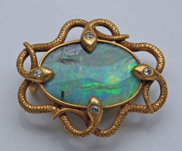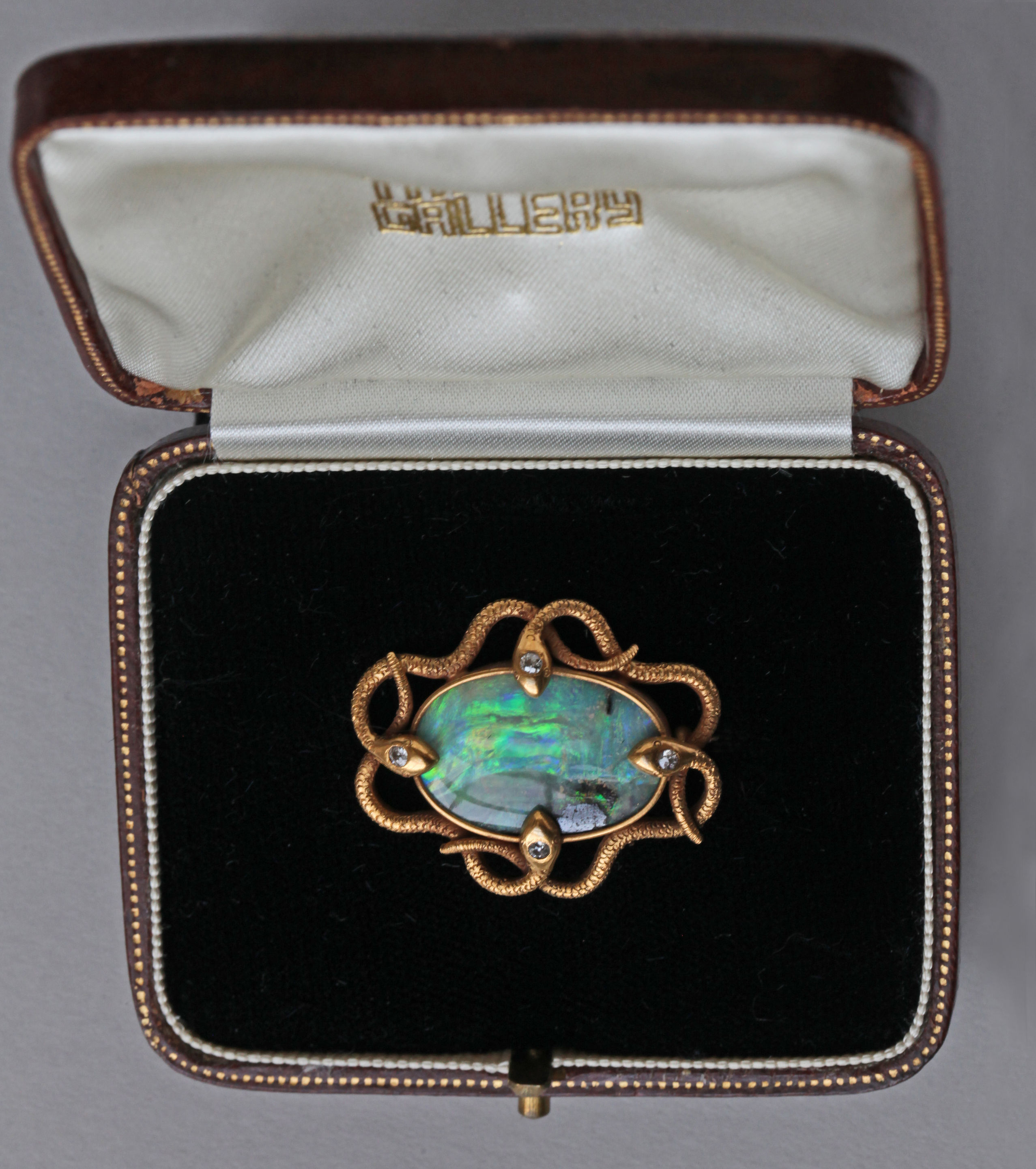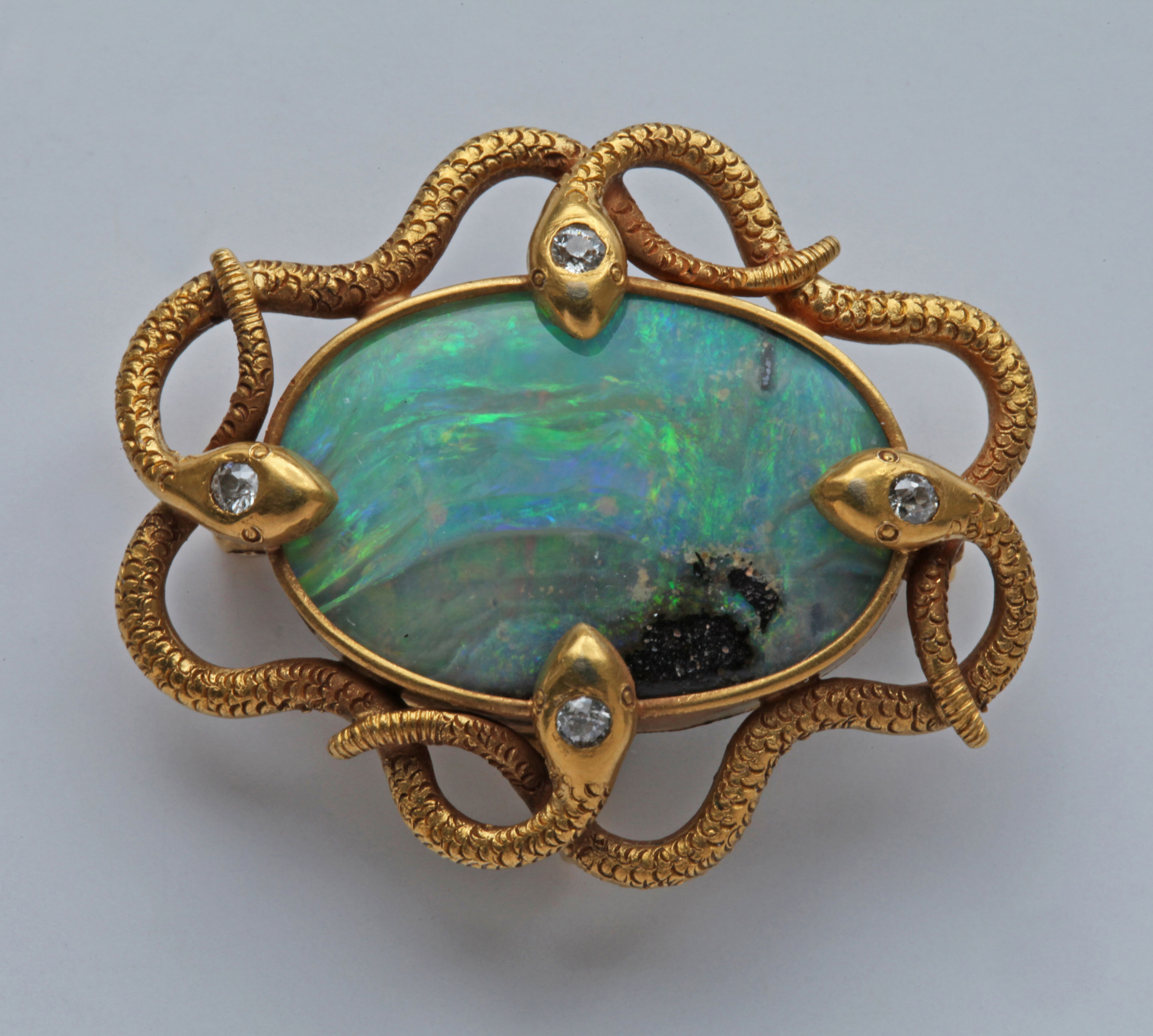 A fine Art Nouveau Rattle Snake brooch in gold opal and diamonds.