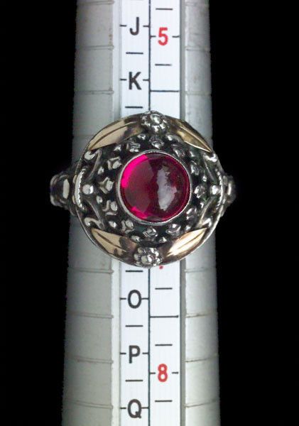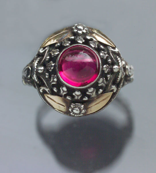 Arts & Crafts Ring in silver & gold. This genuine laboratory ruby has the same chemical composition, crystal structure, optical & physical properties as a mined ruby & has the same Mohs hardness of 9. They were first made in Switzerland in 1880 & would have cost the same as a natural ruby & were chosen for their purity & colour.
