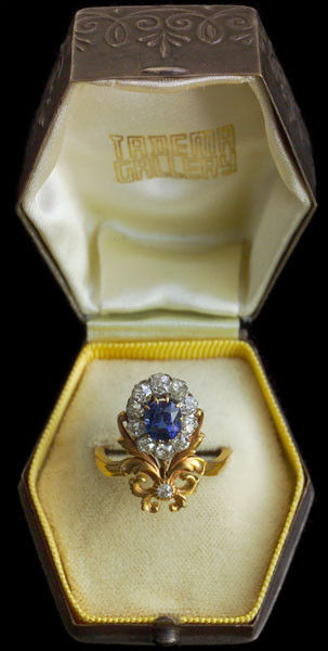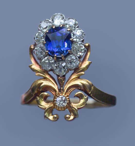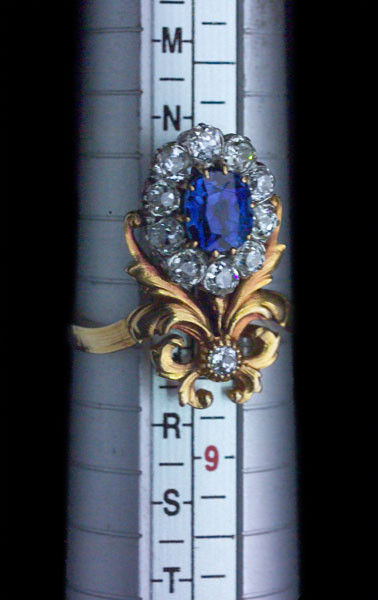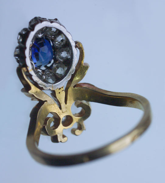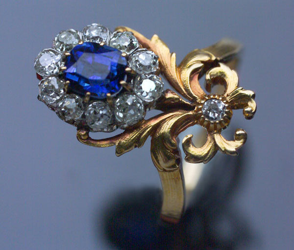 Royal blue sapphire 0,75 cts approx surrounded by 10 old cut diamonds 1.00 cts approx surrounding Single old cut diamond 0.08 cts approx