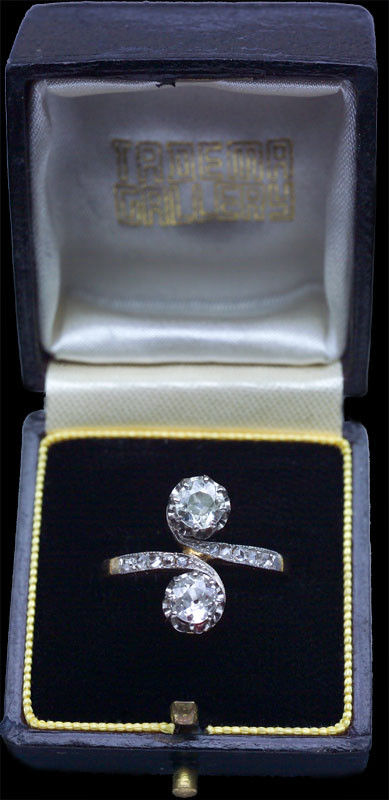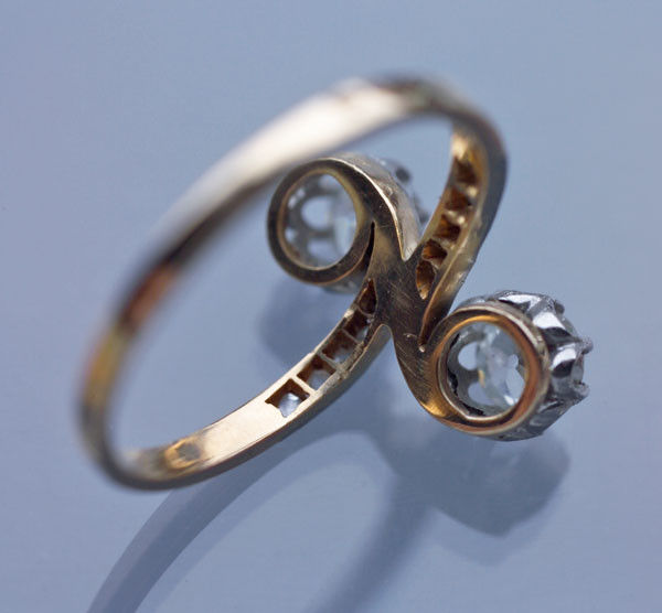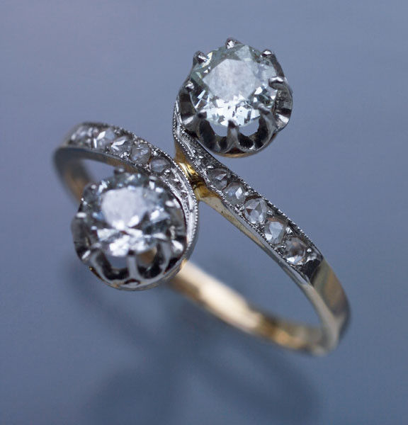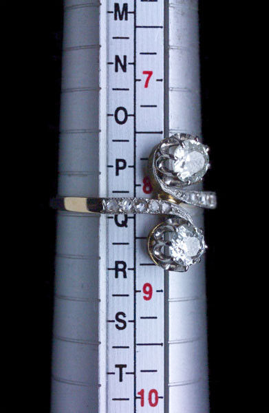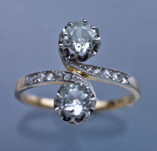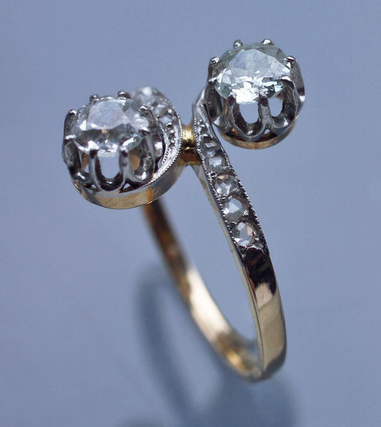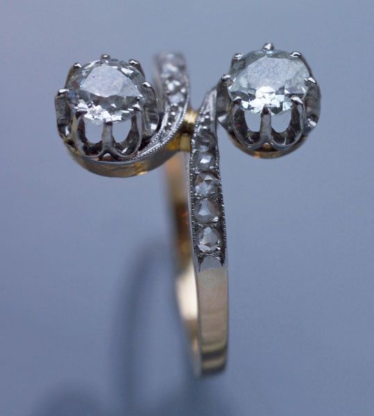 2 old cut diamonds 0.90 cts approx Shoulders set with 10 rose cut diamonds 0.10 cts approx