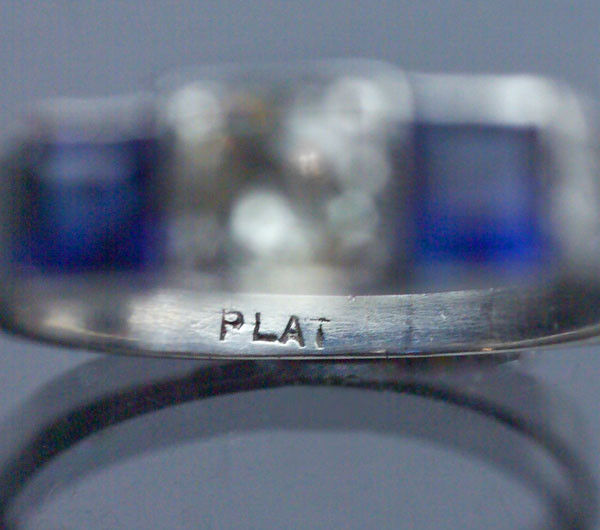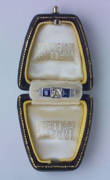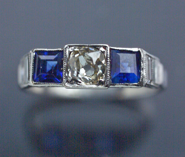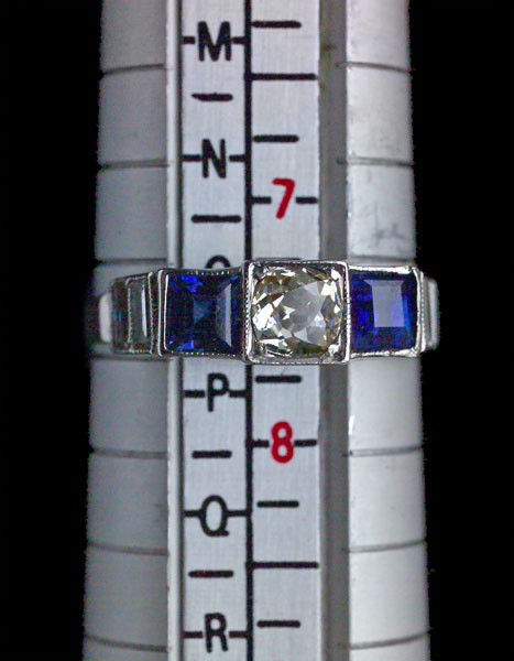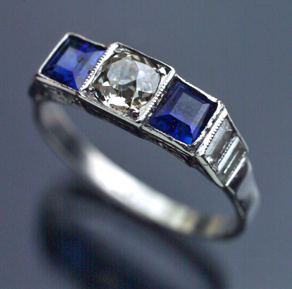 Central old cut diamond 0.50 cts approx. The 2 sapphires 0.80 cts approx. The shoulders set with 4 baguettes 0.40 cts approx