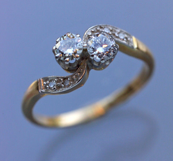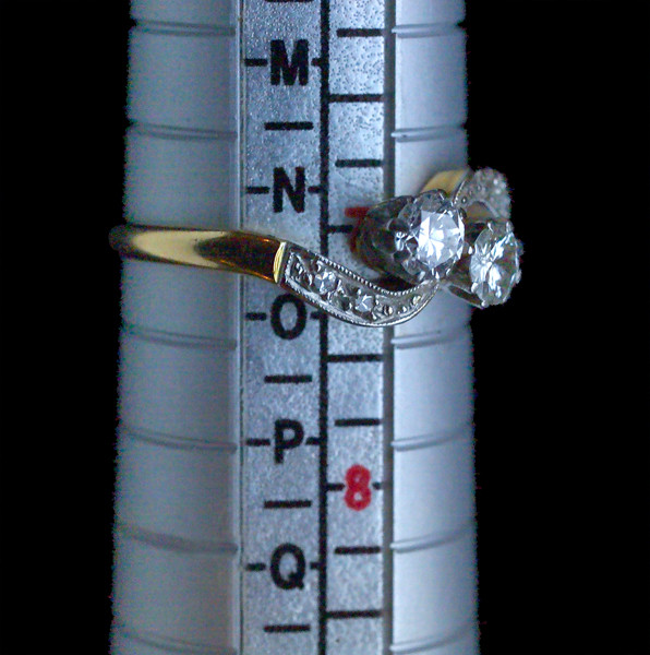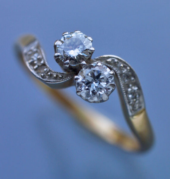European cut 2 stone cross over 0.40 cts approx the shoulders set with 4 diamonds