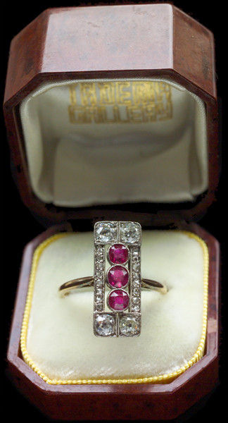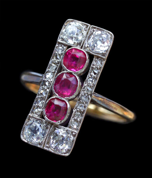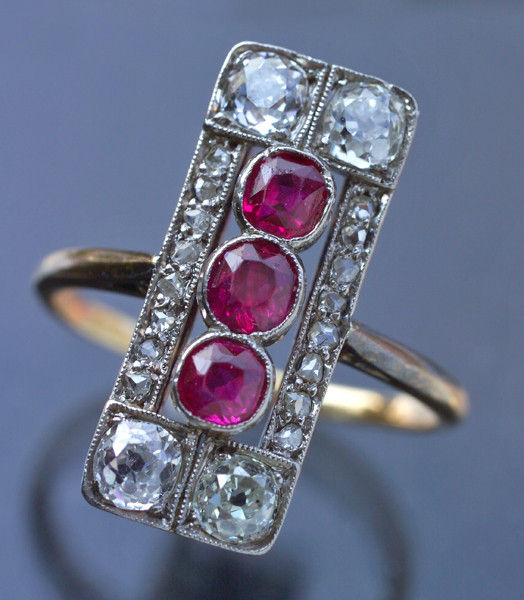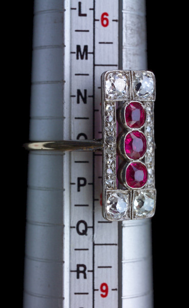 Rubies 0.60 cts approx 4 old cut diamonds 0.80 cts approx 16 rose cuts 0.20 cts approx Suitable as an engagement ring