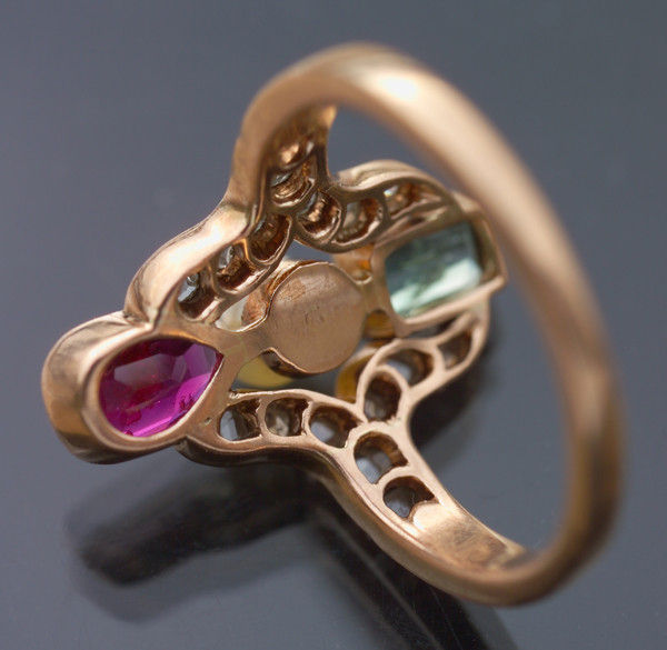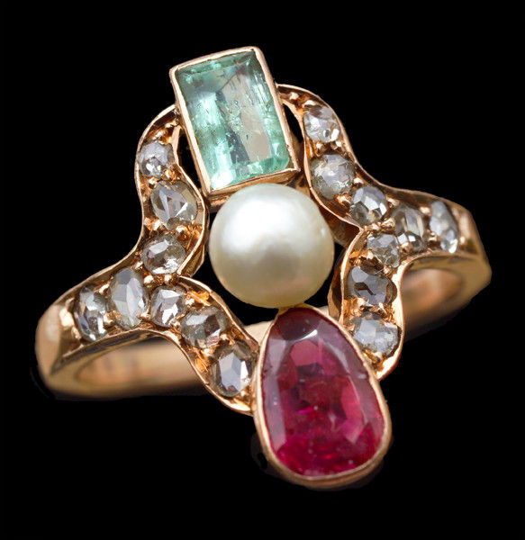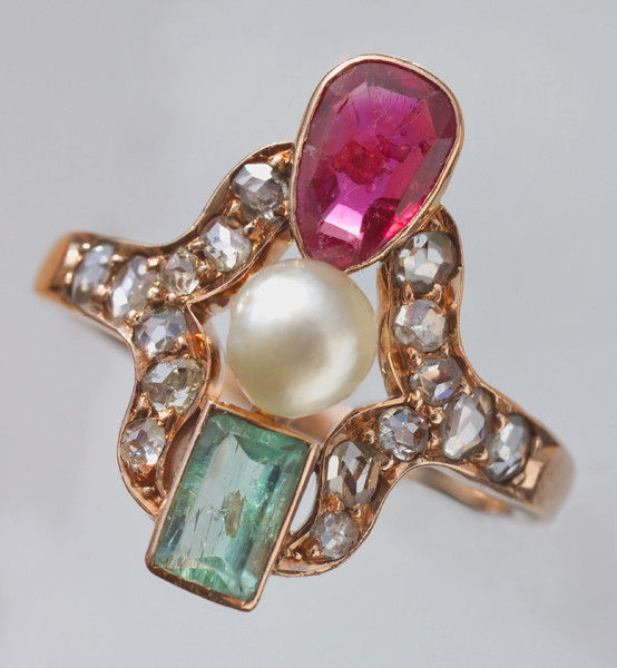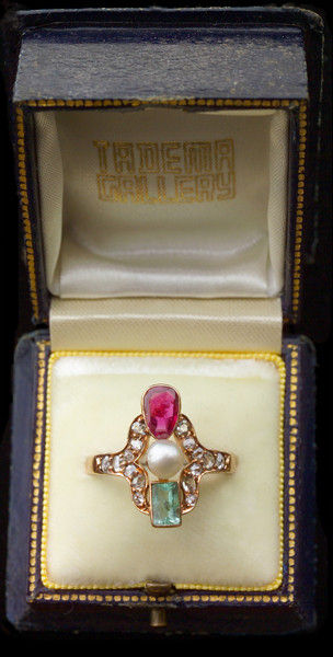 Pear shaped ruby 1 ct approx Baguette emerald 0.76 cts approx 16 rose cut diamonds 0.5 cts approx Suitable as an engagement ring