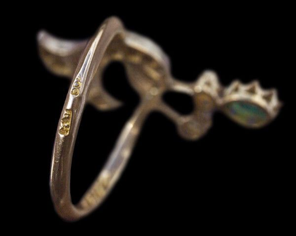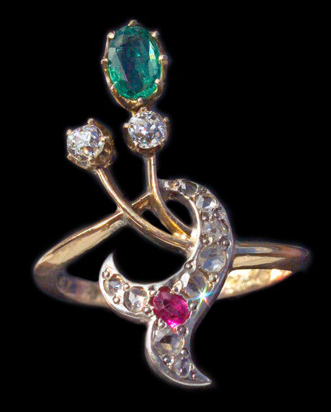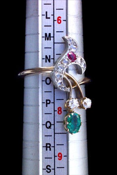 Emerald 0.60 cts approx, two old cut diamonds 0.2 cts approx, Nine rose cut diamonds 0.25 cts approx, ruby 0.08 cts approx. An ideal engagement ring