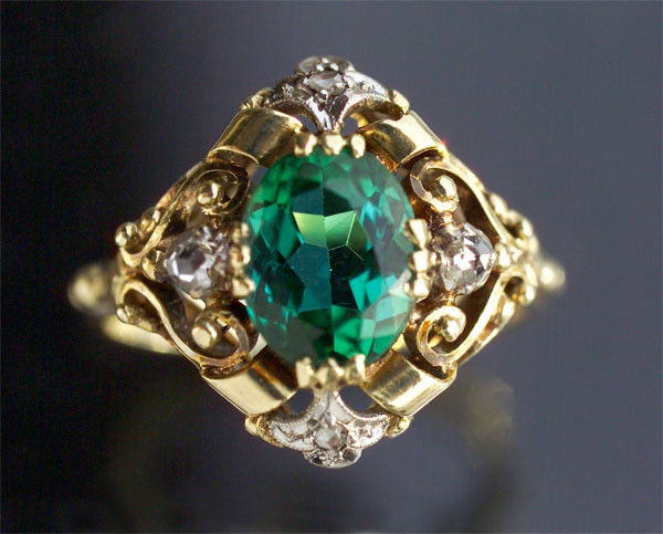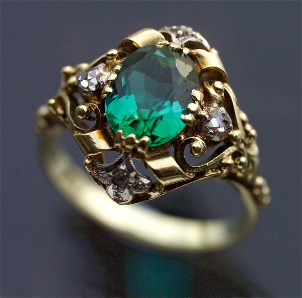 Very good colour tourmaline 1.75 cts approx. Slight ware to the facial facets. Top table fine No visual inclusions by eye Rose cut diamonds 0.16 cts approx.