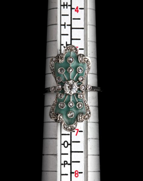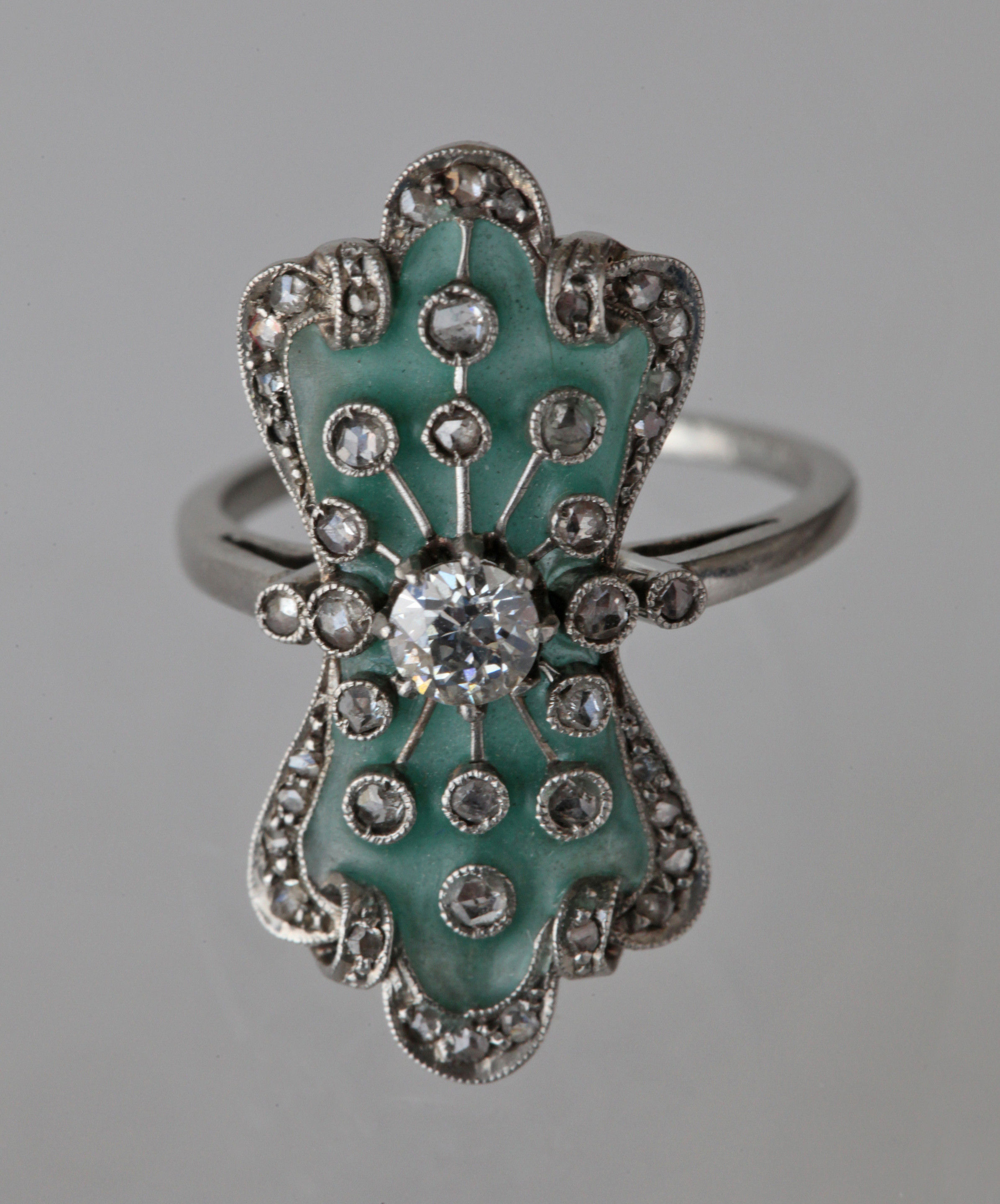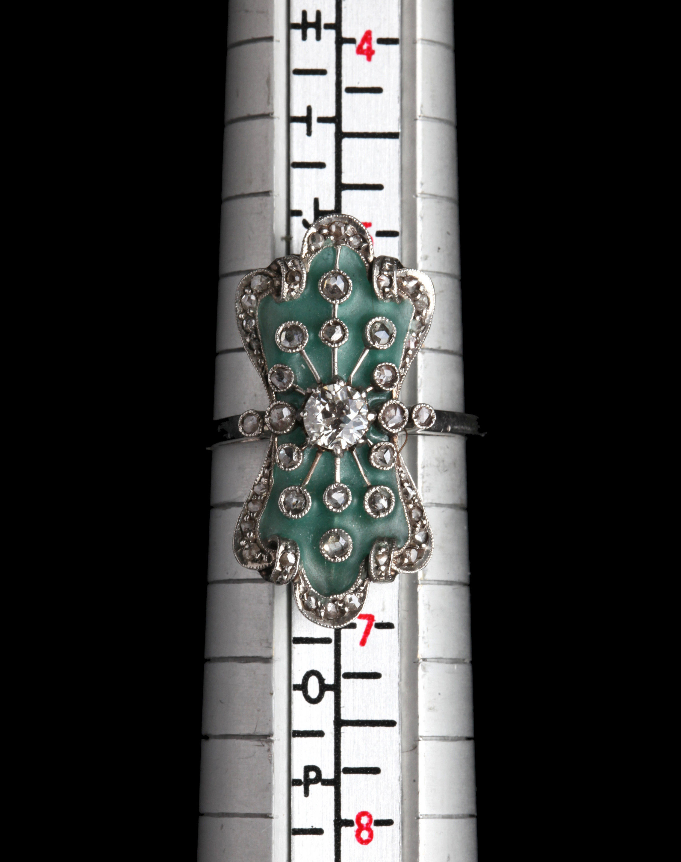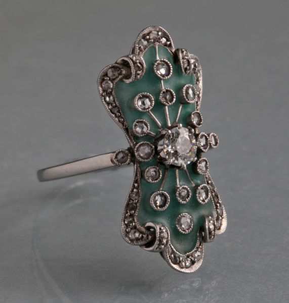Elegant Belle Epoque ring in plique-à-jour enamel & diamond, probably French. Central diamond 0.25 cts approx with 42 surrounding diamonds.