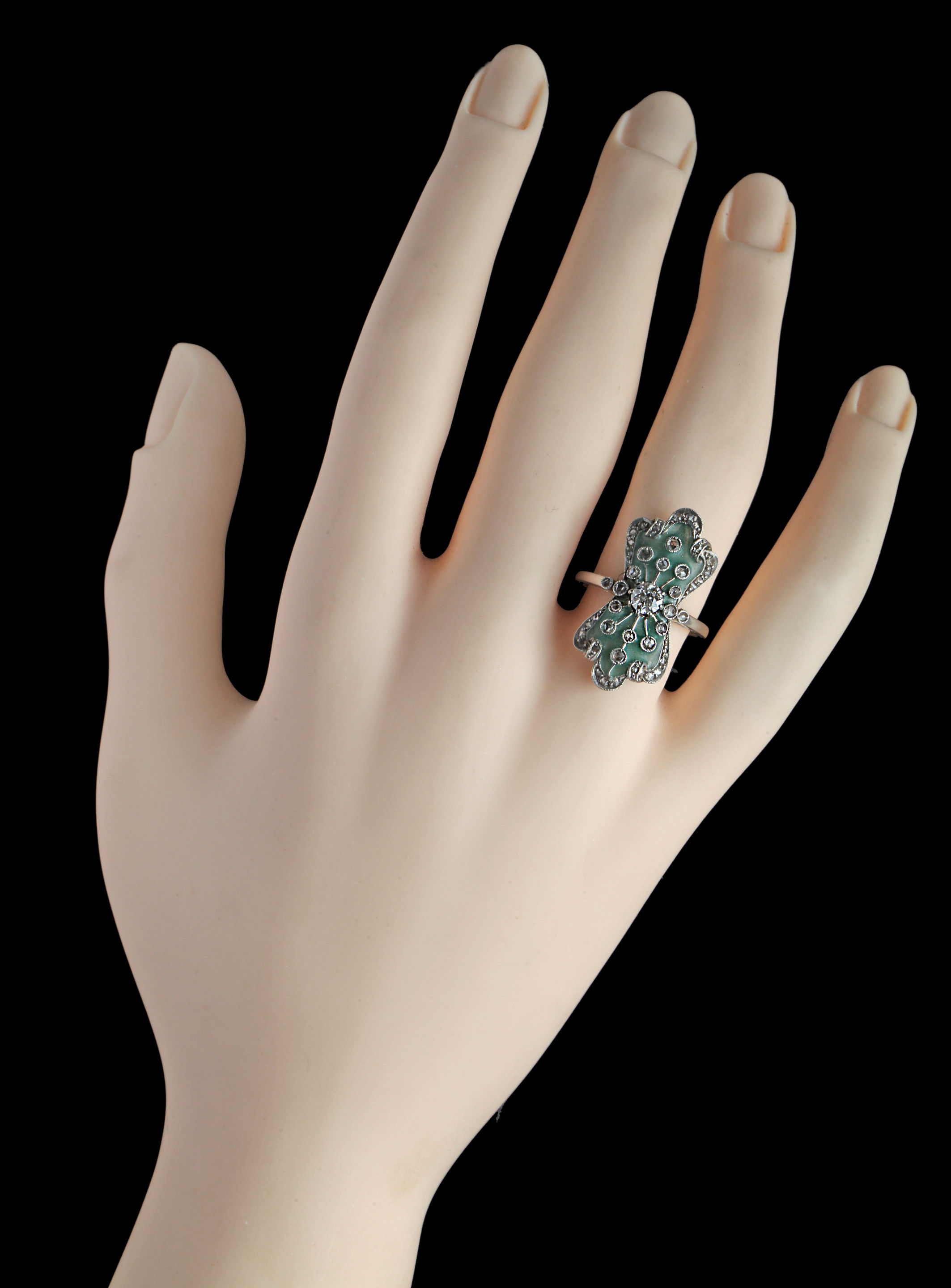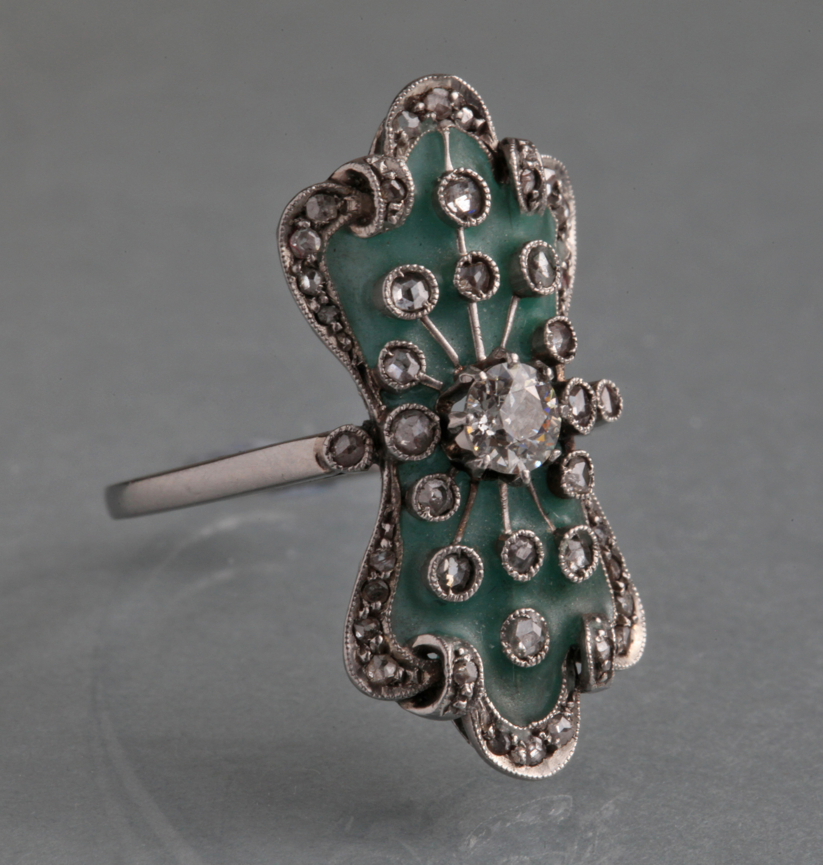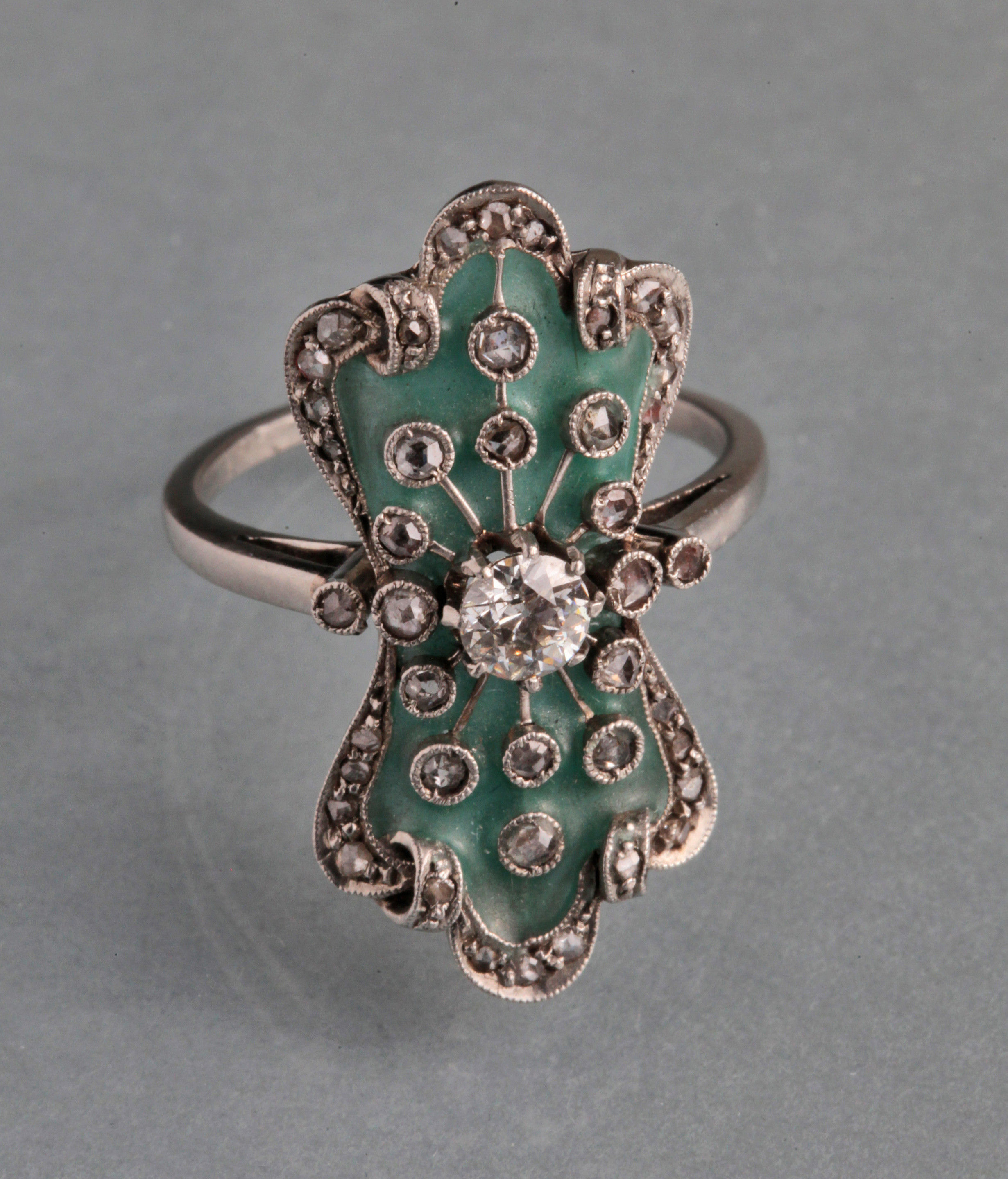 Elegant Belle Epoque ring in plique-à-jour enamel & diamond, probably French. Central diamond 0.25 cts approx with 42 surrounding diamonds.