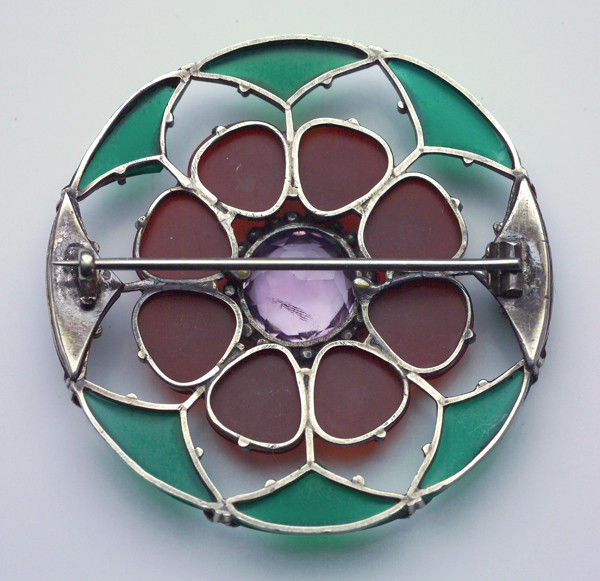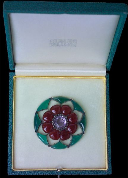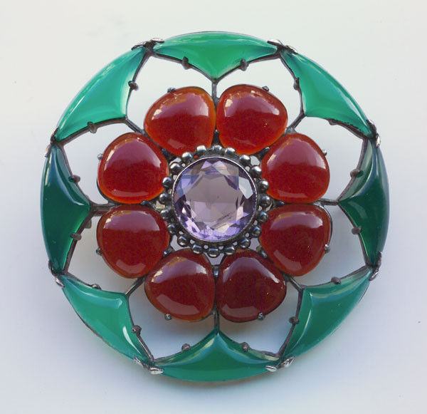The design echos a Gothic Rose window with the setting of translucent agates producing a plique a jour effect