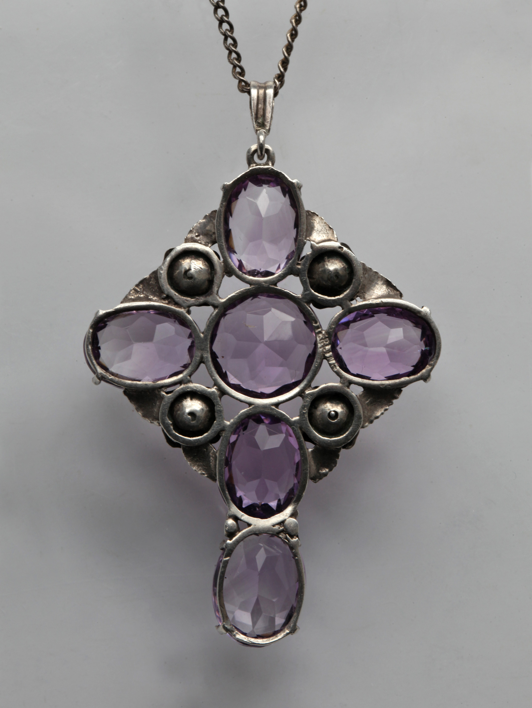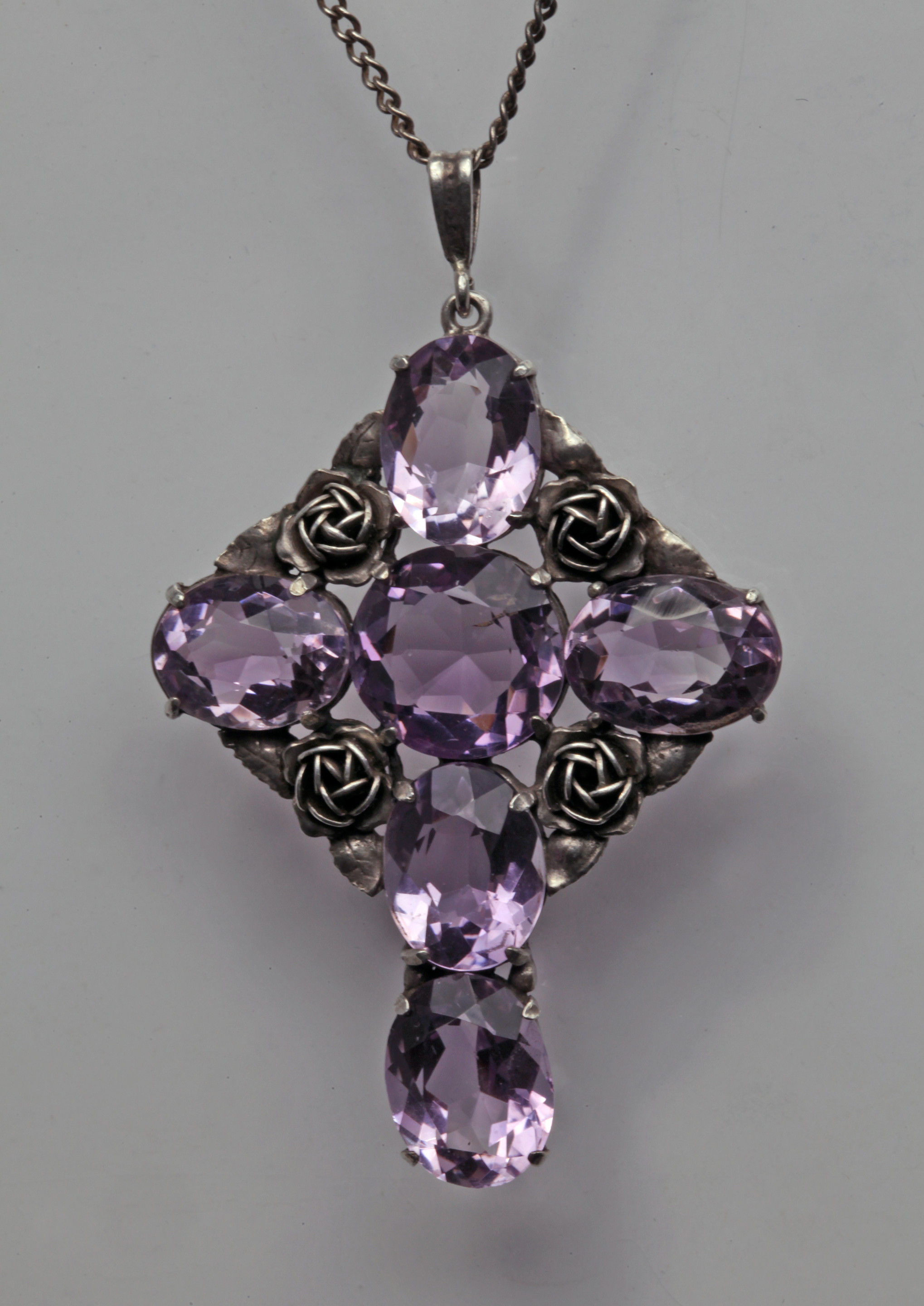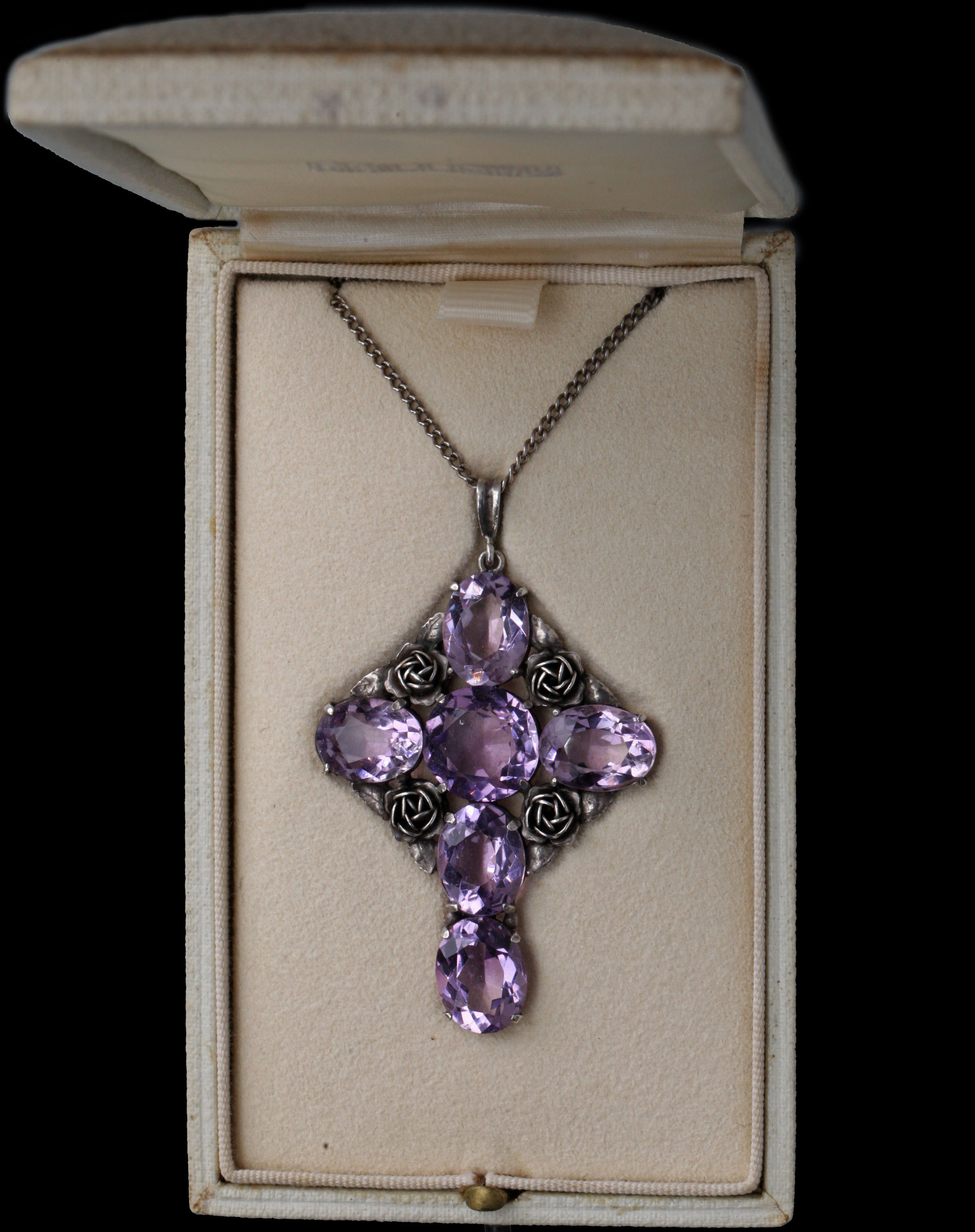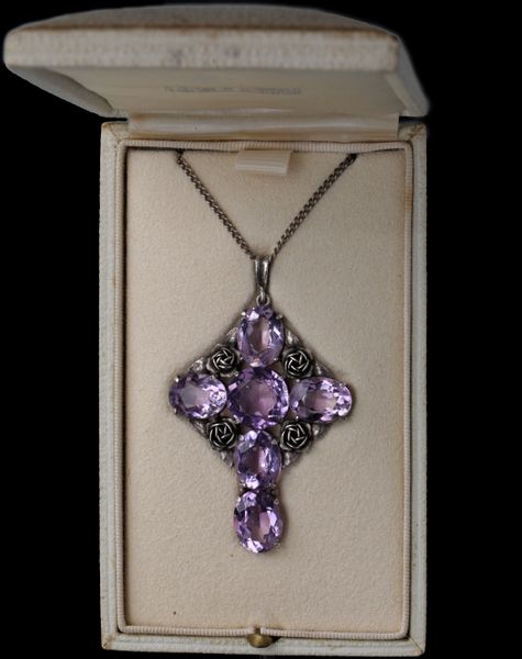 A lovely Arts & Crafts silver & amethyst cross decorated with roses.