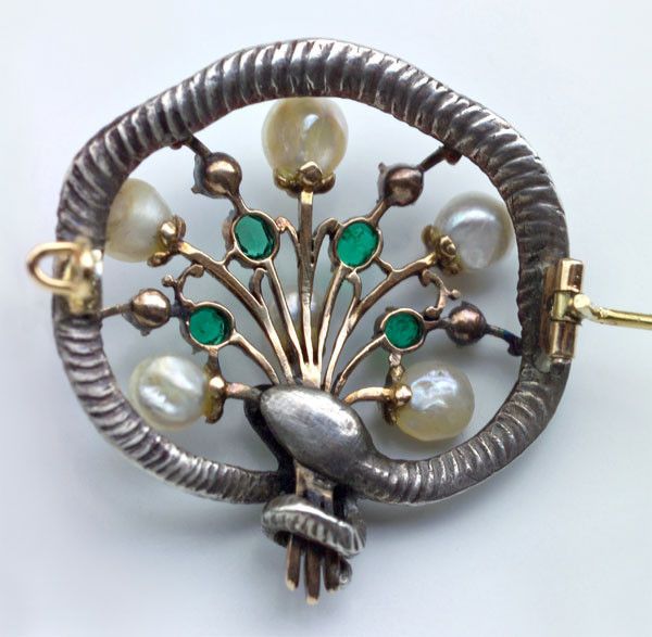 Silver, gold, emeralds, diamonds, pearls