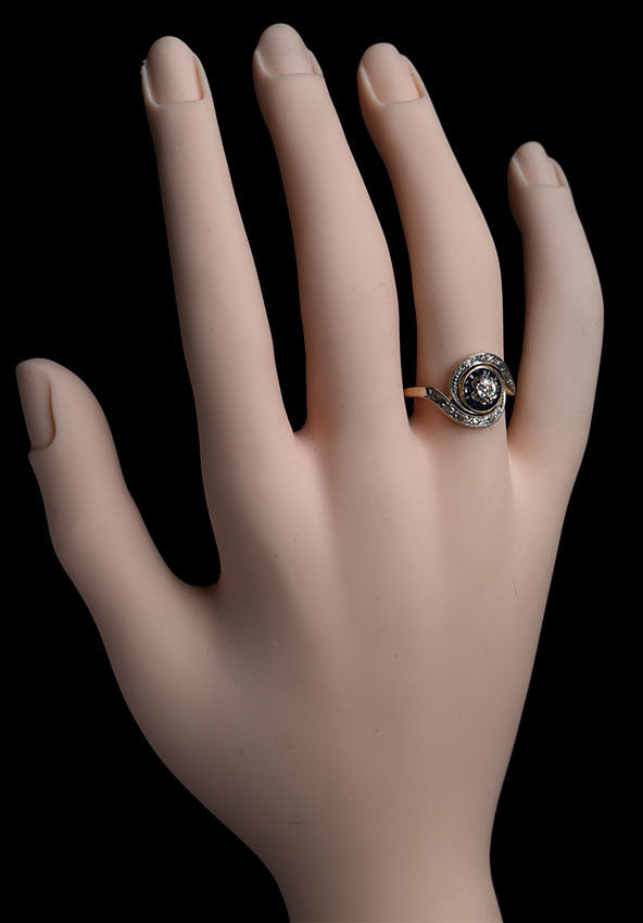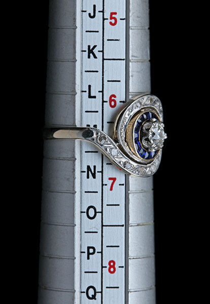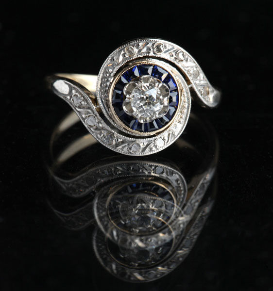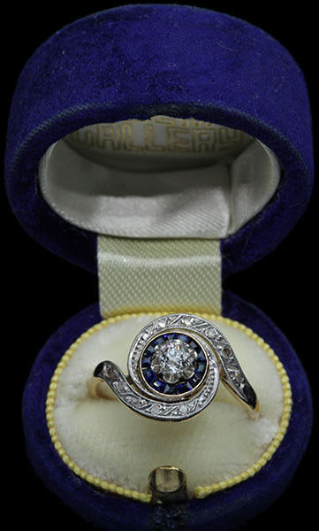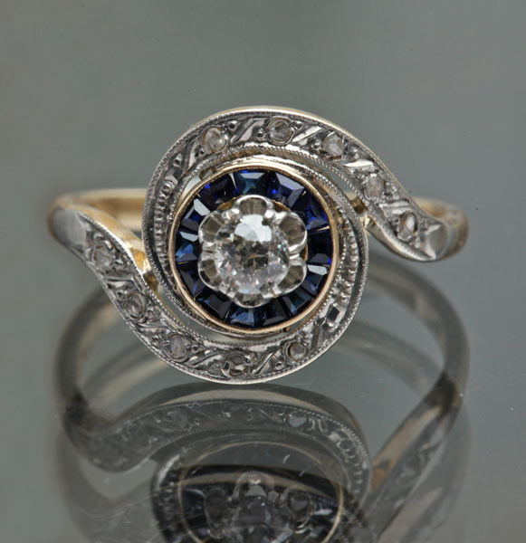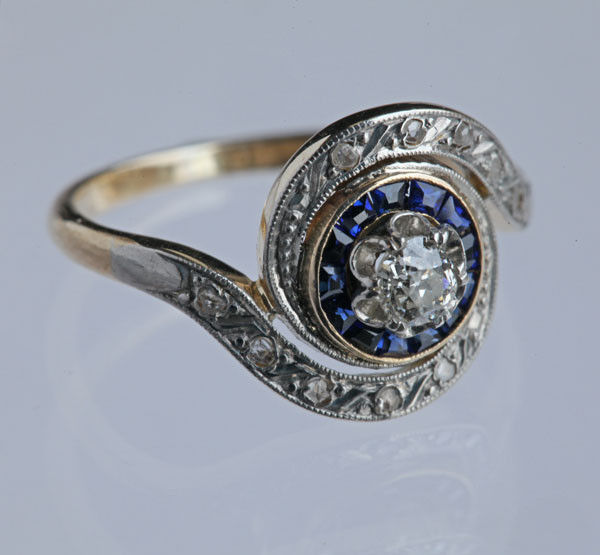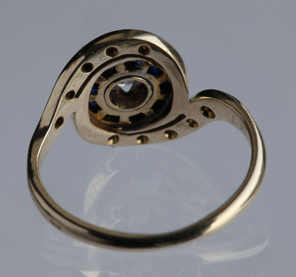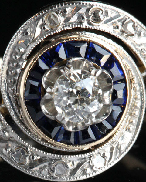 10 x rose cut diamonds 1 x old cut diamond 0.20 centre surrounded by 14 sapphires
