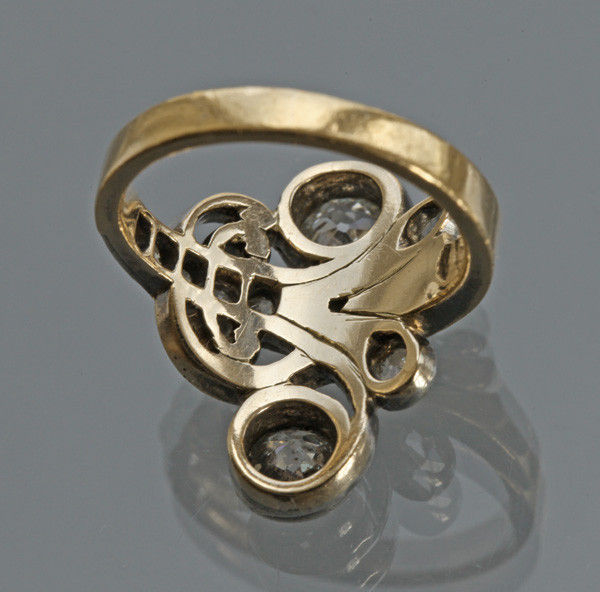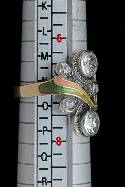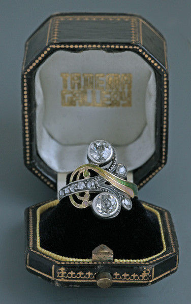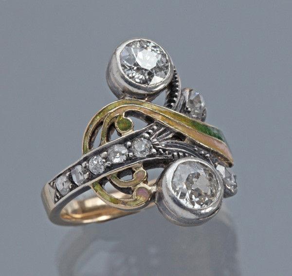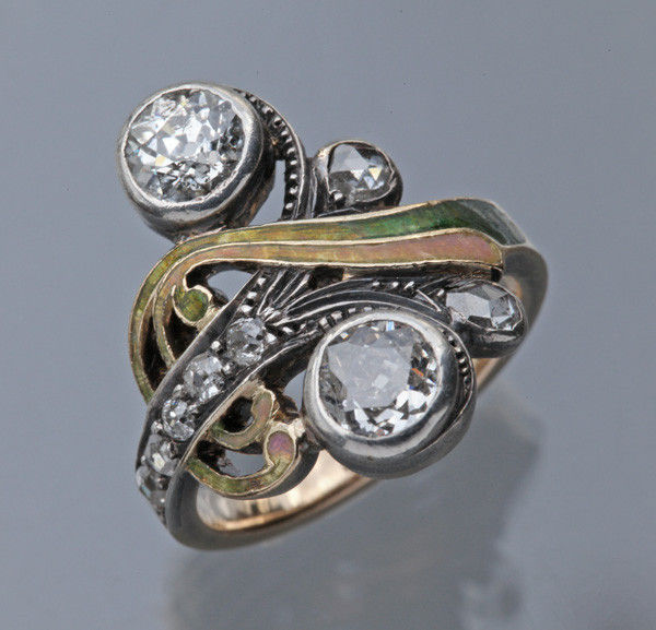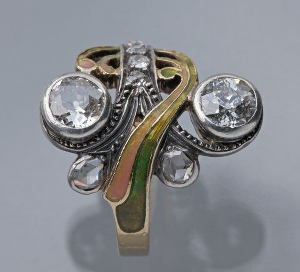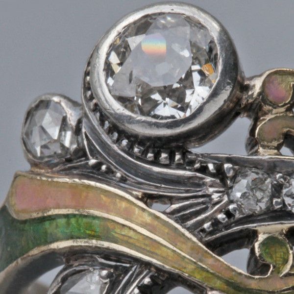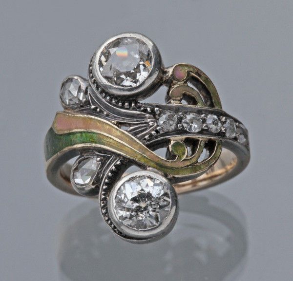 2 old cut diamonds 1.50 cts approx & 7 rose cut diamonds 0.25 cts approx encompassing the central ribbon featuture in shades of apple & apricot enamel
