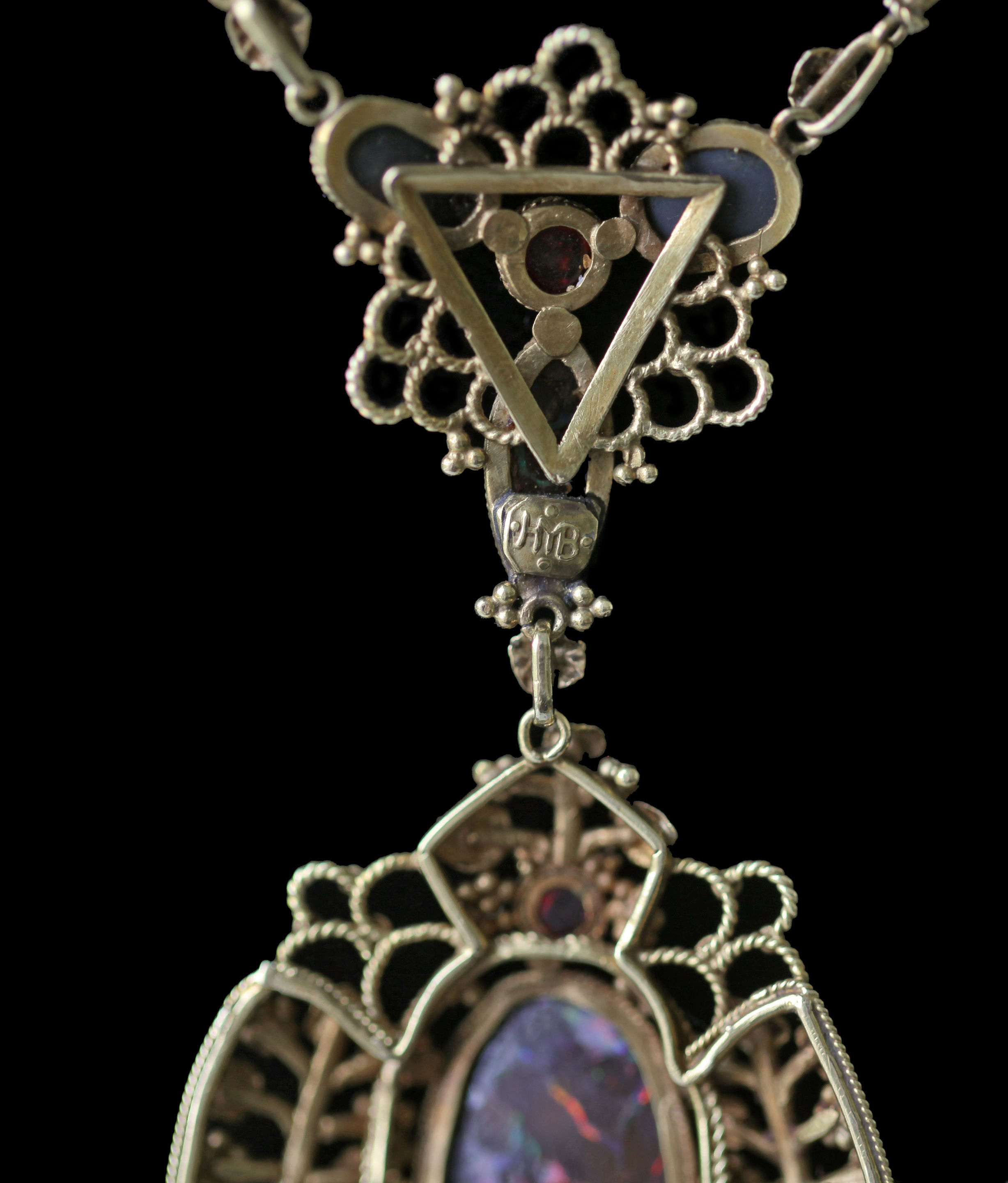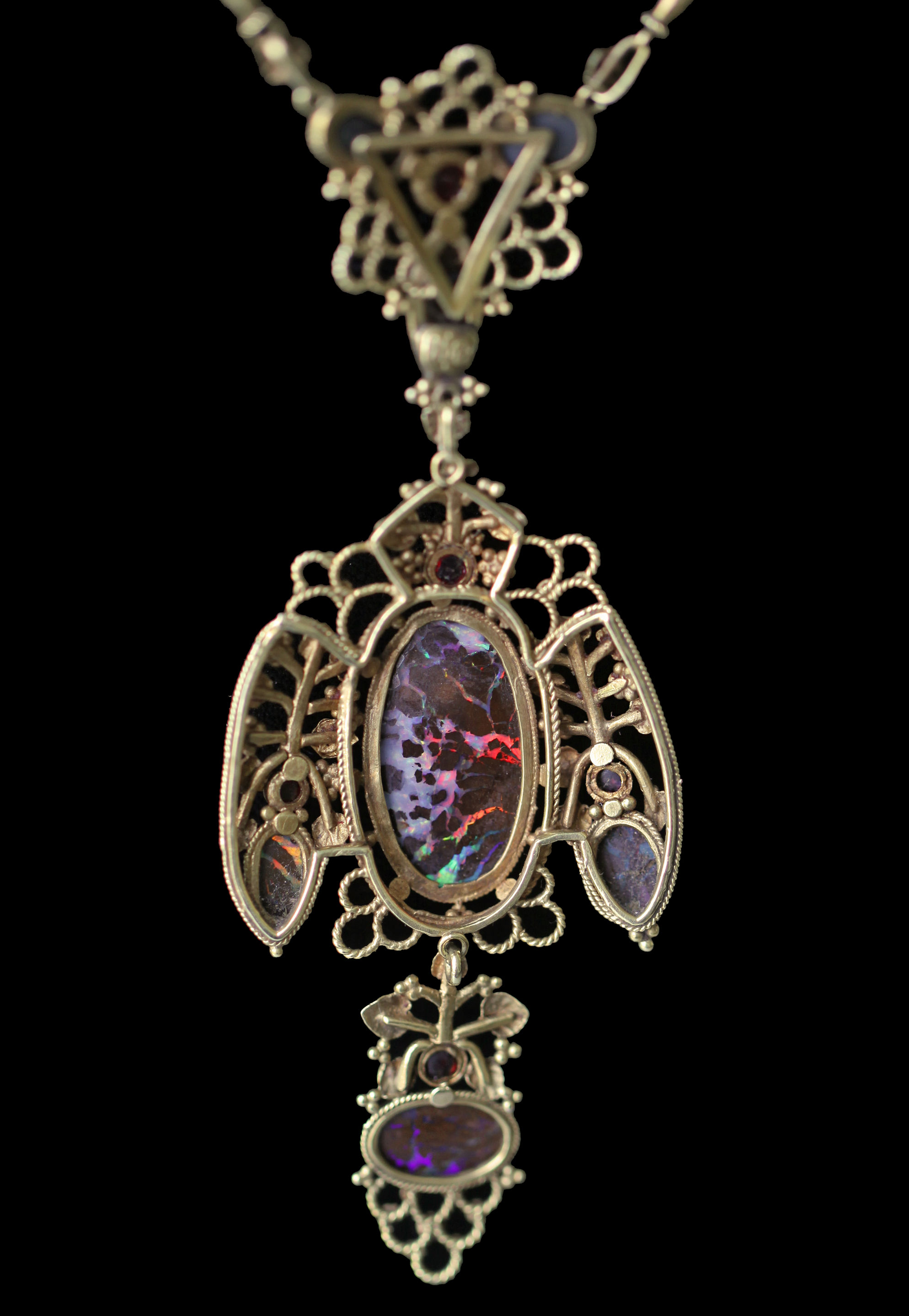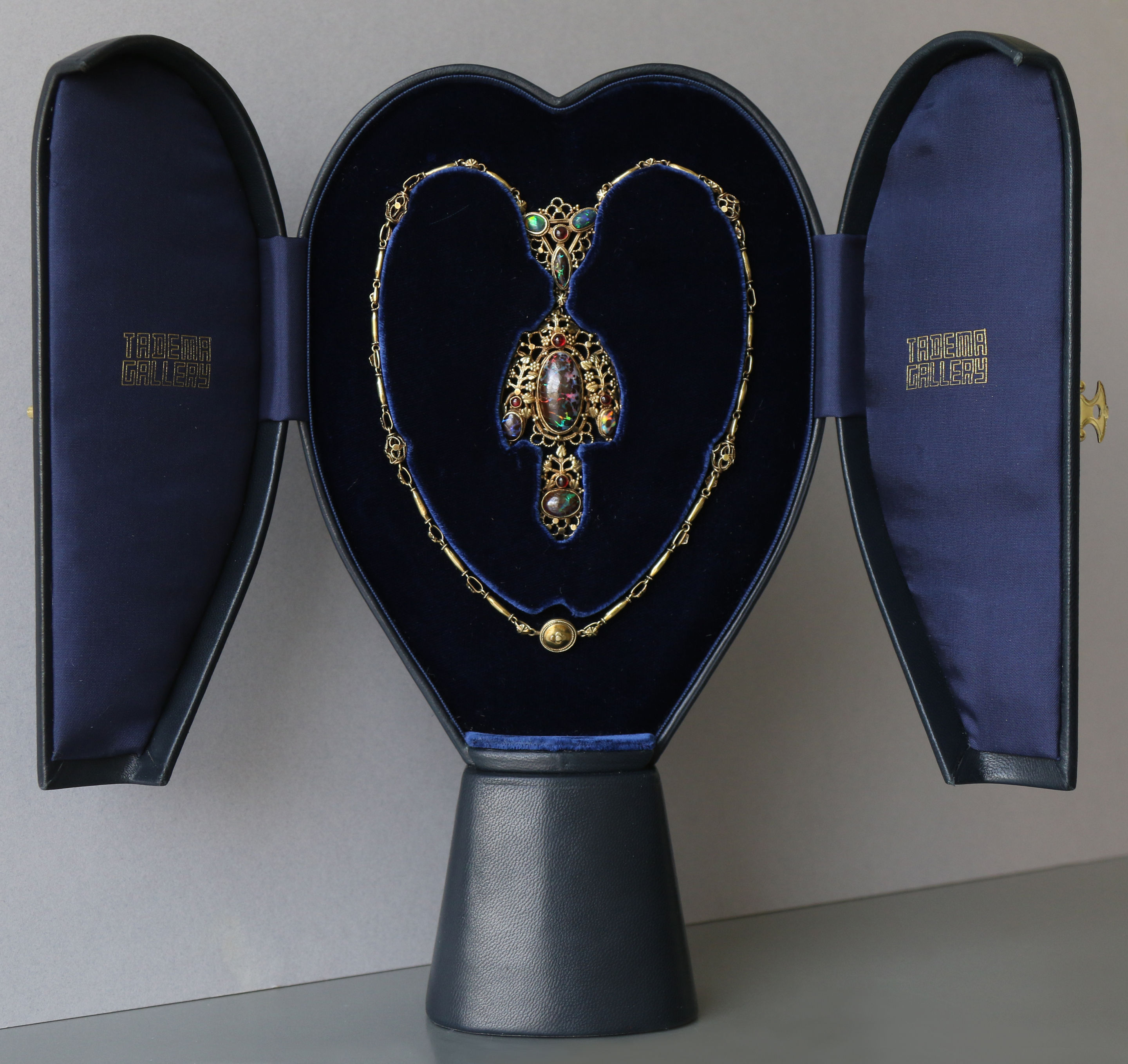 An unsigned design drawing for this necklace is in the Artificers' Guild archive belonging to the Goldsmiths' Company. It differs slightly from the finished necklace but pencil annotations on the sketch show the addition of the rubies and confirm that the opals belonged to the client.