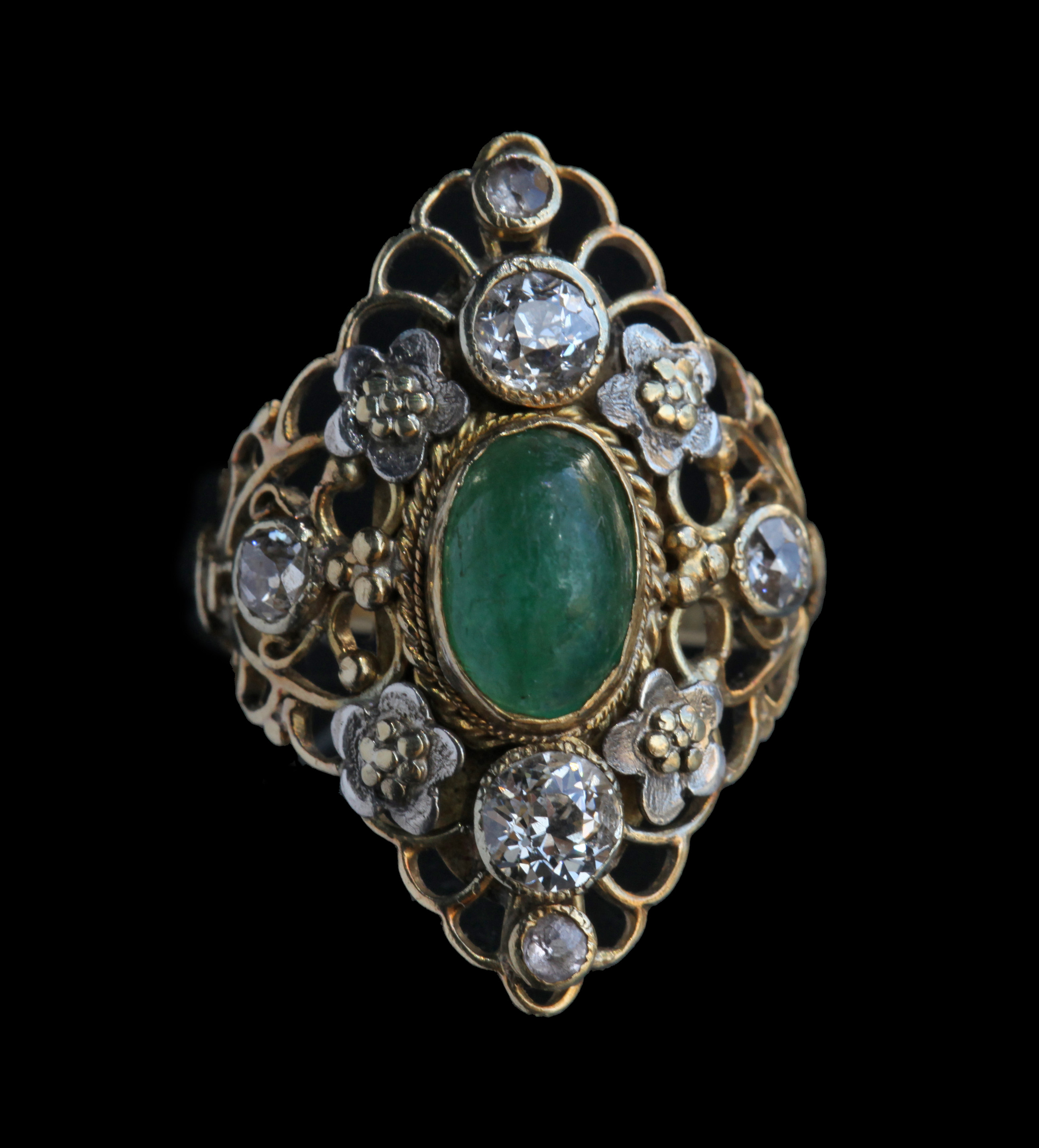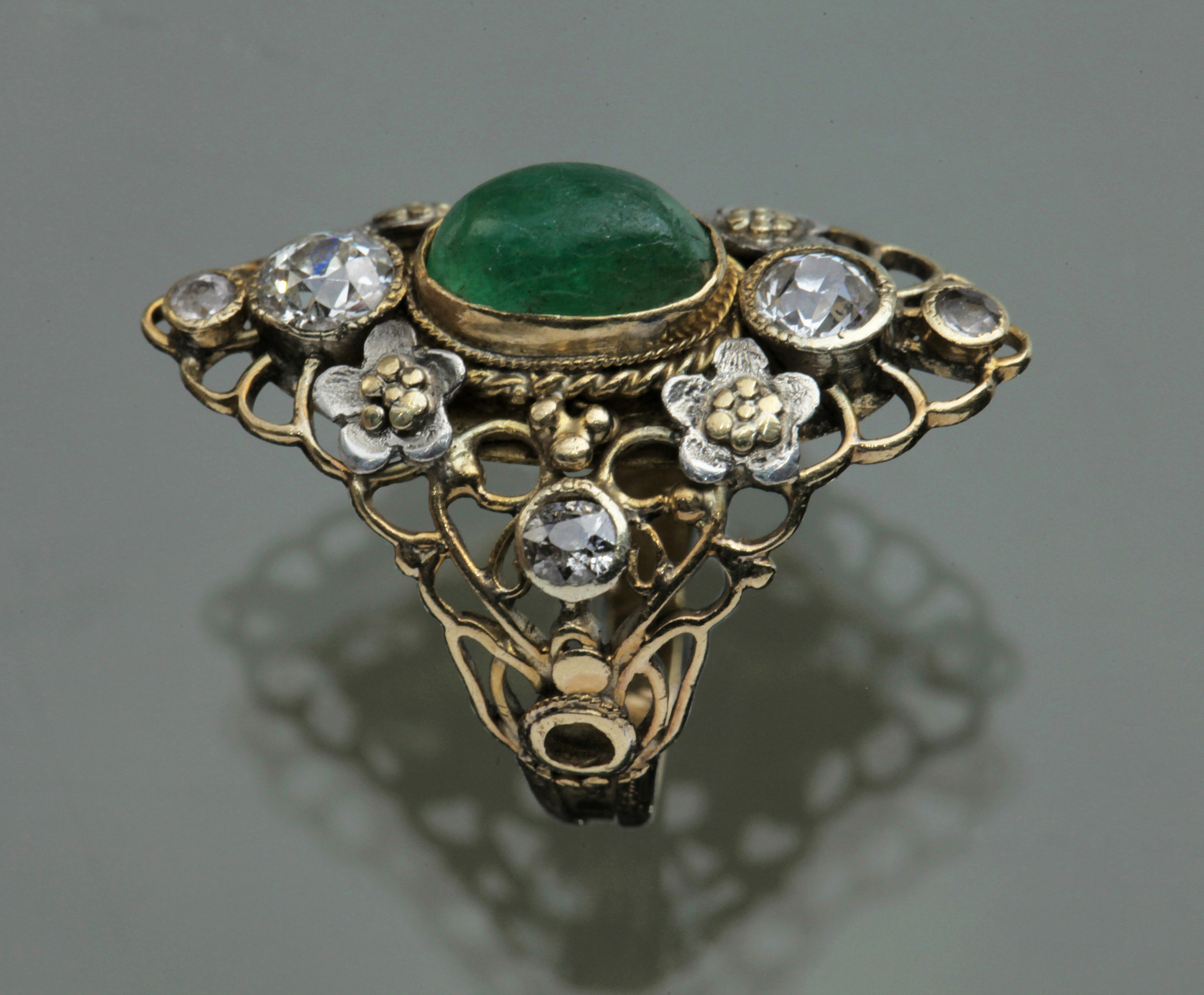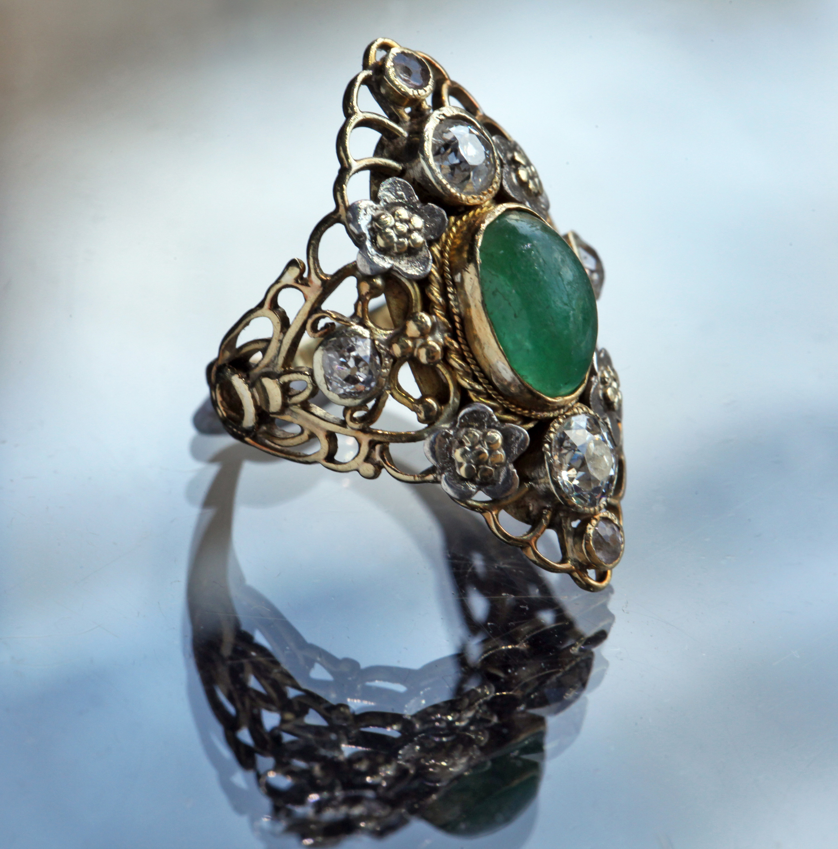 Emerald 1.25cts approx. Victorian cut diamonds 0.70 cts approx & two tiny crystals.