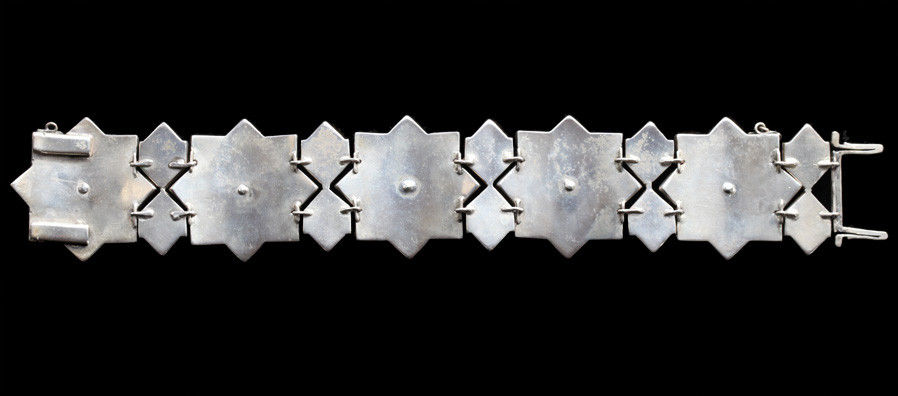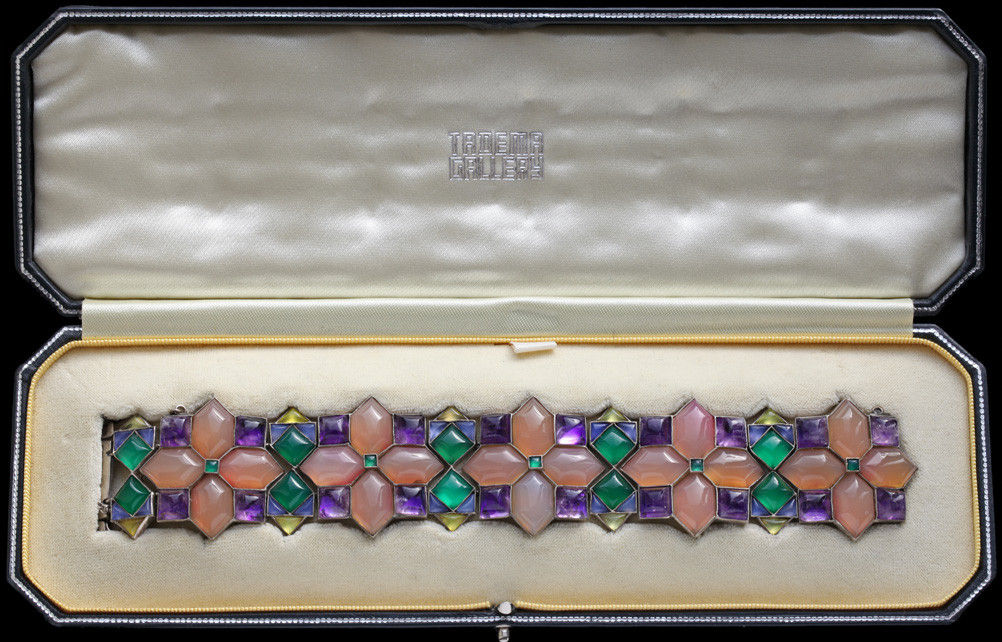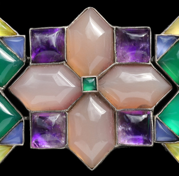 THE SIBYL DUNLOP ""CARPET OF GEMS"" STYLE Sibyl Dunlop jewellery and silverware, was mostly made, or supervised by Bill Nathanson. He sometimes referred to one of the design features of Sibyl Dunlop pieces as their ""carpet of colours"" or ""carpet of gems"" look. The key aspects of this look are: 1. A repeating pattern of closely interlocking stones that are set in collets with a single wall to hold adjacent stones. 2. The stones used in this way were cut in standardised sizes, colours, and shapes so that they could always be combined, and included more unusual shapes such as crescents, claws, chevrons, kite shapes, and triangles. This system of cutting stones dates from the late 1920s, and the ""carpet of gems"" look arose soon after. By the mid-1930s wide bracelets and neckpieces had been made in this way, as well as brooches, with elaborate carpet of gems patterns. Designs based on patterns of interlocking stones were never more than a small part of the firm's output.