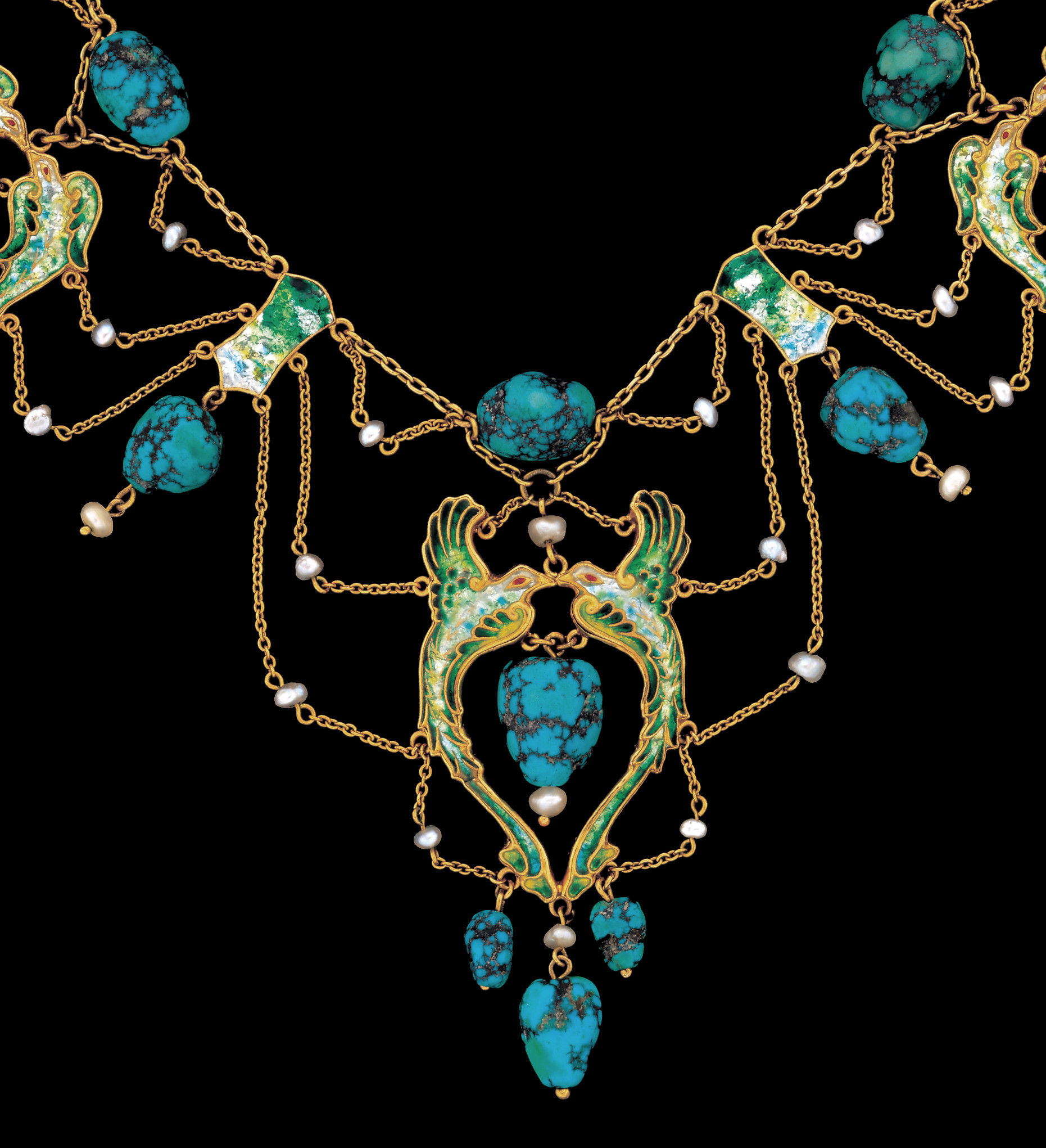 "Watts' greatest passion was the skilled enamelling of plaques, metalwork, and pieces of jewellery and this necklace is a rare example of his mature work. Carefully balanced, festooned chains interspersed with tiny freshwater pearls support foiled enamel pendants and turquoise stones. His enamelling skills are apparent in the remarkable depth and brilliance of colour of the pendants, shading from palest blue to bright turquoise. Here he has utilised his favoured foiled enamelling to achieve such delicacy of tone and detail. In this technique layers of translucent colour were slowly built upon a ground of textured metal. Each layer of colour, mixed with oil or water, was applied and fired individually to create the desired effect and the temperature carefully monitored to ensure that the previous work was not damaged." Aberdeen Art Gallery