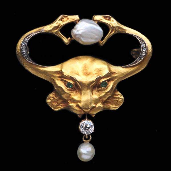 Symbolist Brooch in the form of a cheetah's head crowned with two serpents attributed to Lucien Hirtz