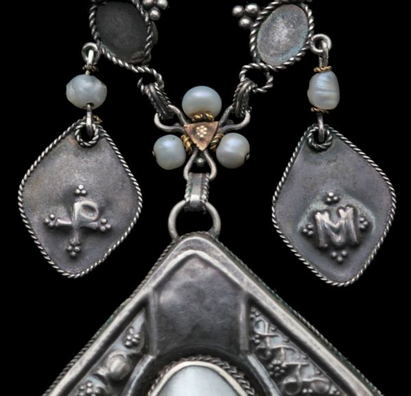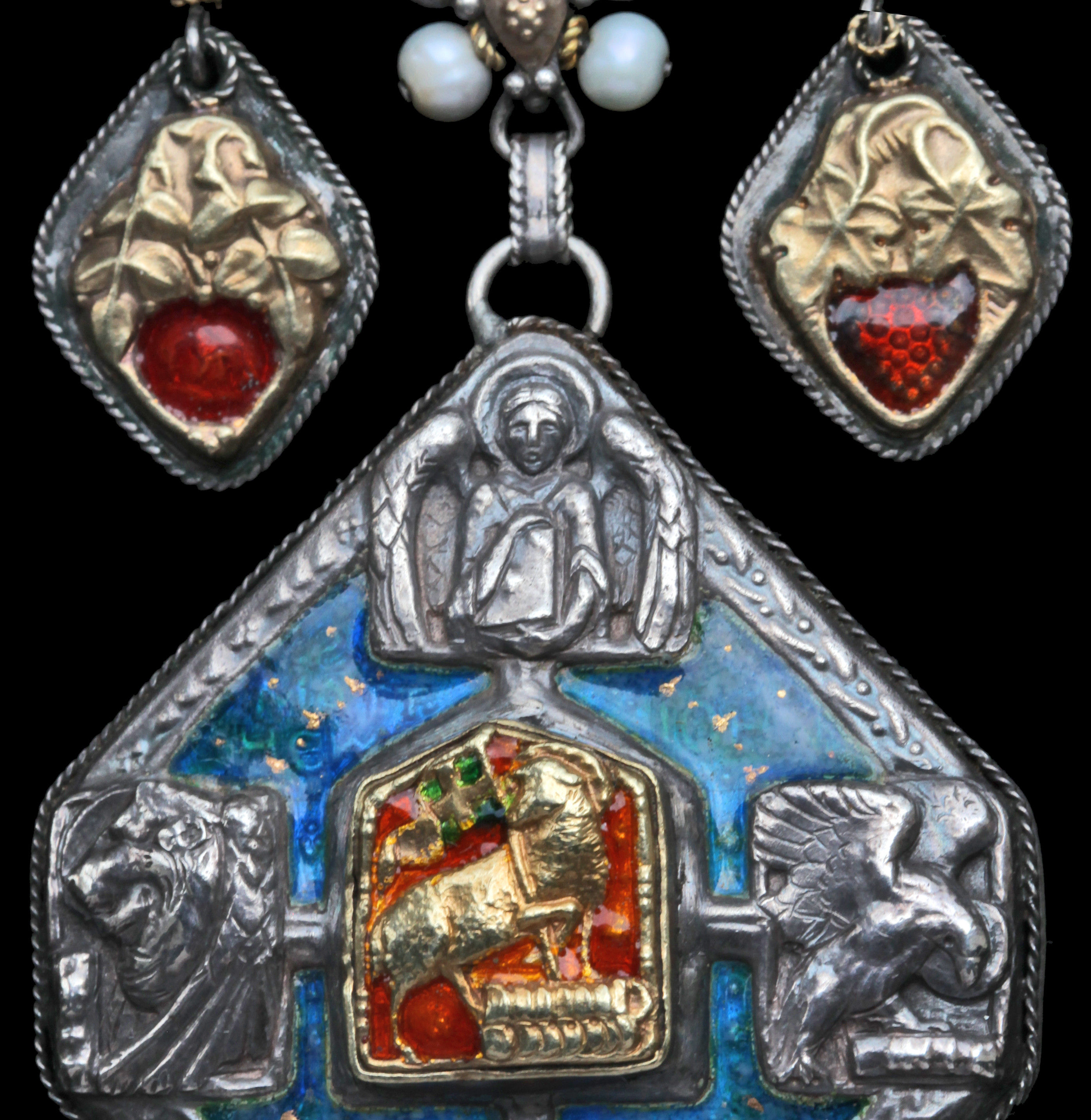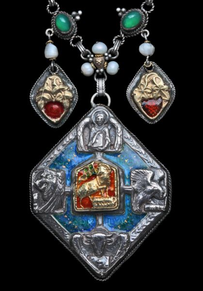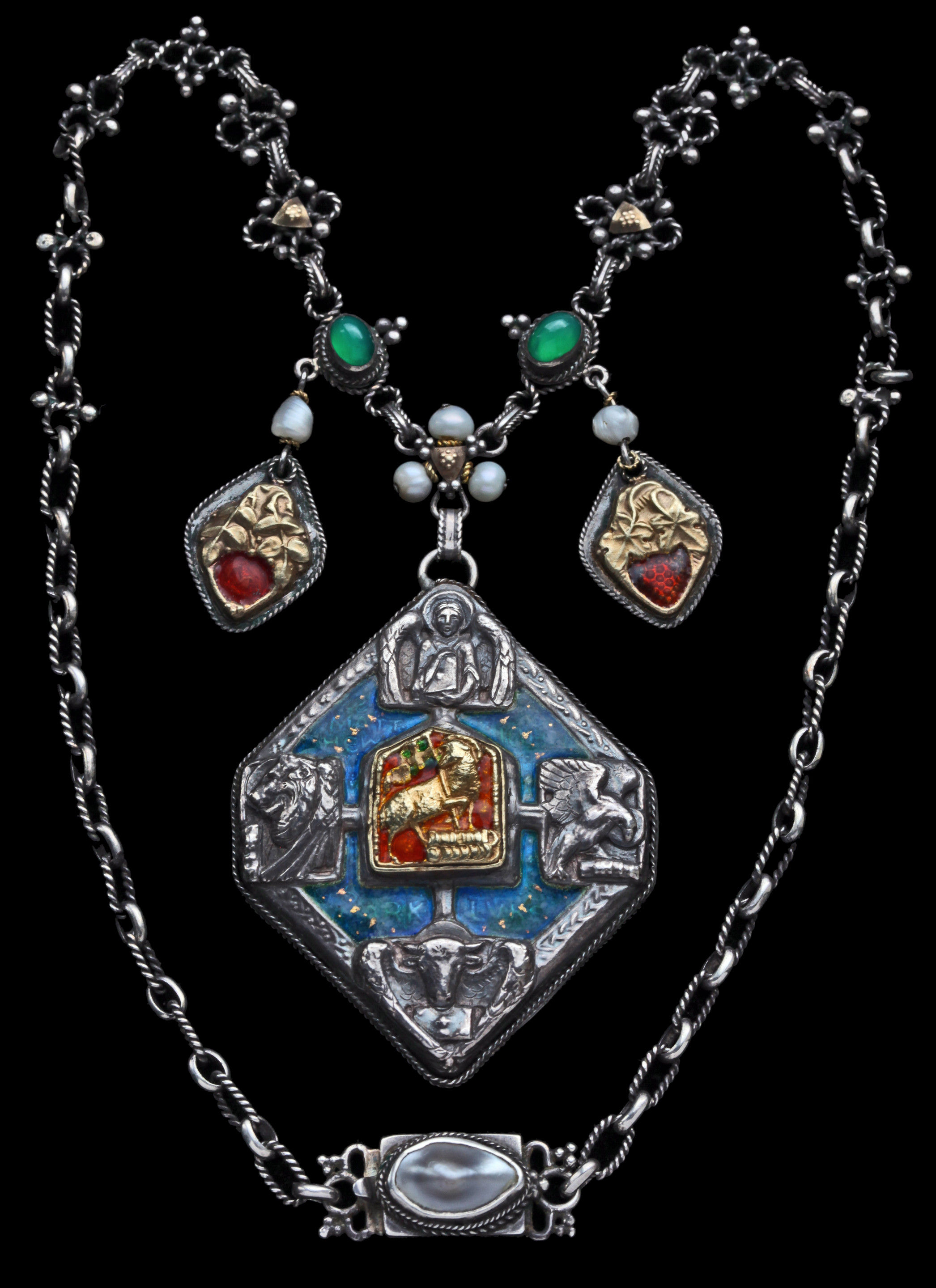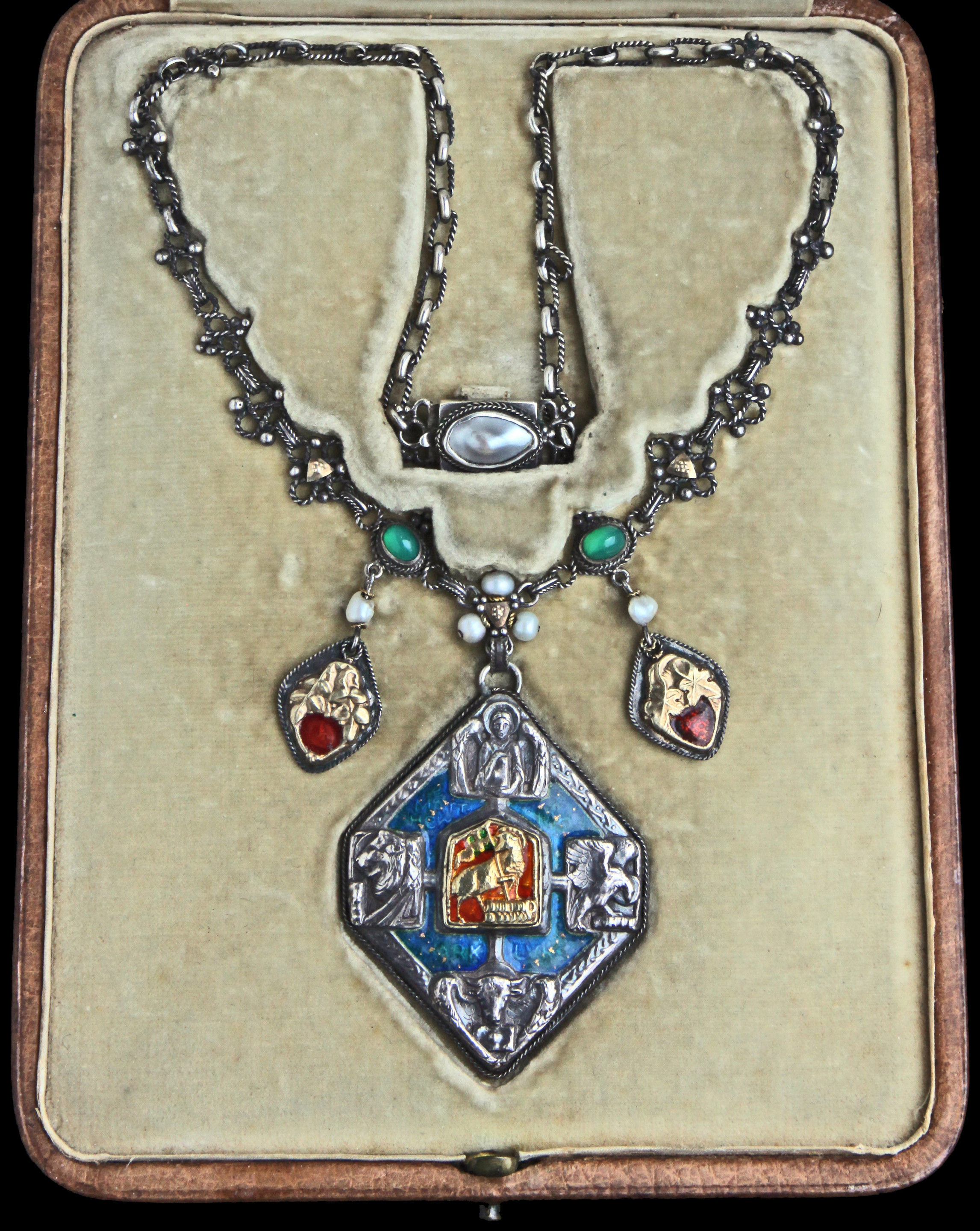 Beautiful documented Arts & Crafts necklace by John Bonnor incorporating the idea of the Holy Trinity (the three Welsh pearls) Eternity (green stones) Agnus Dei & symbols of the four Evangelists. The small pendants the Rose & the Vine