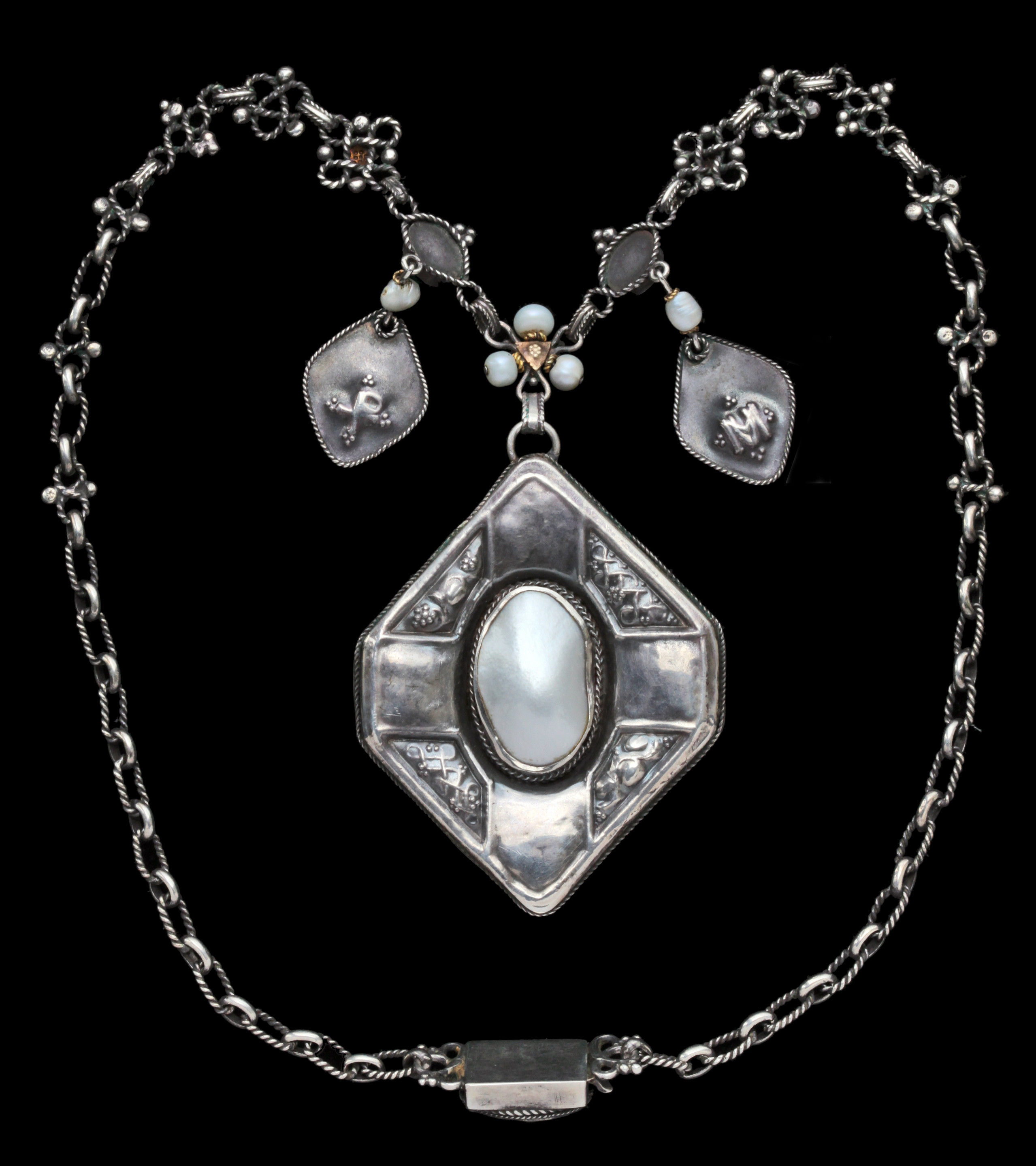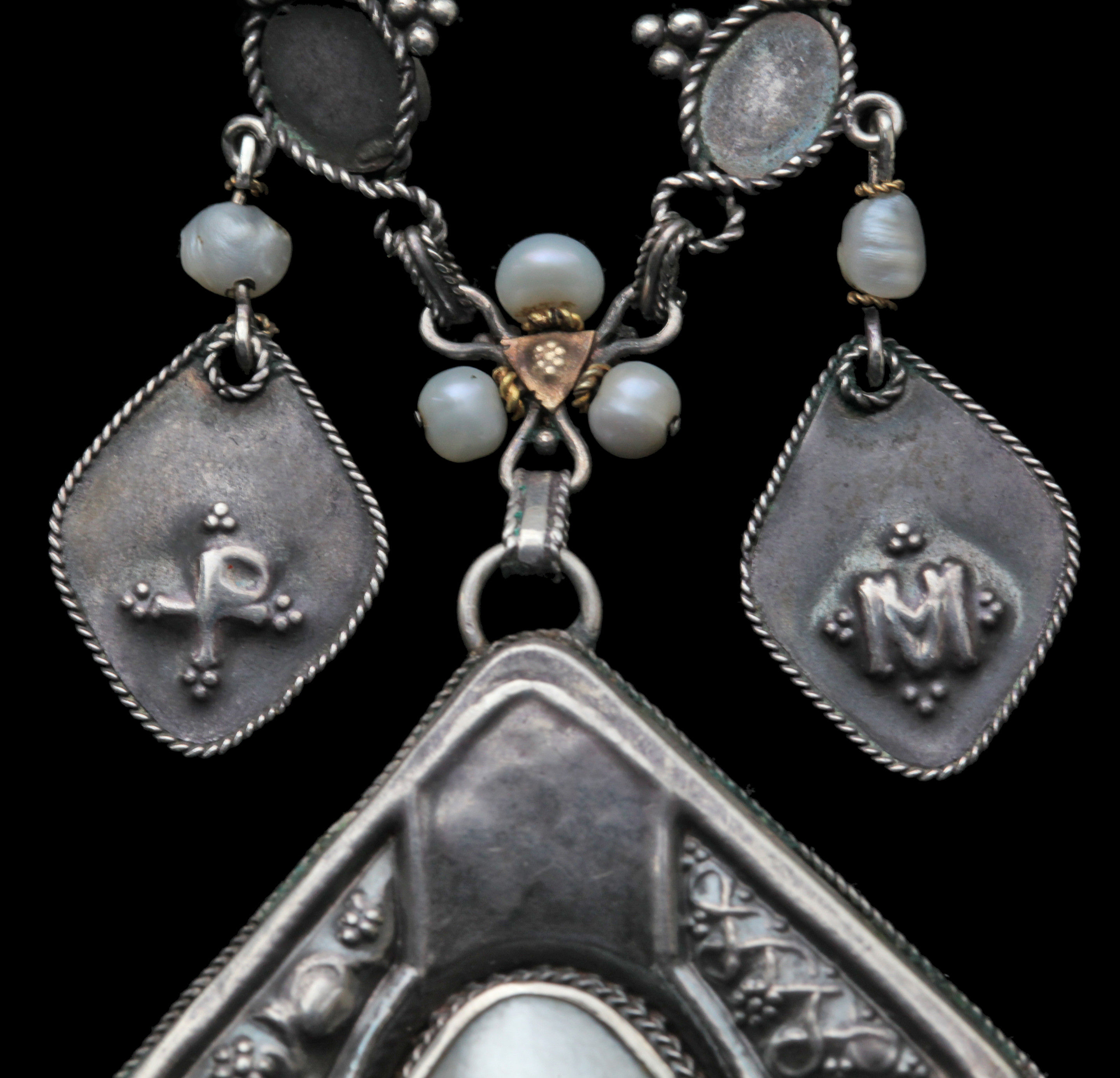 Silver, gold, enamel, pearls & chalcedonies