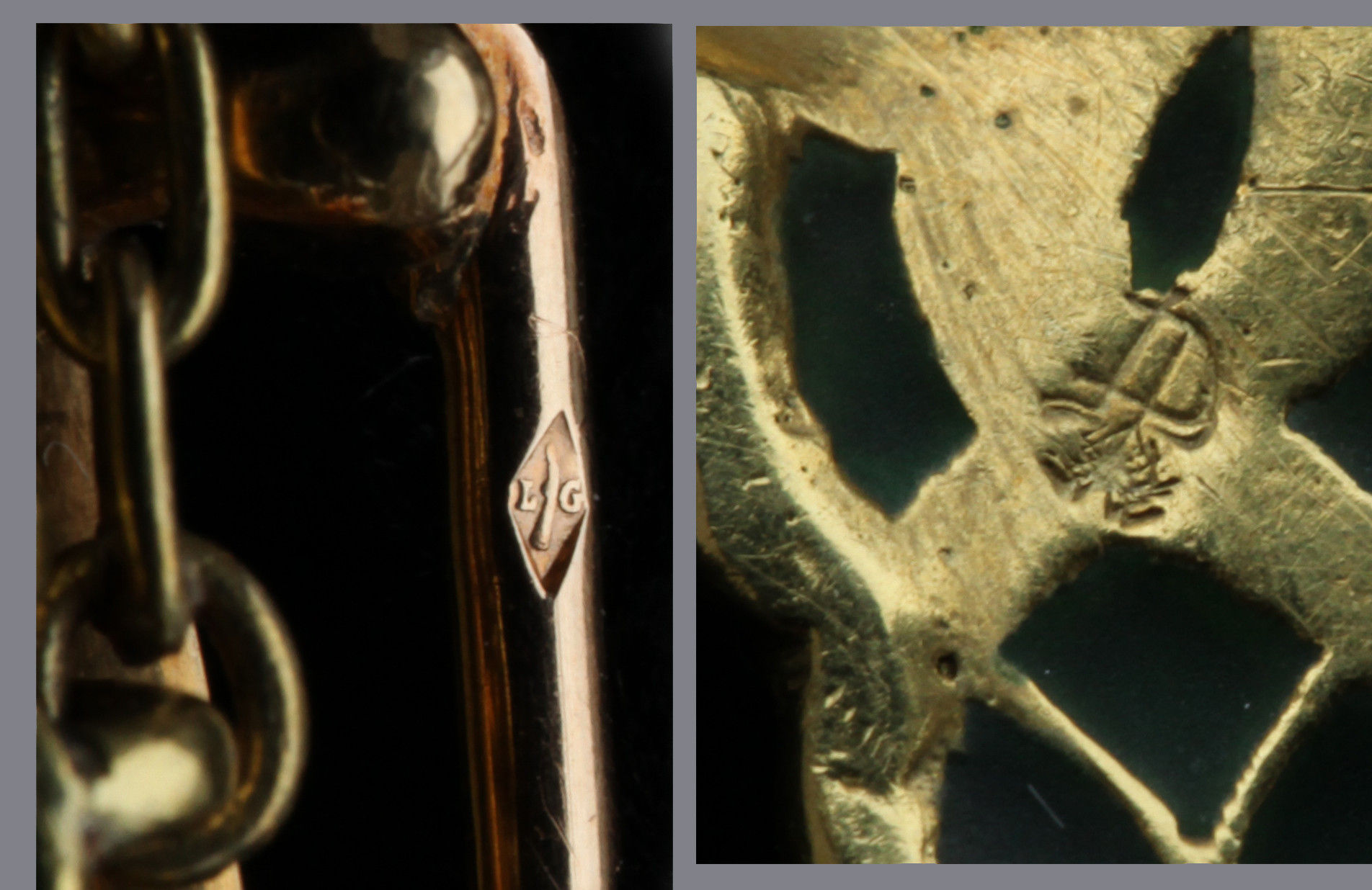 | Marks | Signed verso with monogram ‘JD’ for Joe Descomps. The brooch pin marked LG flanking a horn for Leon Gariod |