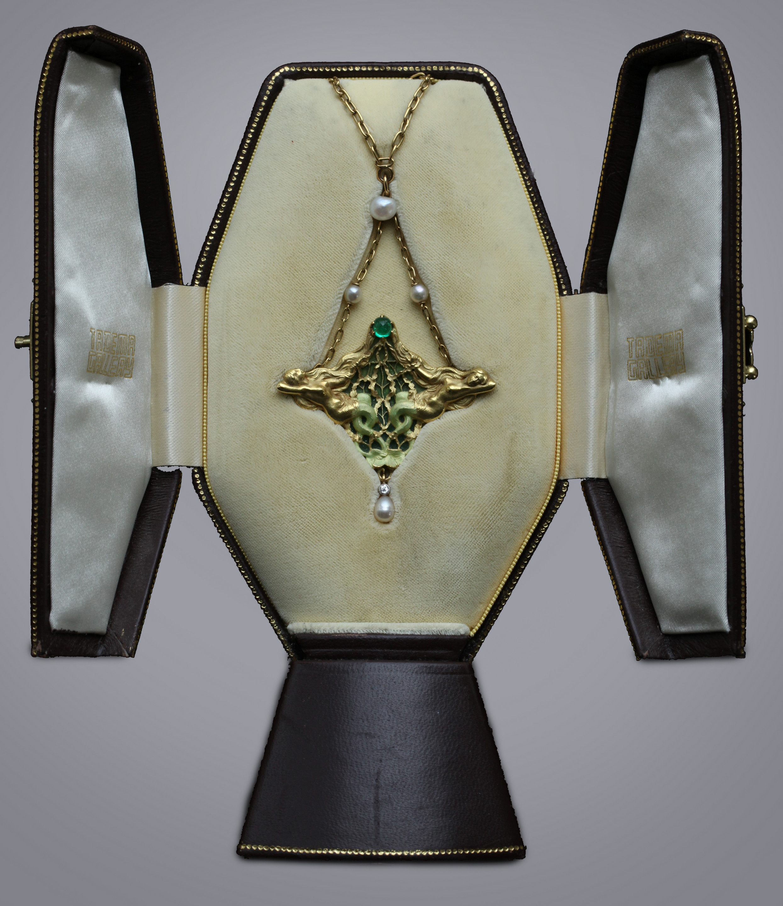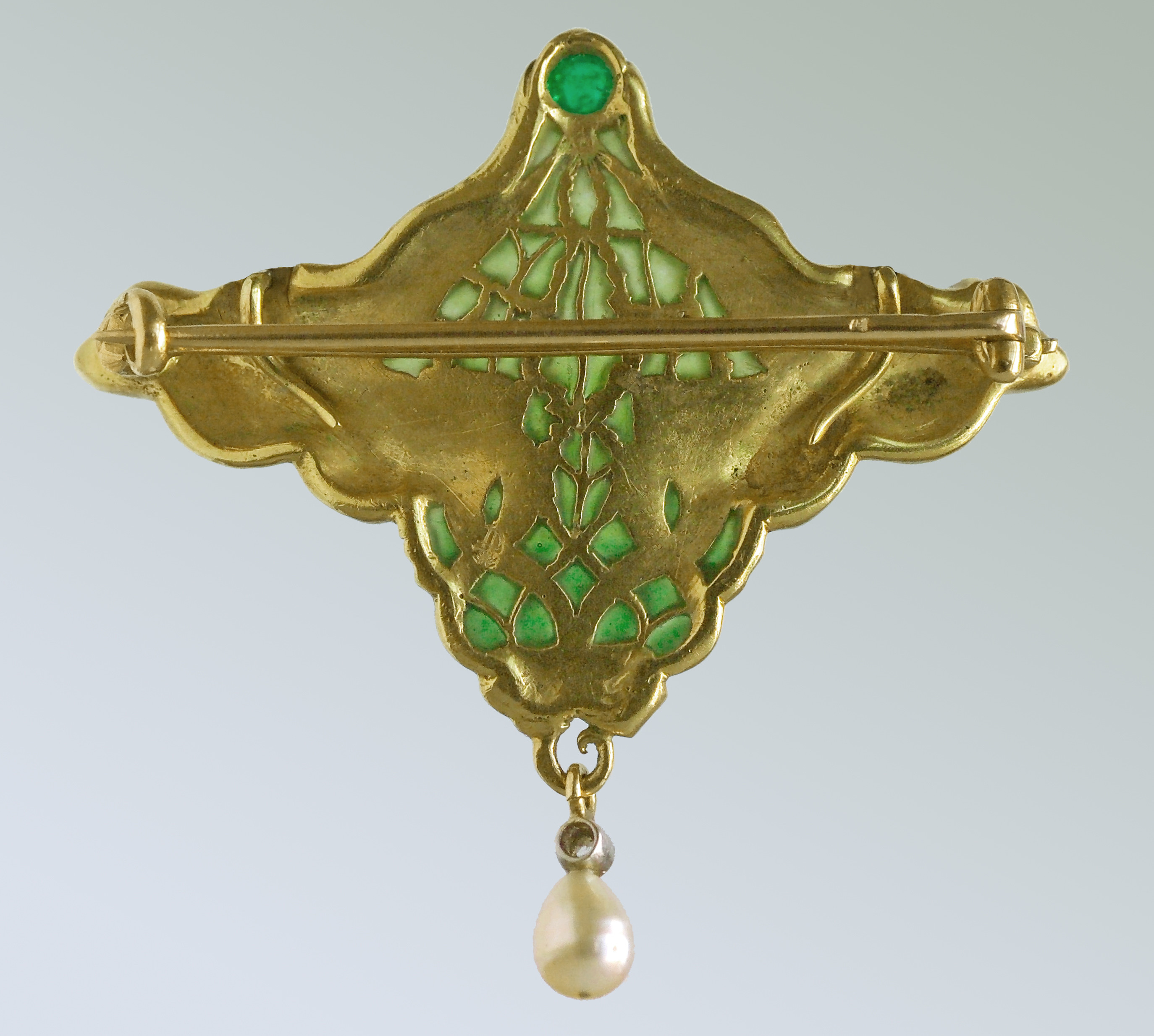 Gold, plique-a- jour enamel, emerald, diamond & pearl