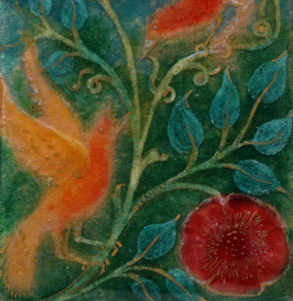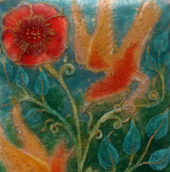 Superb enamel with Birds of Paradise, Hollyhocks & Poppies