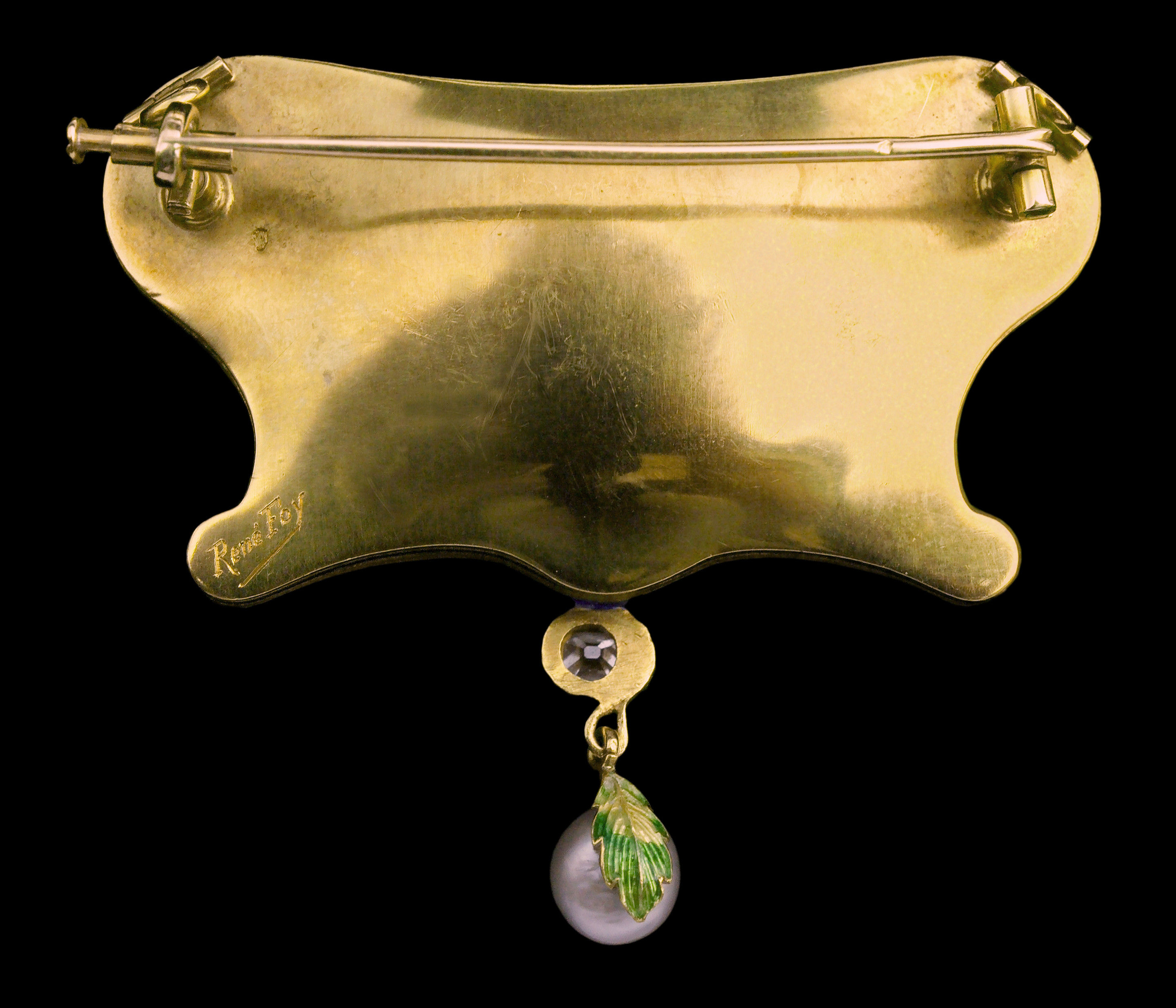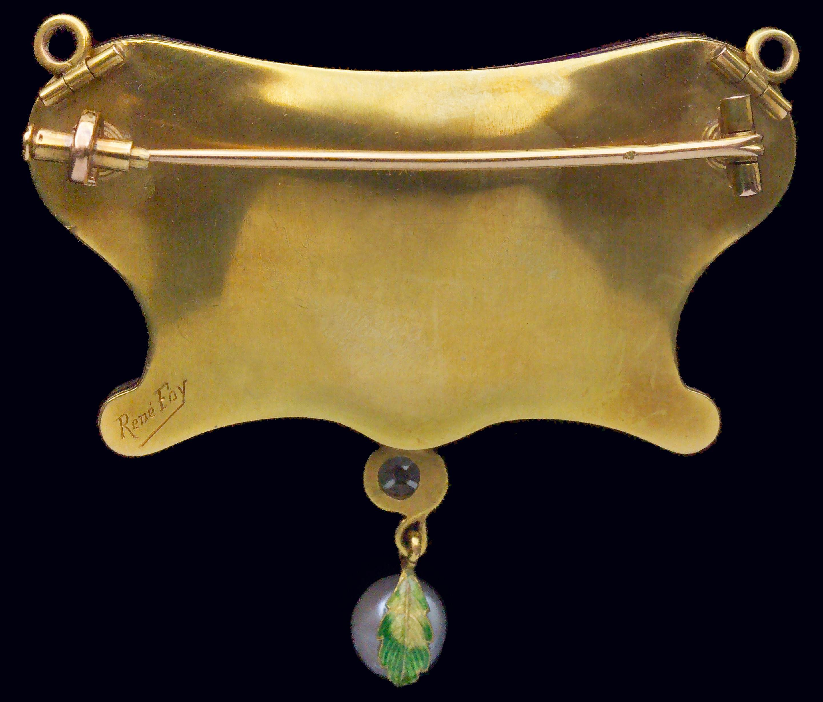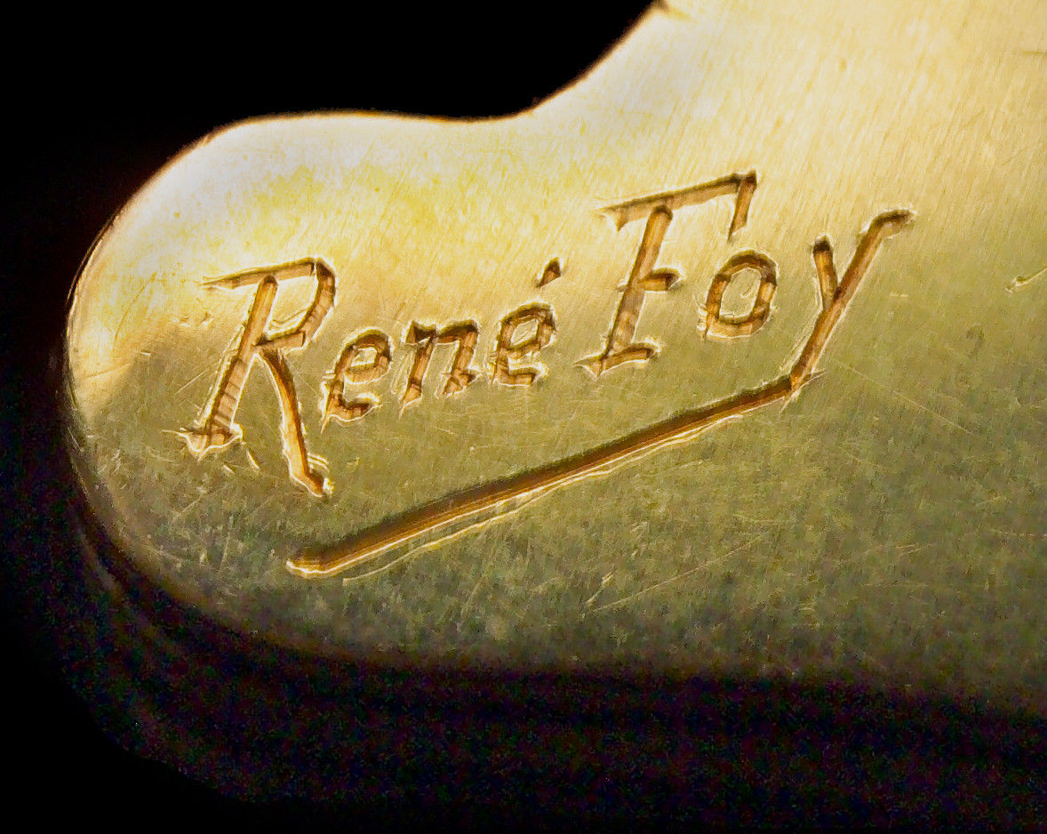 | Marks | Signature 'René Foy' (engraved) on reverse of brooch. The pin with eagle's head & makers mark |