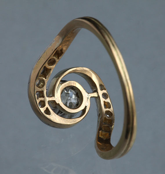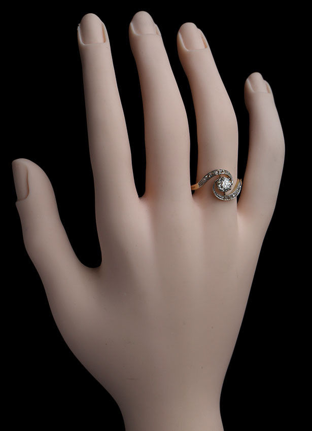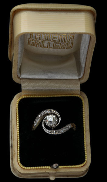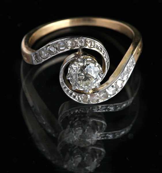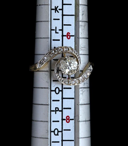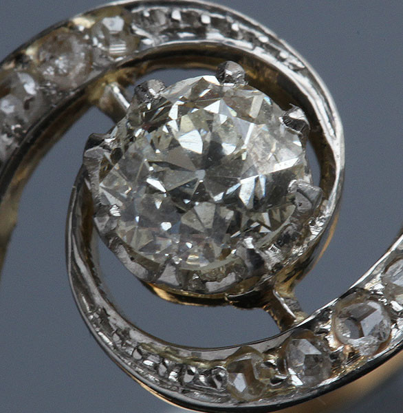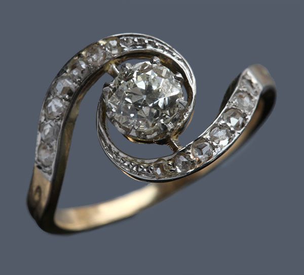 Central old cut diamond 0.65 cts approx. Shoulders set with 14 rose cut diamonds