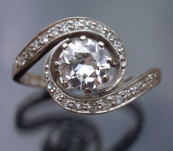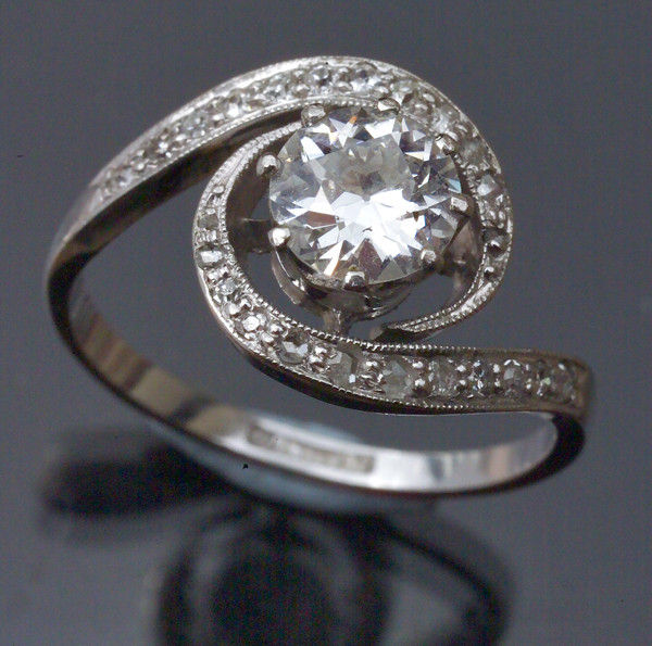 Central old cut diamond 1.0 cts approx with tiny chip to edge The shoulders with 24 diamonds 0.25 cts approx Suitable as an engagement ring