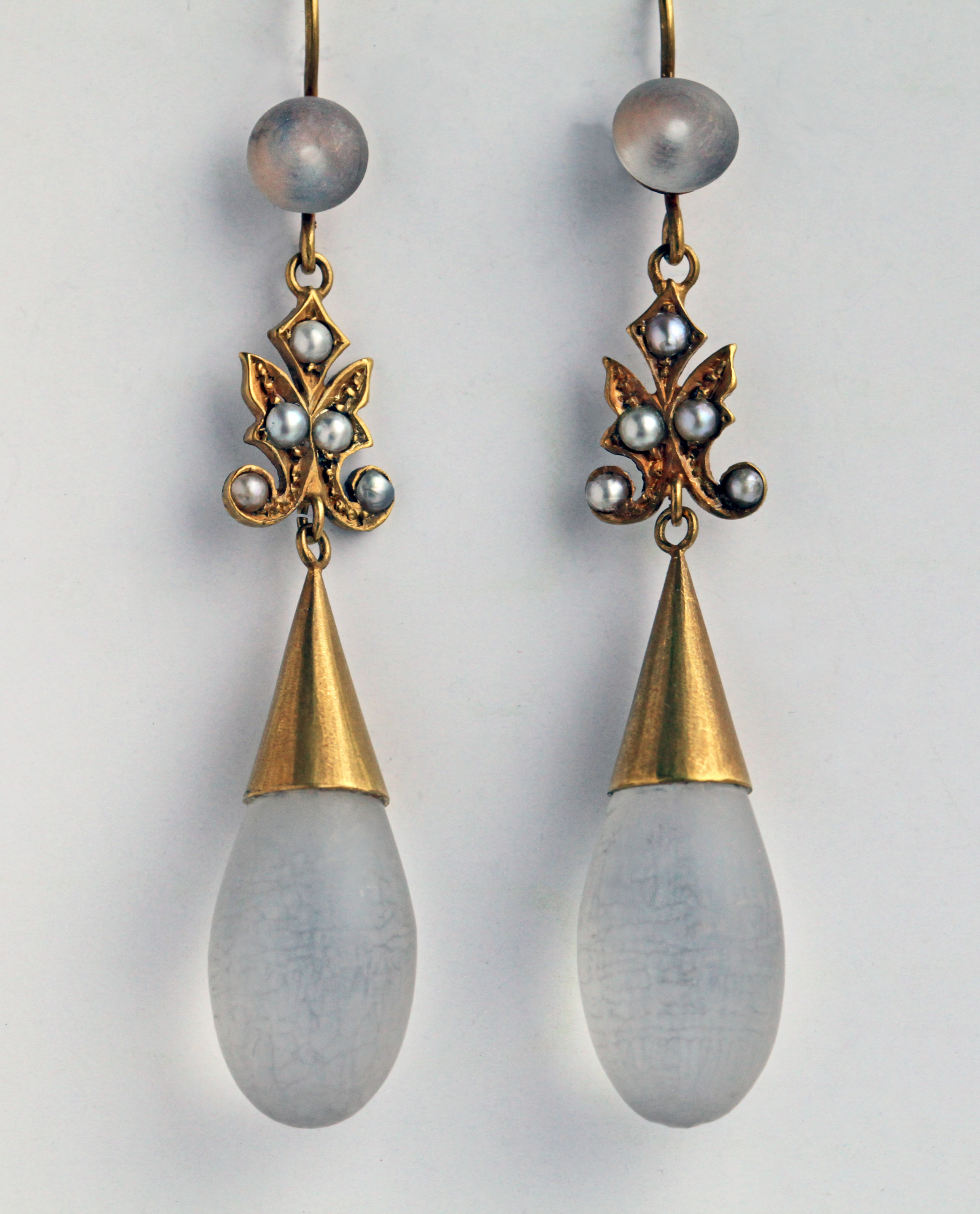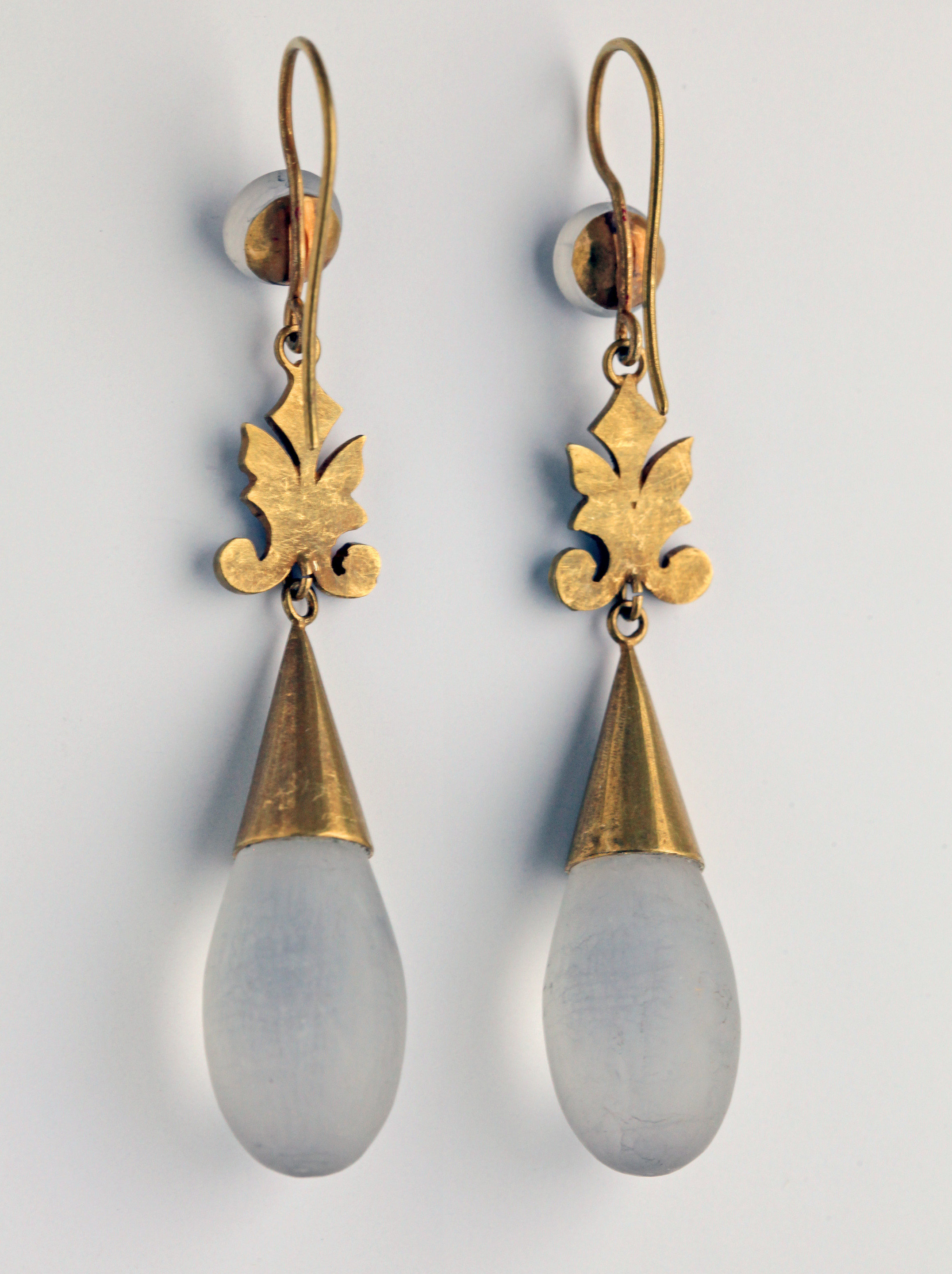 The frosted chalcedonies are a pretty colour, smooth & lovely to touch. Shepherd hooks for pierced ears. Suitable for a bride.