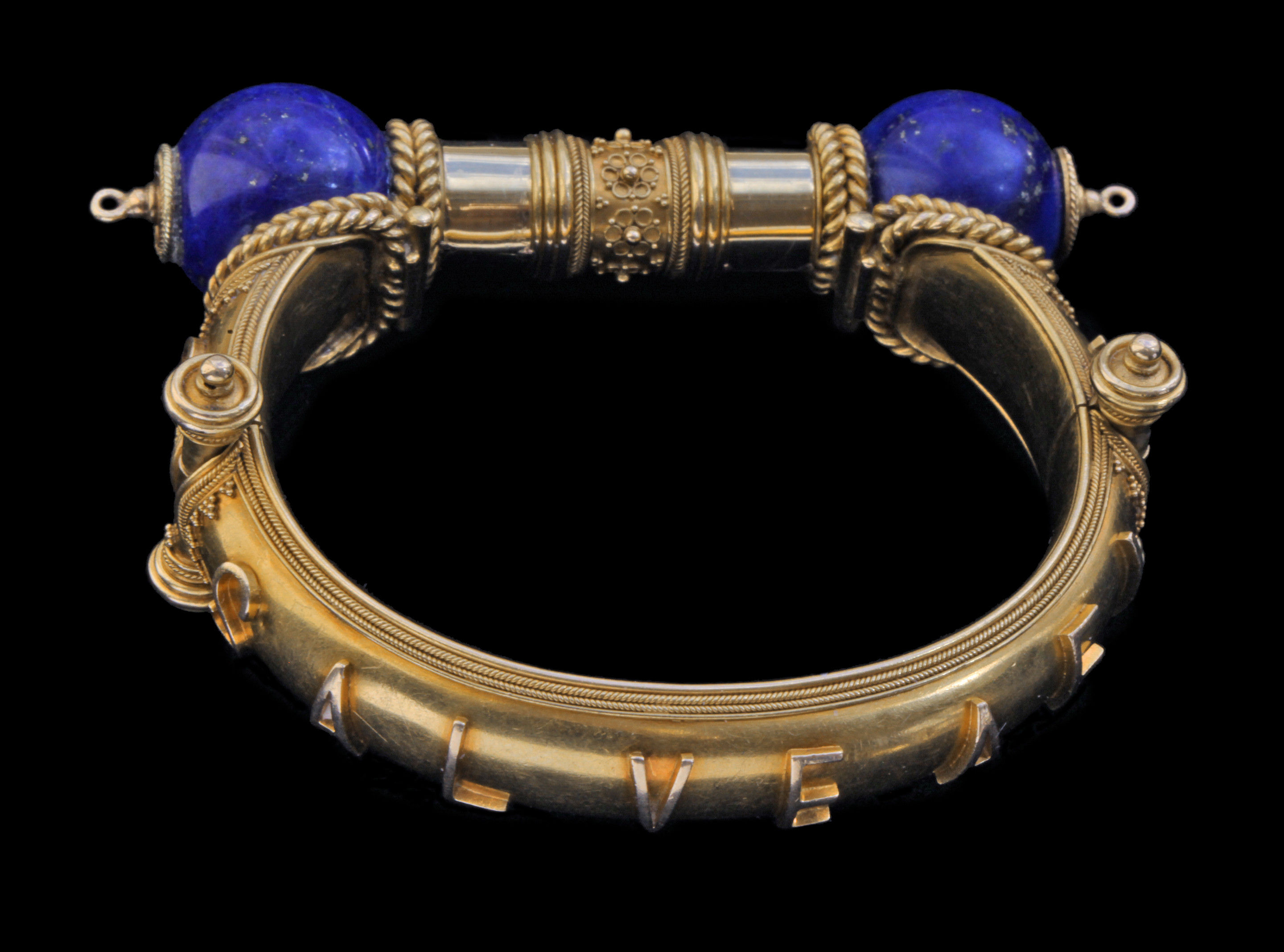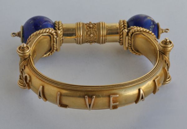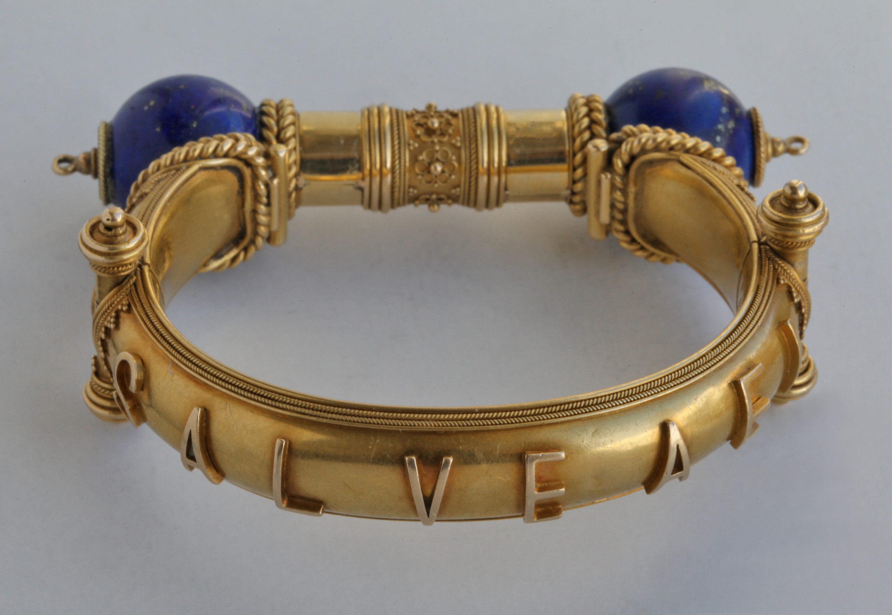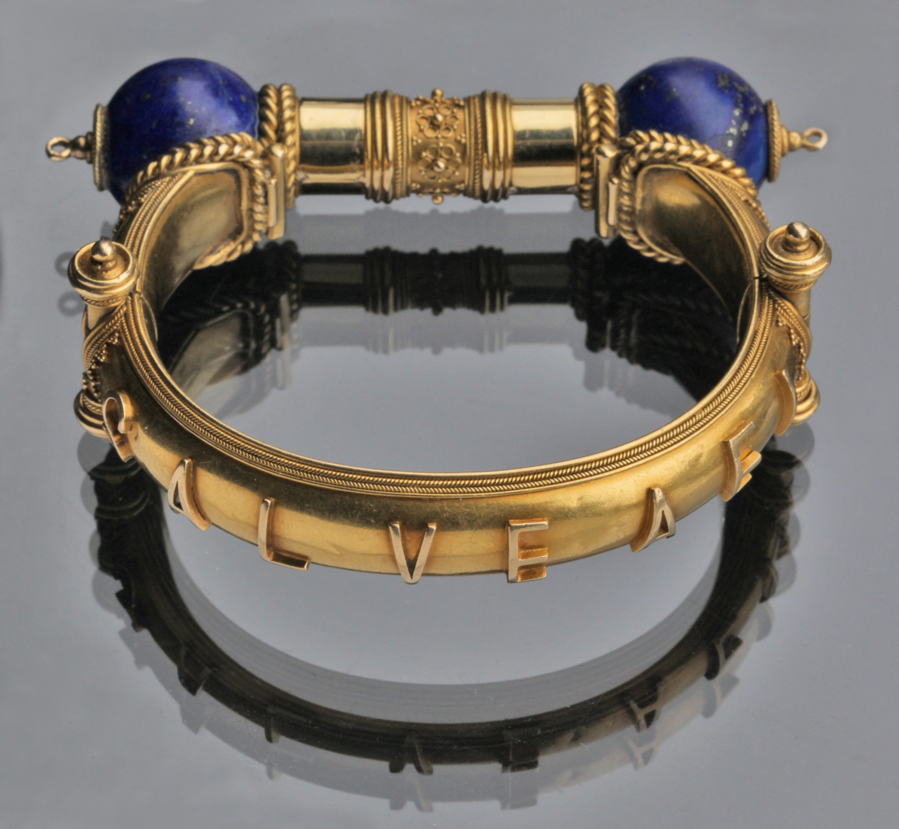 A stunning Victorian gold & lapis lazuli hinged bangle beautifully made & attributed to John Brogden. The design has stylized hinges with locking post clasp, applied scrolled wirework and bead detail. Applied lettering to the band, the classical phrase reading 'SALVE AEI' (Welcome Always) the Greek letters alpha and omega (""the beginning and the end"") on either side of the lapis orbs.