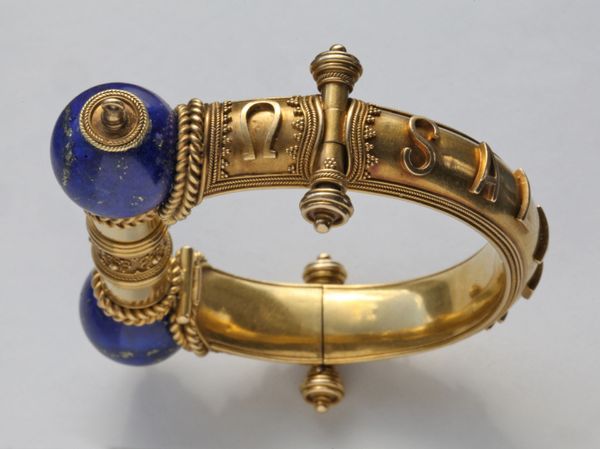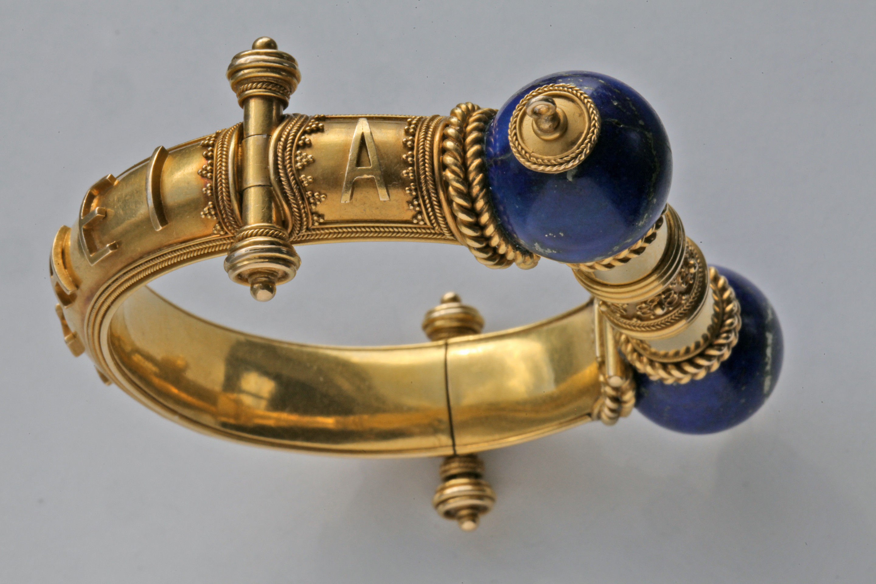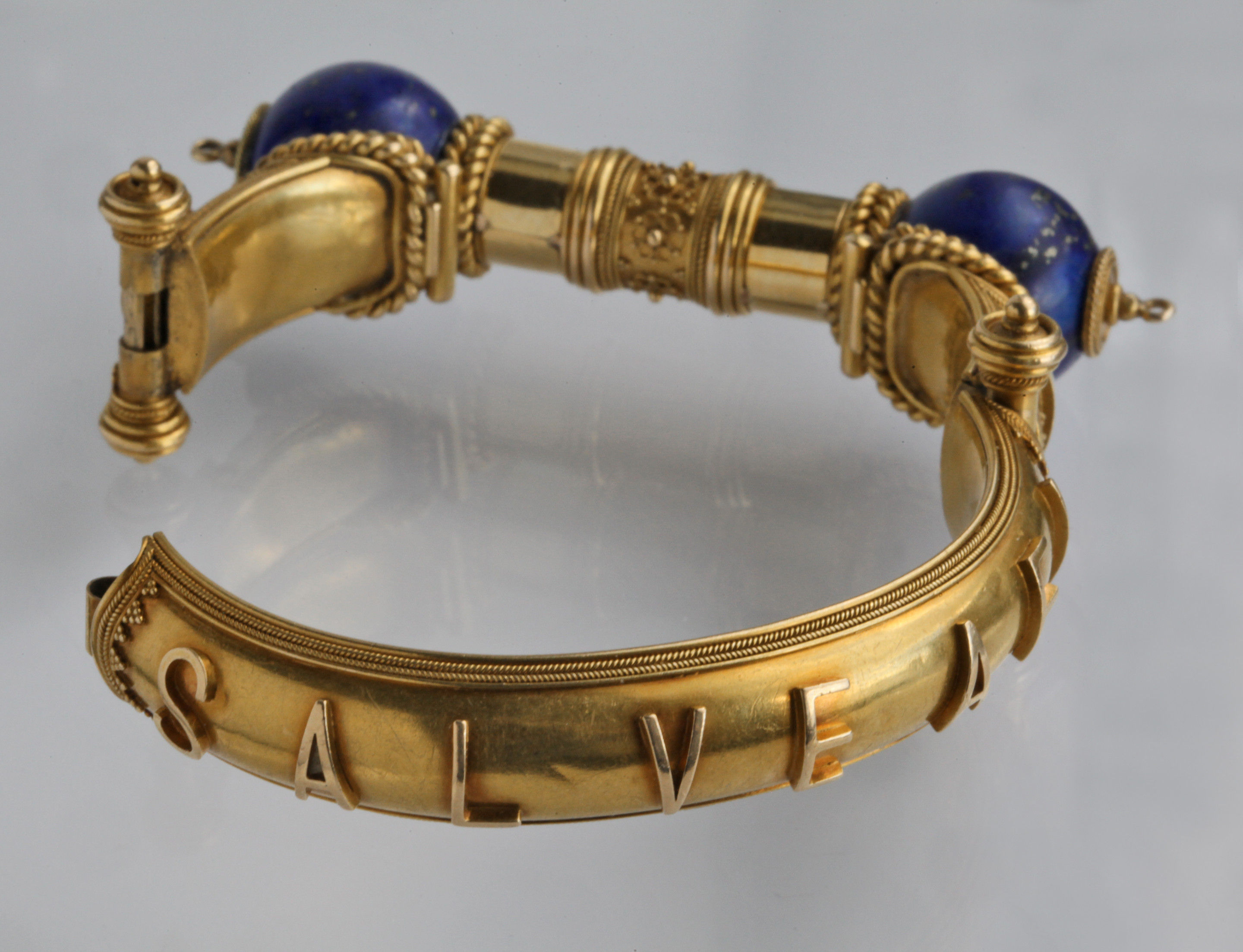 A stunning Victorian gold & lapis lazuli hinged bangle beautifully made & attributed to John Brogden. The design has stylized hinges with locking post clasp, applied scrolled wirework and bead detail. Applied lettering to the band, the classical phrase reading 'SALVE AEI' (Welcome Always) the Greek letters alpha and omega (""the beginning and the end"") on either side of the lapis orbs.