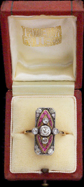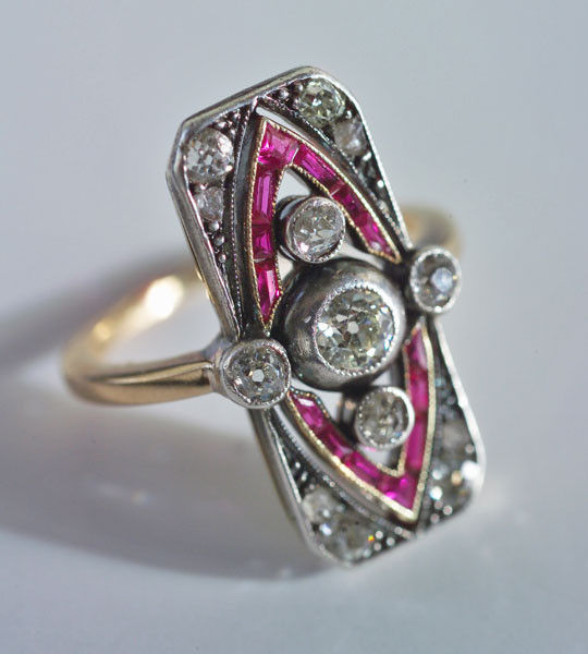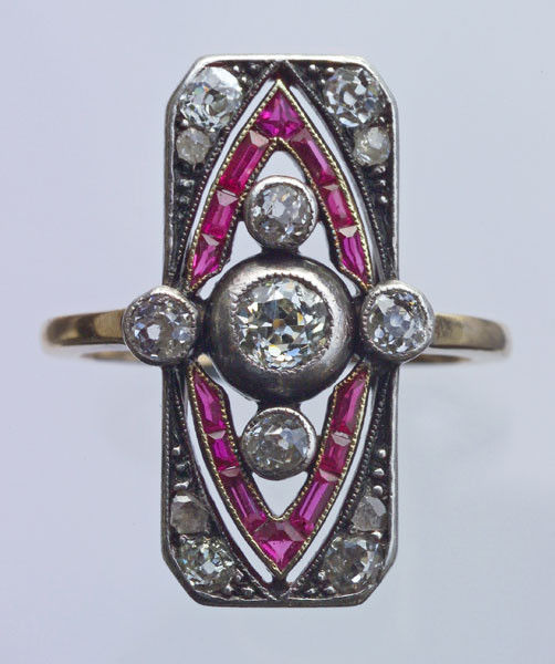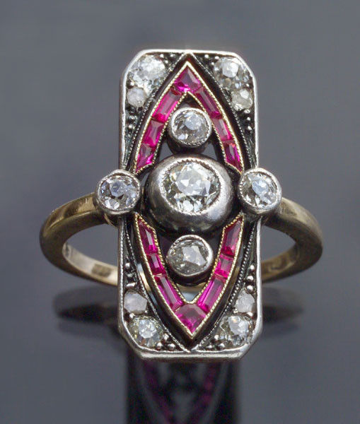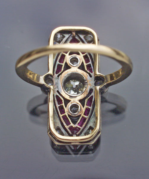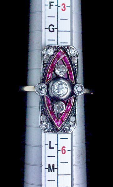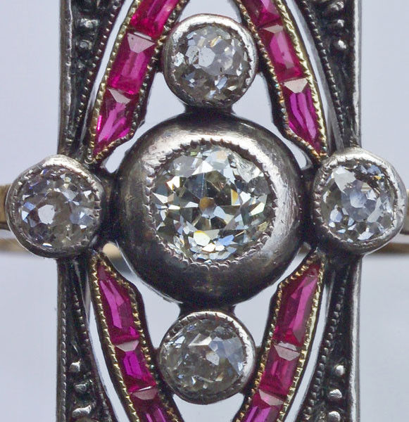 Central old cut diamond 0.20 cts approx 14 chanel set rubies 0.25 cts approx. Surrounding 4 Vicorian cut diamonds 0.20 cts approx & 4 rose cut diamonds